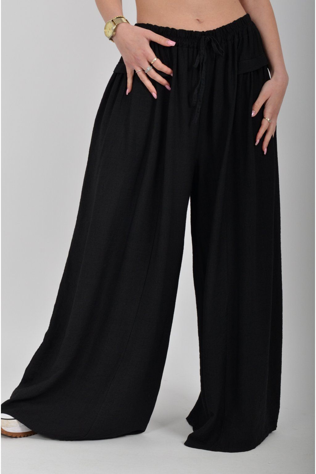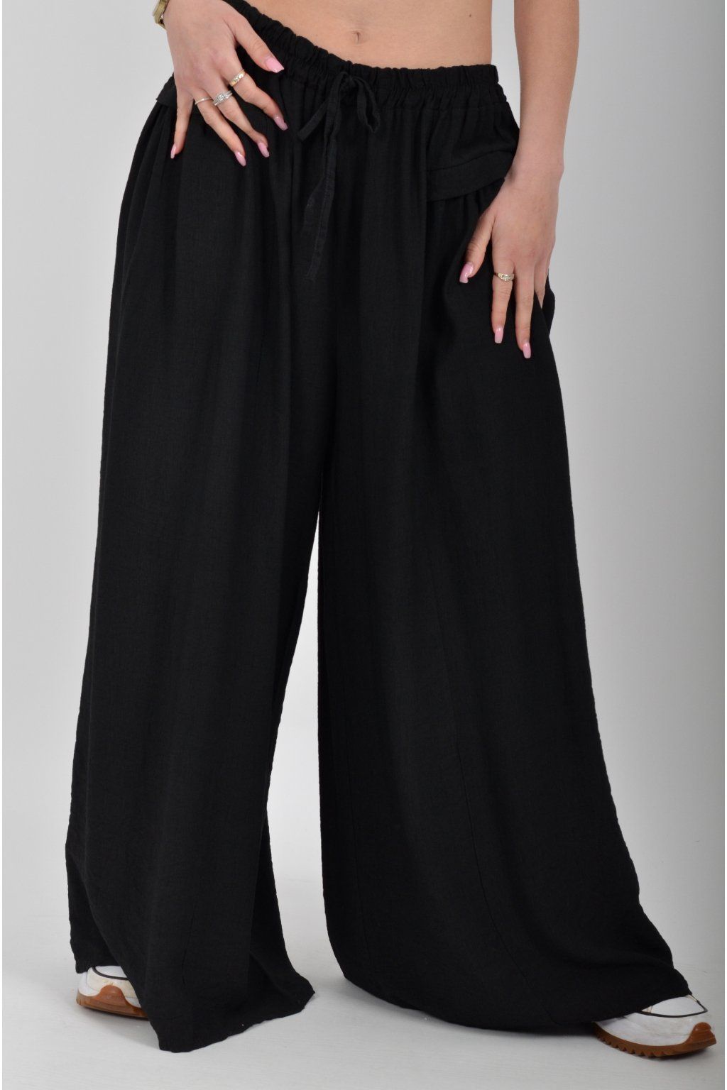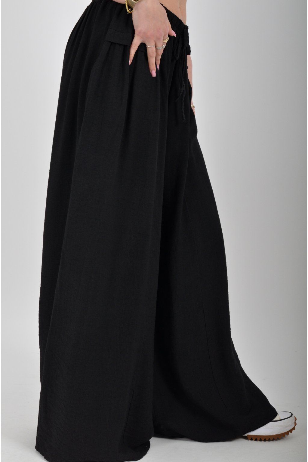 Kalhoty se širokými nohavicemi a kapsami na bocích, které se krásně přizpůsobí postavě, díky zapracované gumě v pase. Jsou vhodné pro každodenní nošení. Šňůrka, v přední části je "falešná" (nejde pomocí ní kalhoty stáhnout v pase)