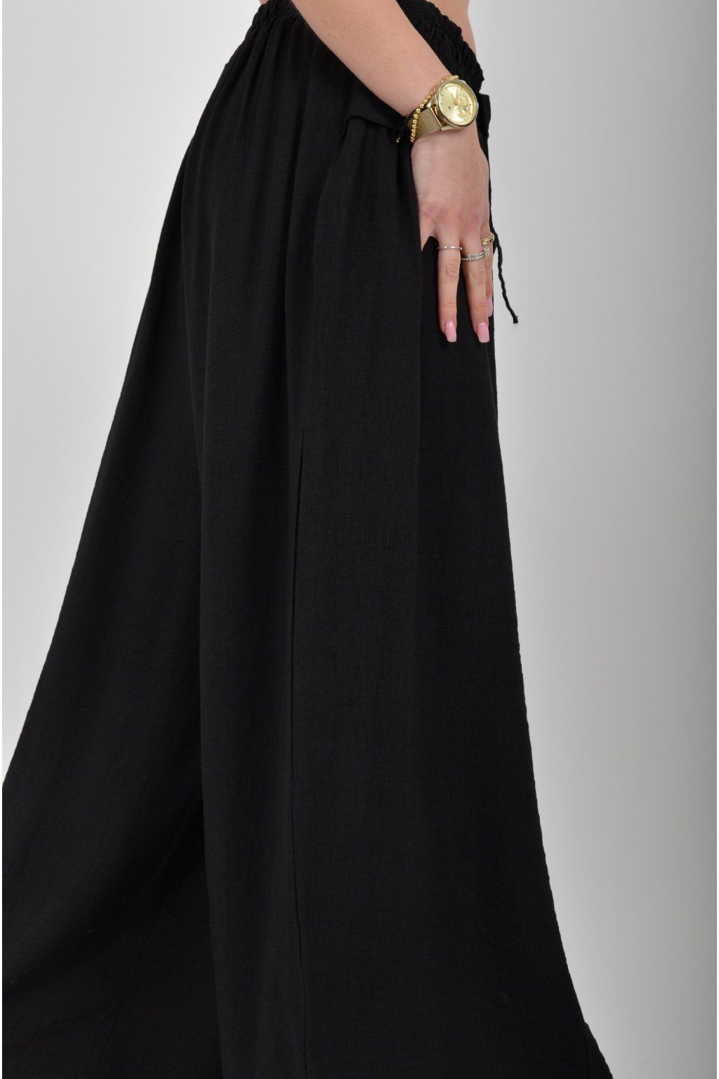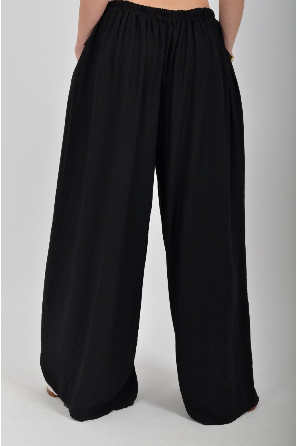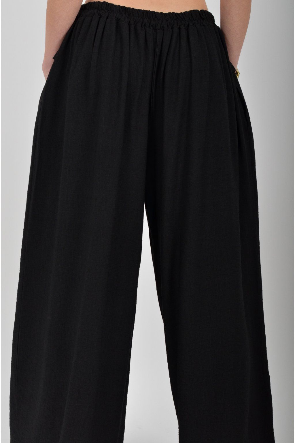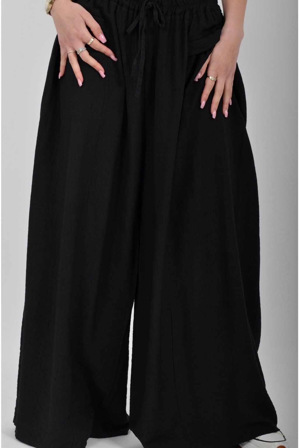 Kalhoty se širokými nohavicemi a kapsami na bocích, které se krásně přizpůsobí postavě, díky zapracované gumě v pase. Jsou vhodné pro každodenní nošení. Šňůrka, v přední části je "falešná" (nejde pomocí ní kalhoty stáhnout v pase)