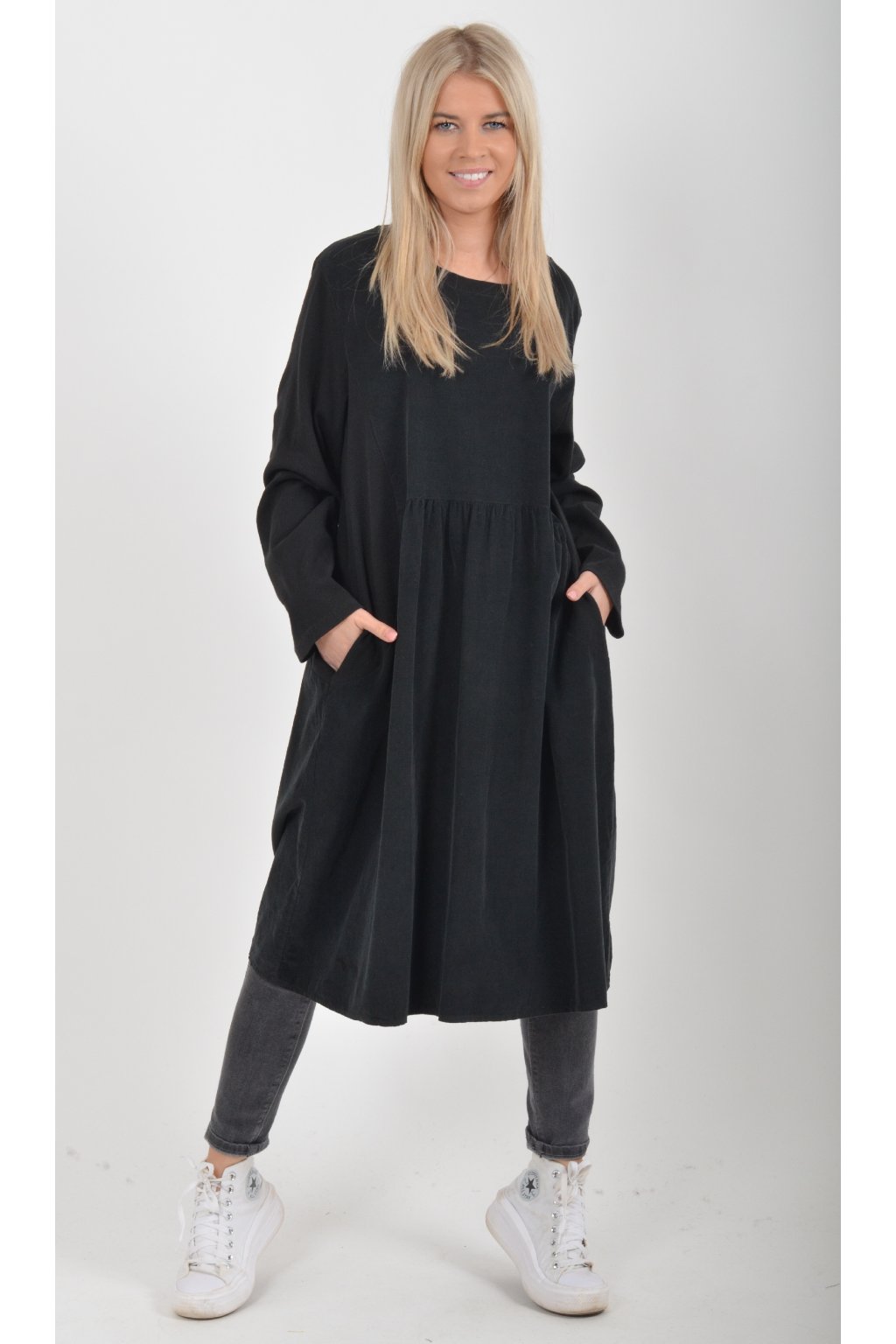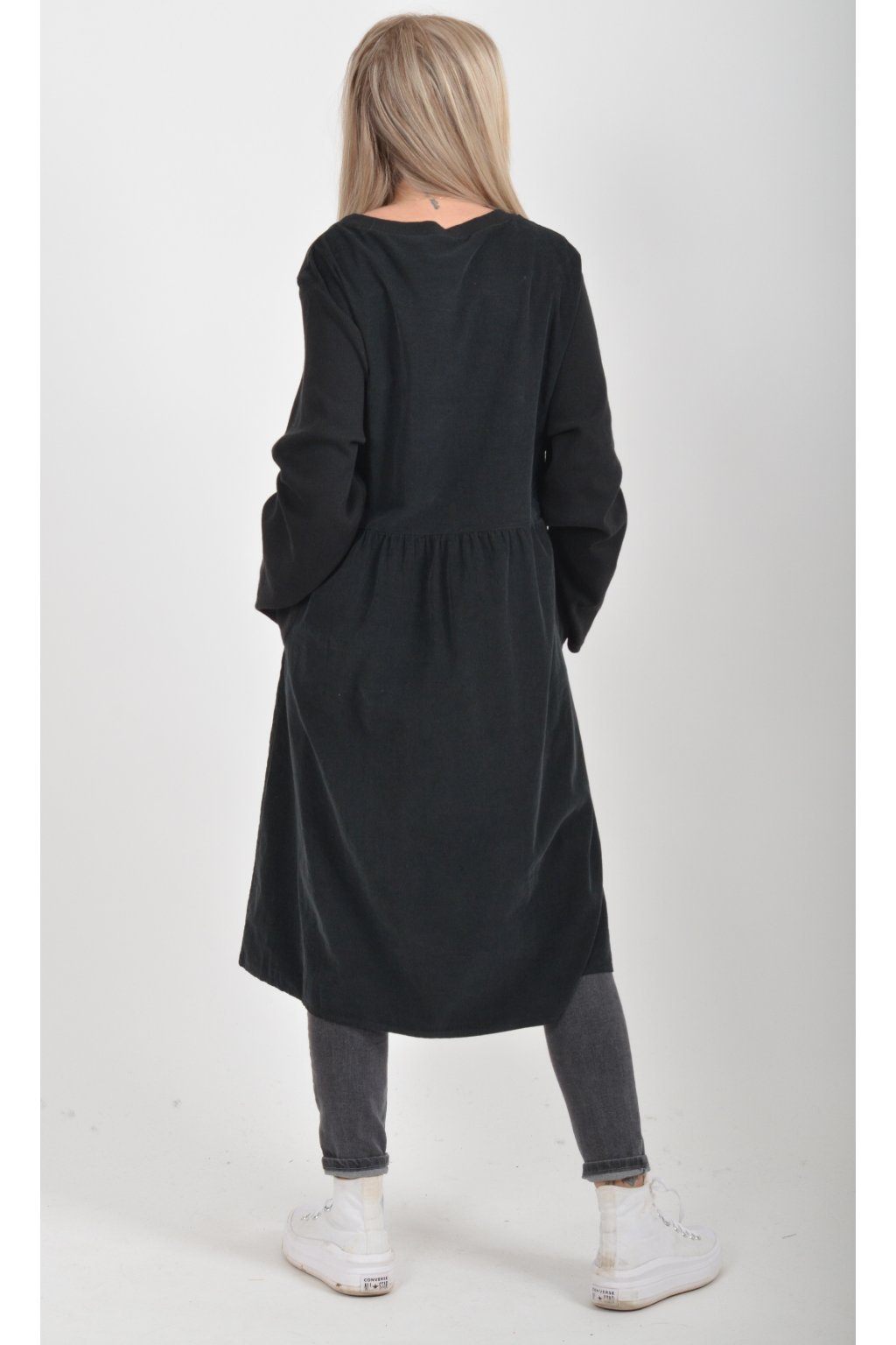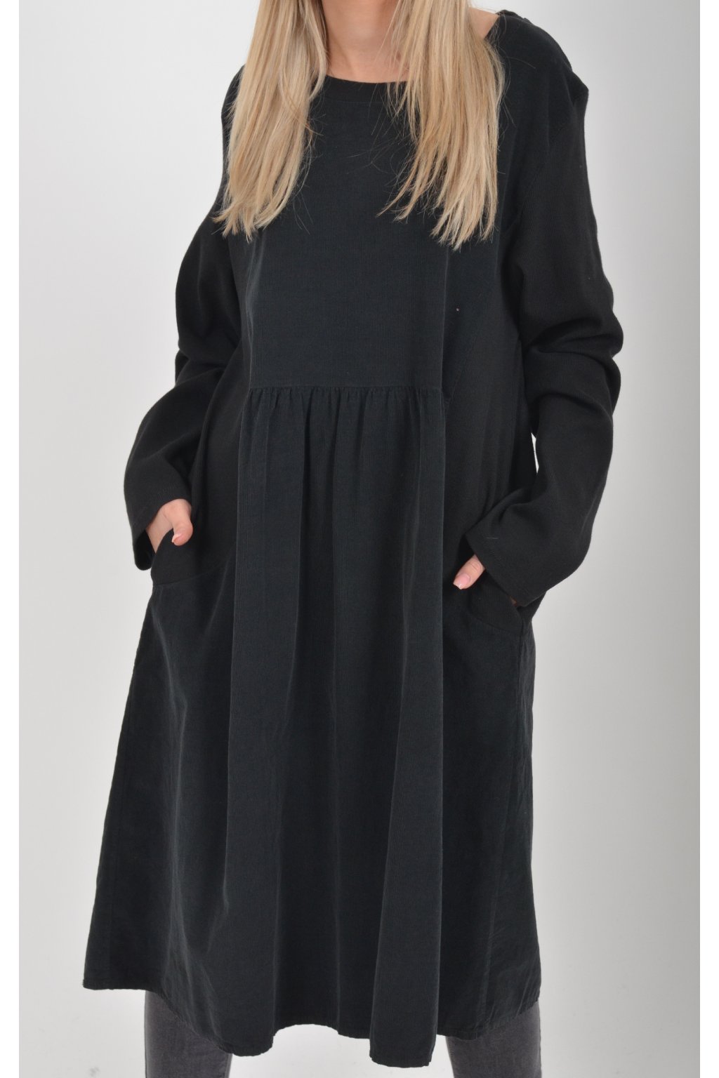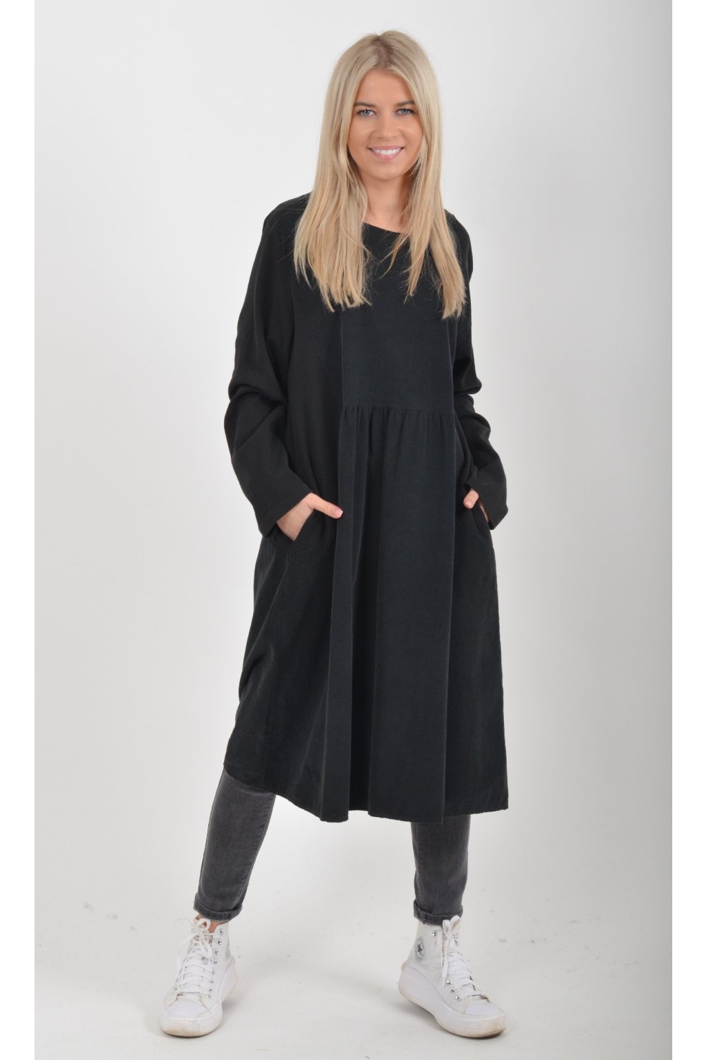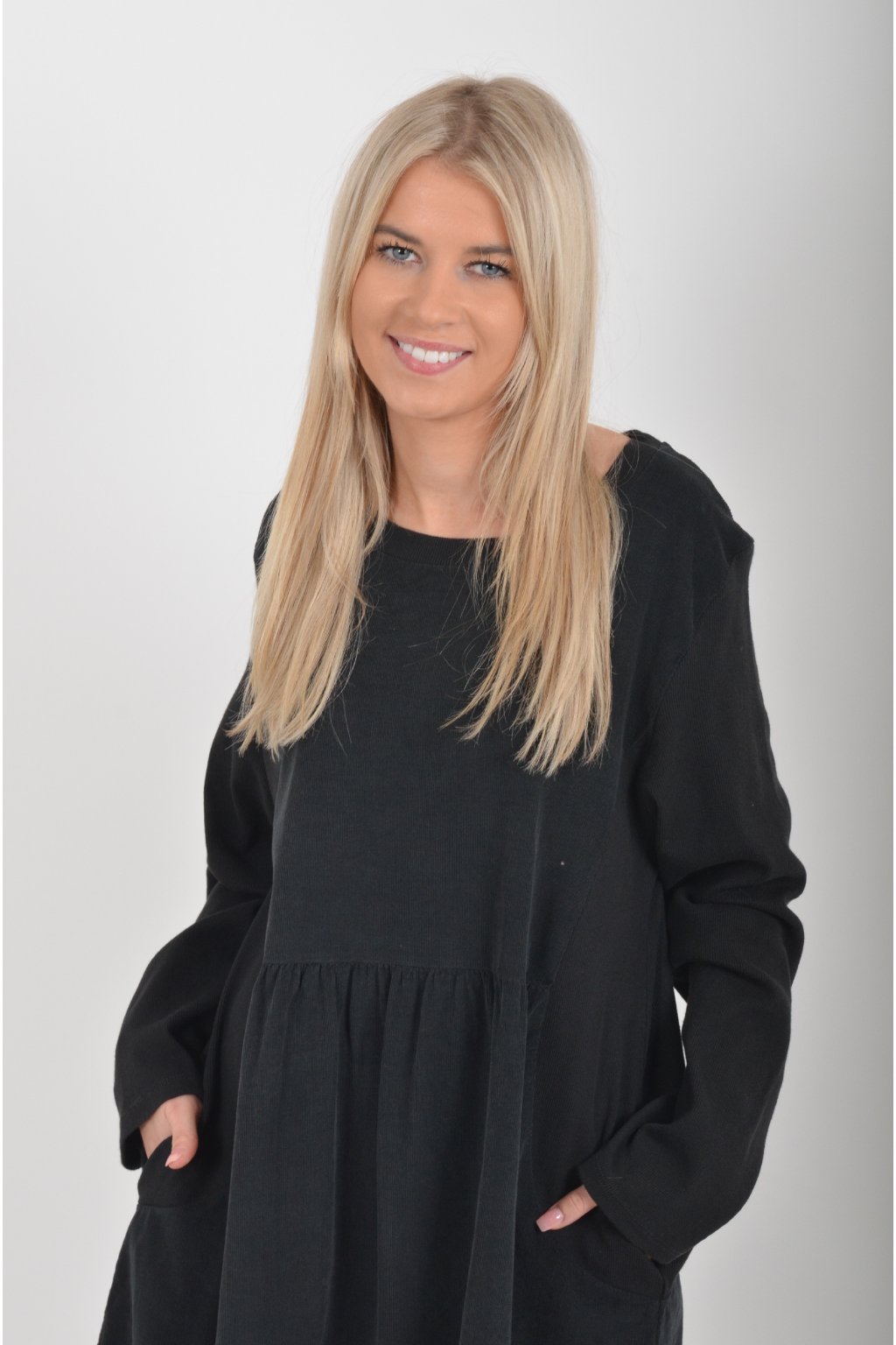 Jednobarevné manšestrové šaty s dlouhým rukávem a kapsami na bocích. Šaty jsou vyrobeny z velice příjemného a kvalitního materiálu. Jsou vhodné pro každodenní nošení a mají áčkový střih.