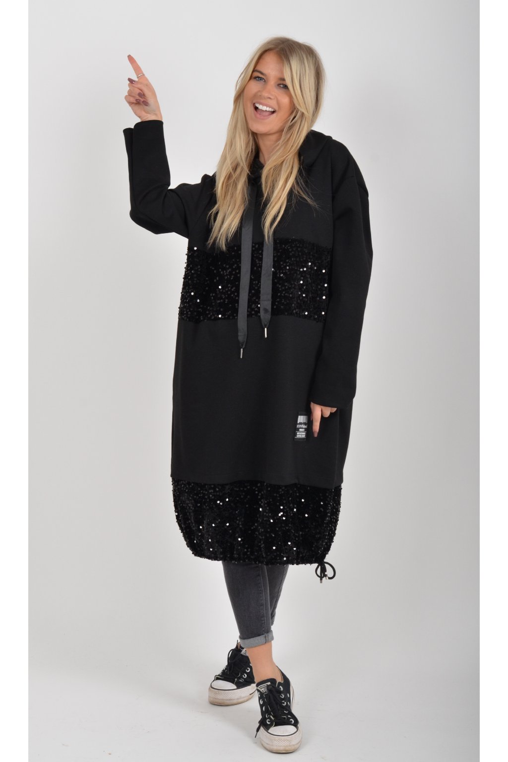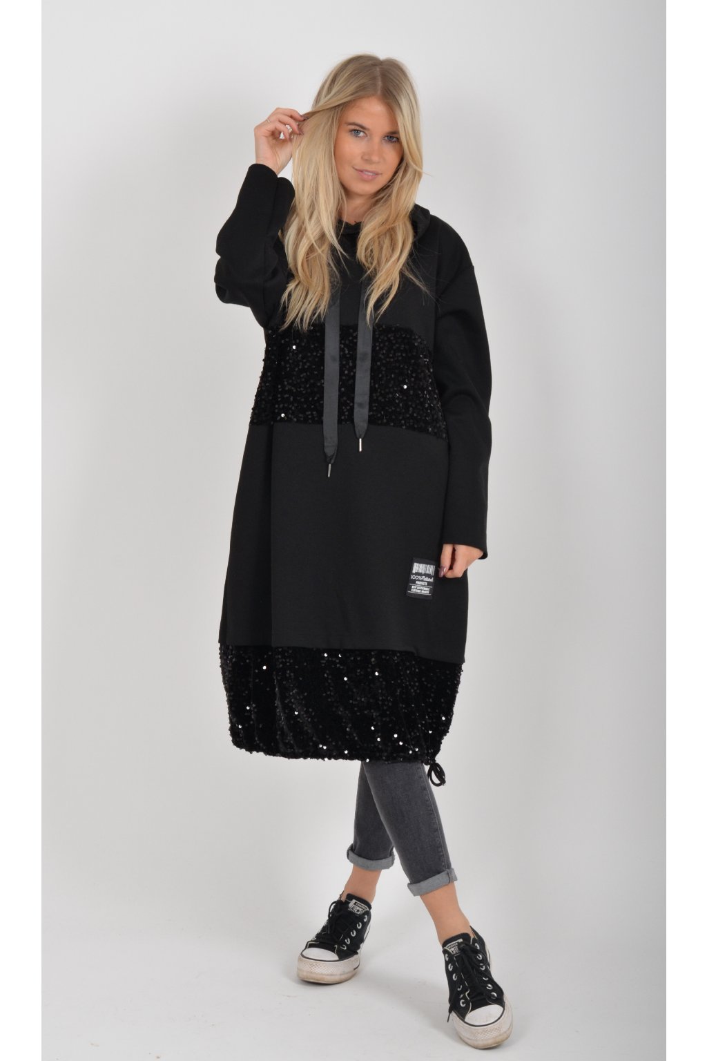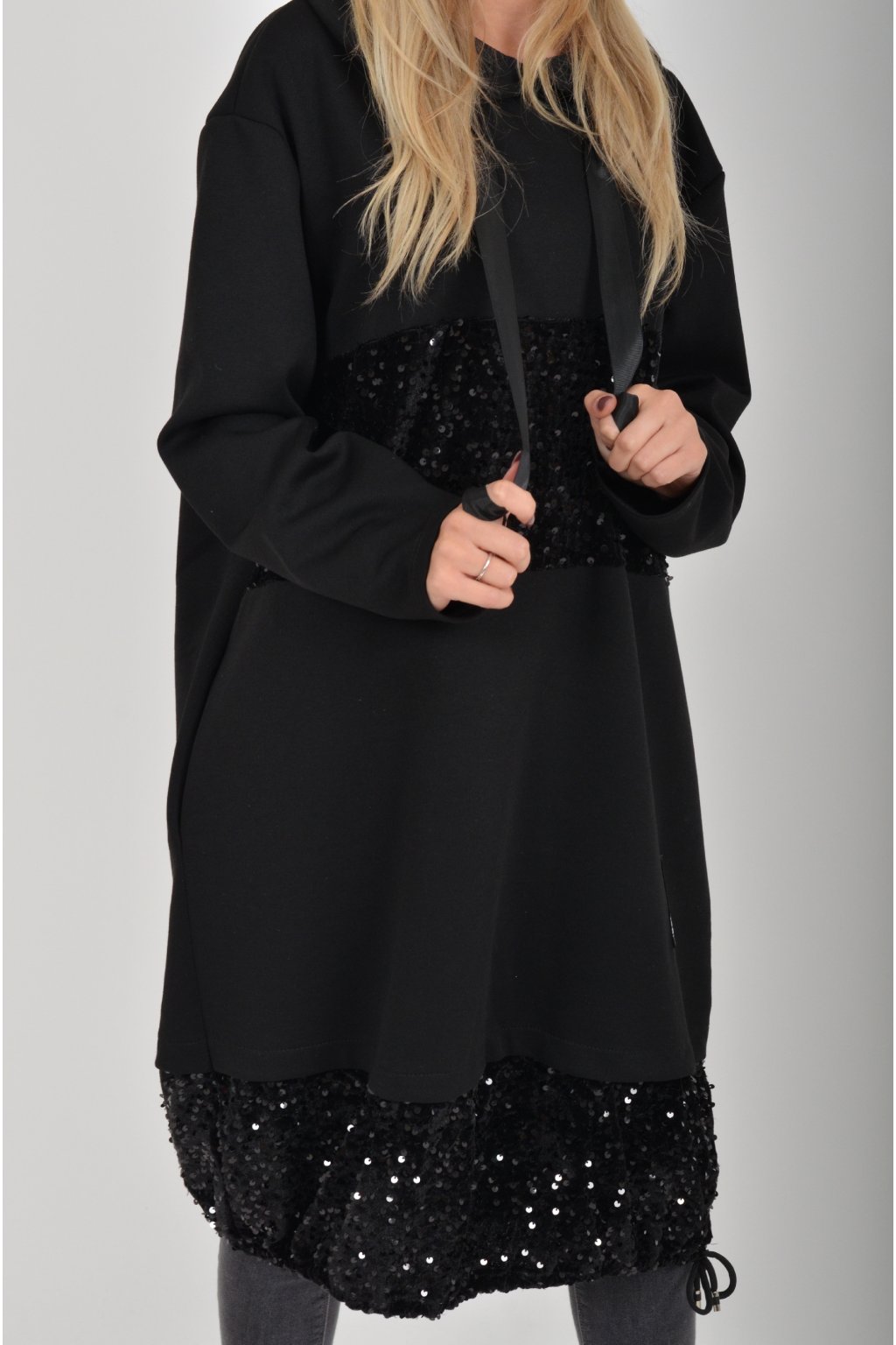 Mikinové šaty s kapucí zdobené flitry. Mají áčkový střih, dlouhý rukáv a na bocích kapsy. Ve spodní části mají zapracovanou tkaničku pro libovolné stažení. Jsou vyrobené z velice příjemného a lehce zatepleného materiálu.