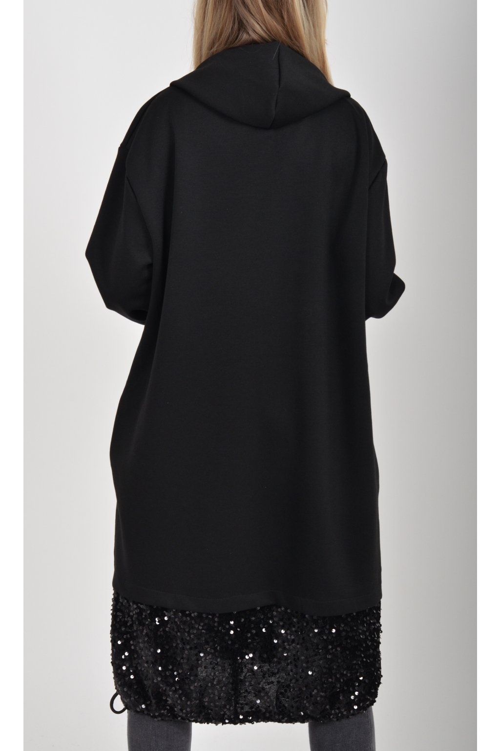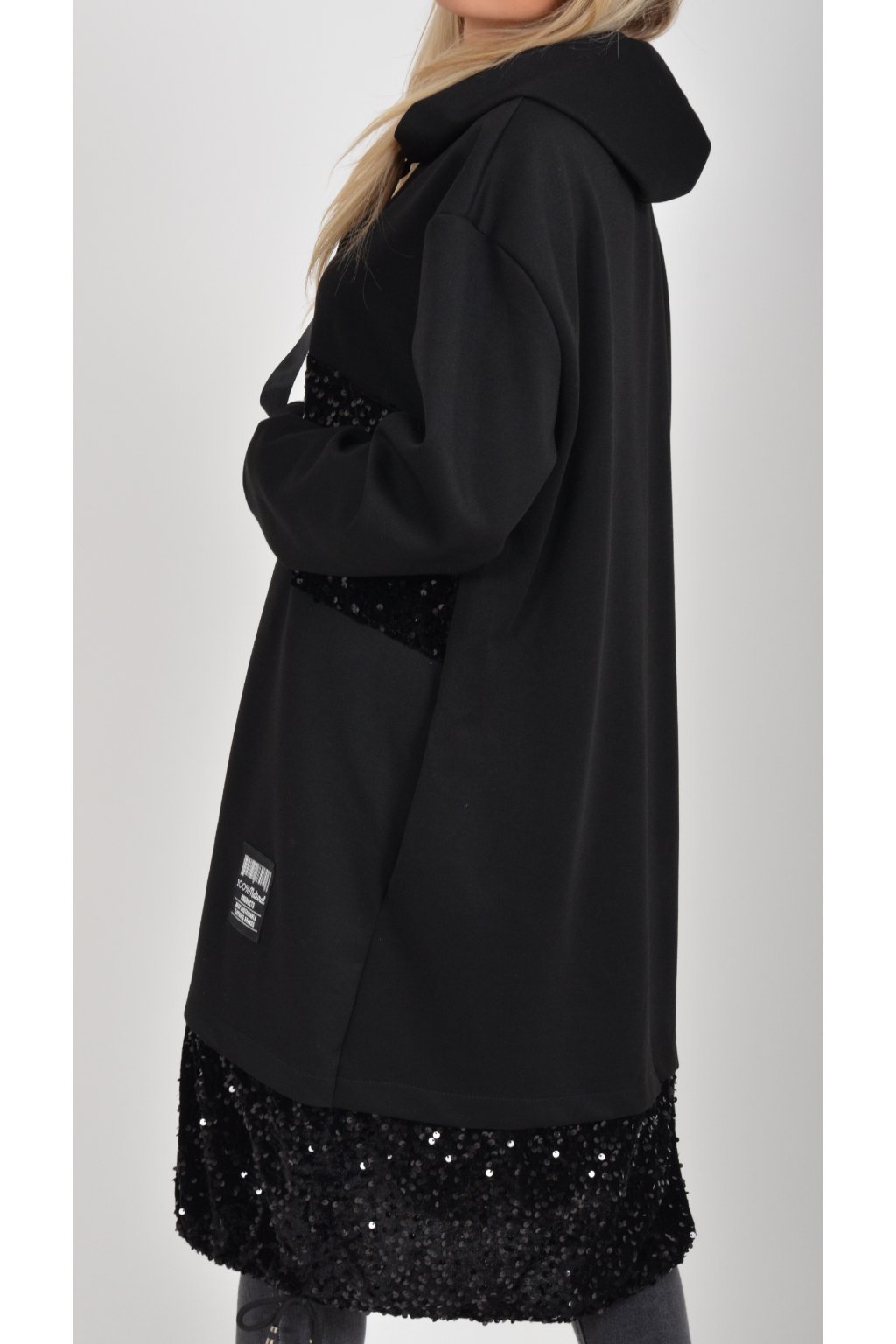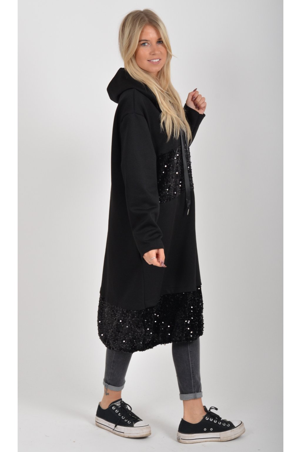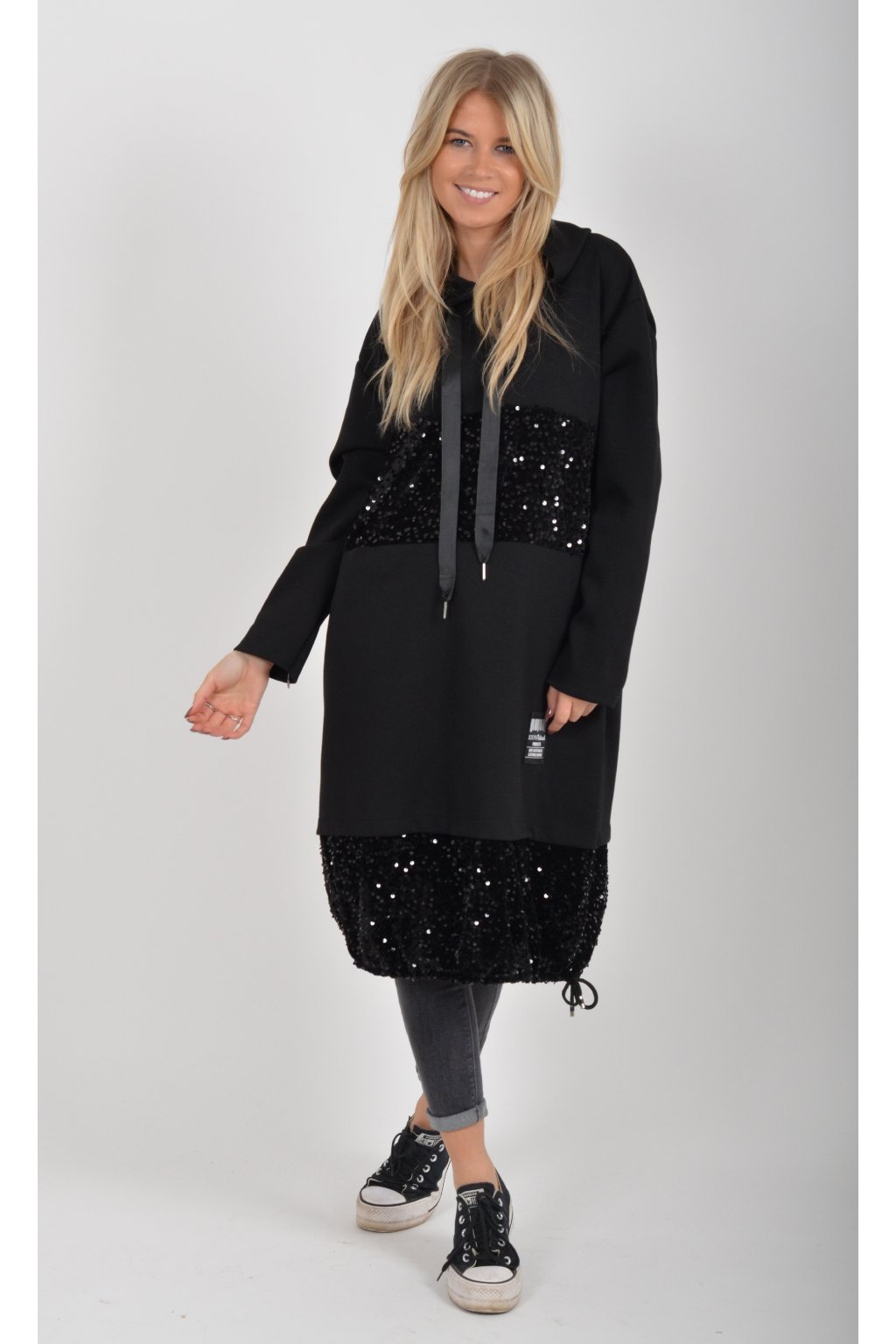 Mikinové šaty s kapucí zdobené flitry. Mají áčkový střih, dlouhý rukáv a na bocích kapsy. Ve spodní části mají zapracovanou tkaničku pro libovolné stažení. Jsou vyrobené z velice příjemného a lehce zatepleného materiálu.