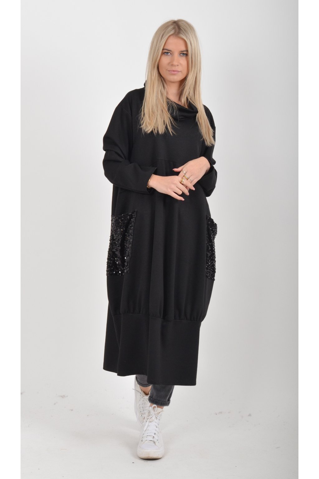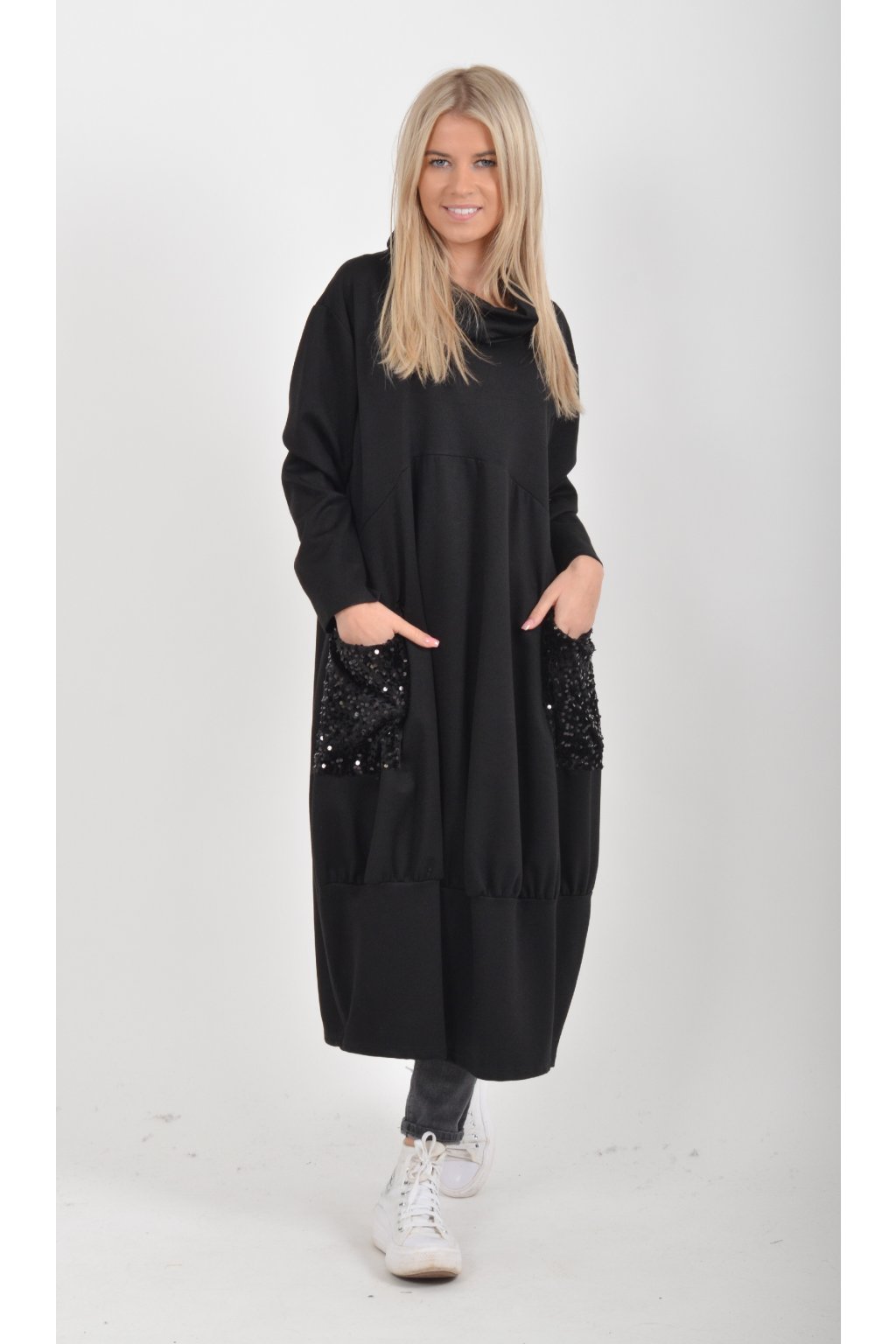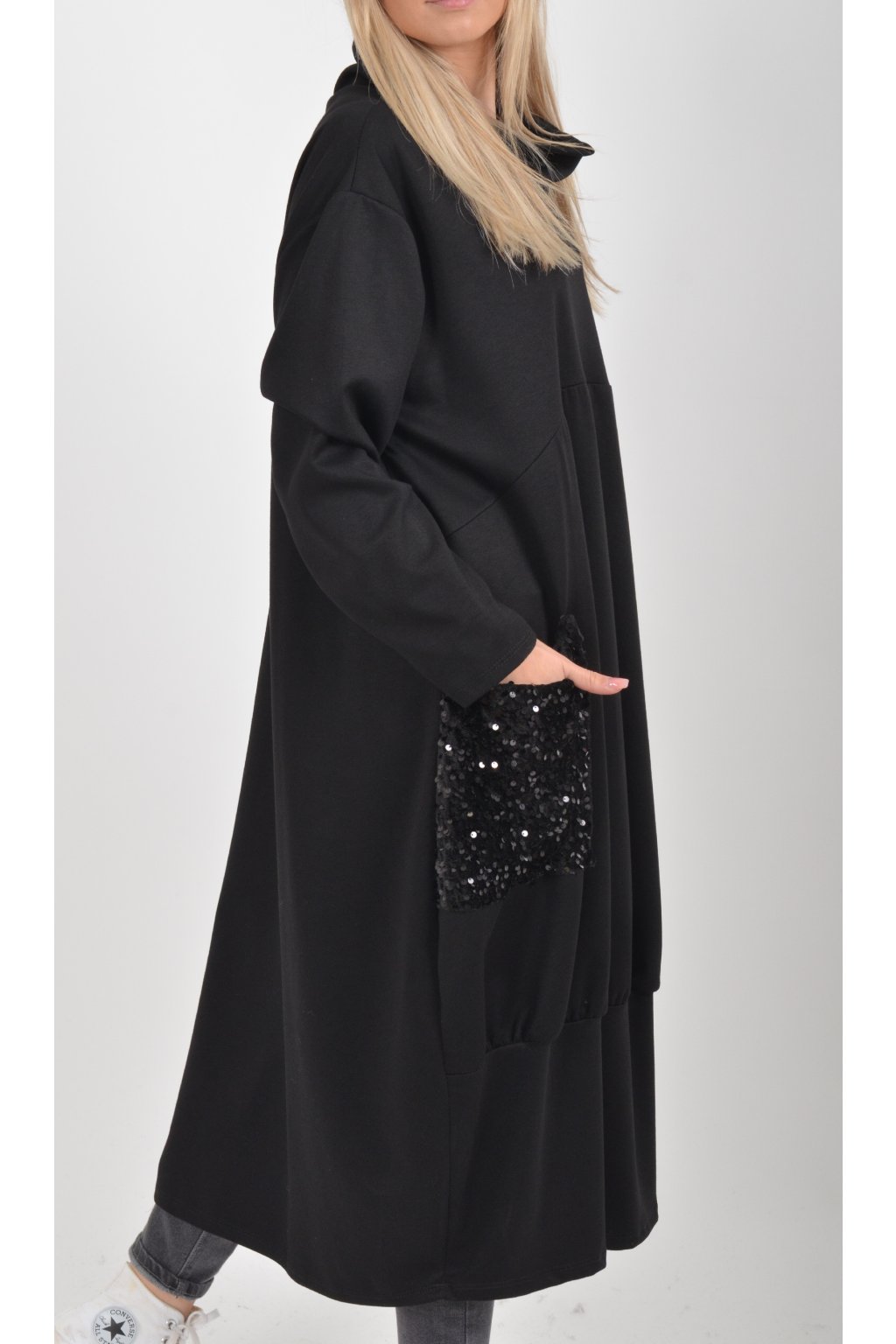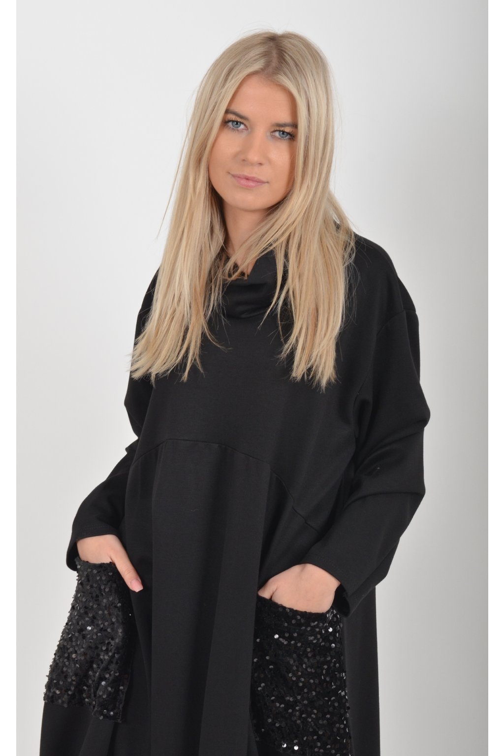 Mikinové šaty zdobené flitry. Mají áčkový střih, dlouhý rukáv a v přední části mají kapsy. Jsou vyrobené z velice příjemného a lehce zatepleného materiálu.