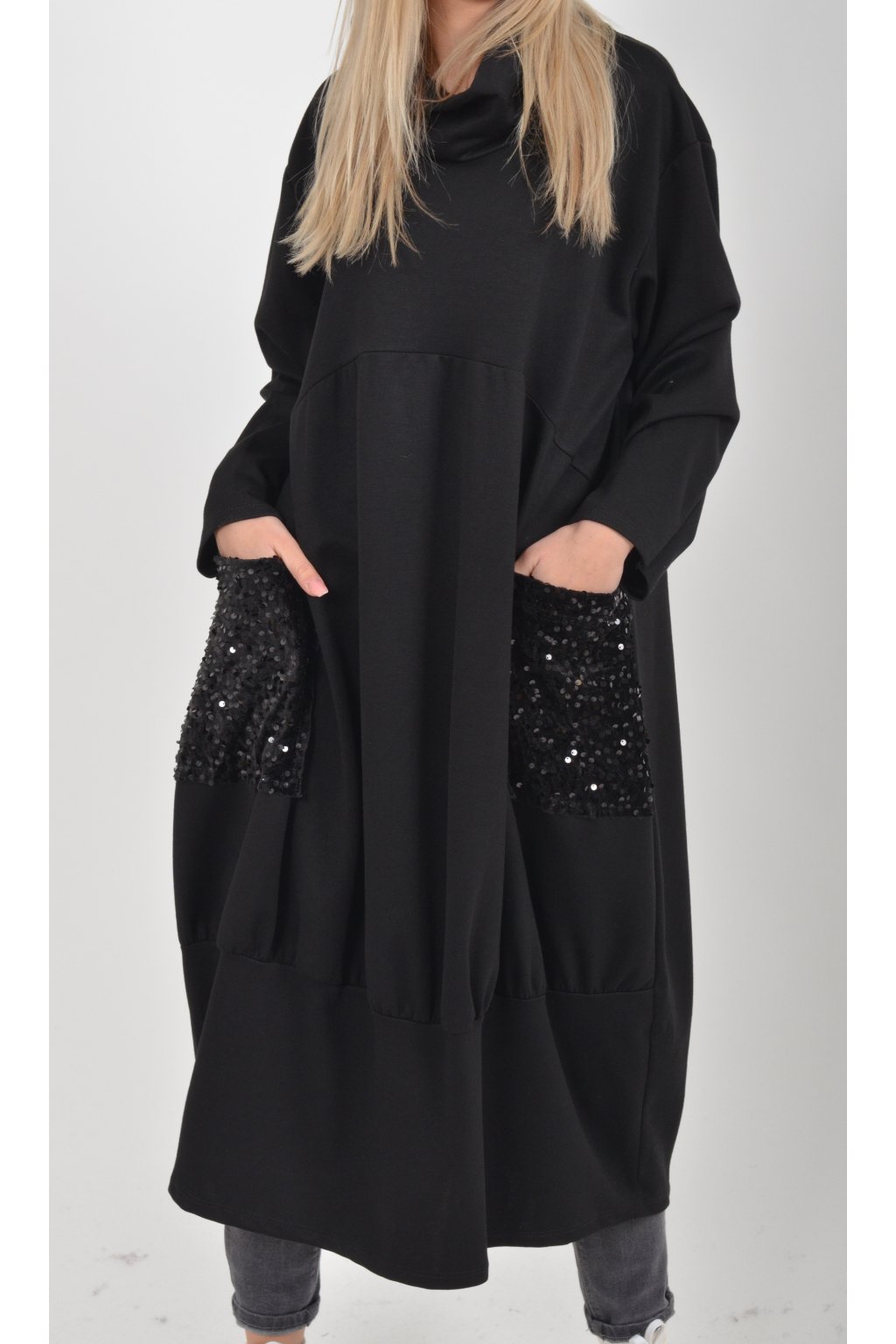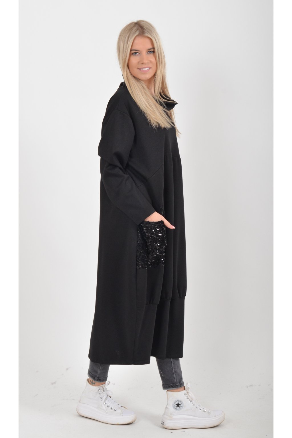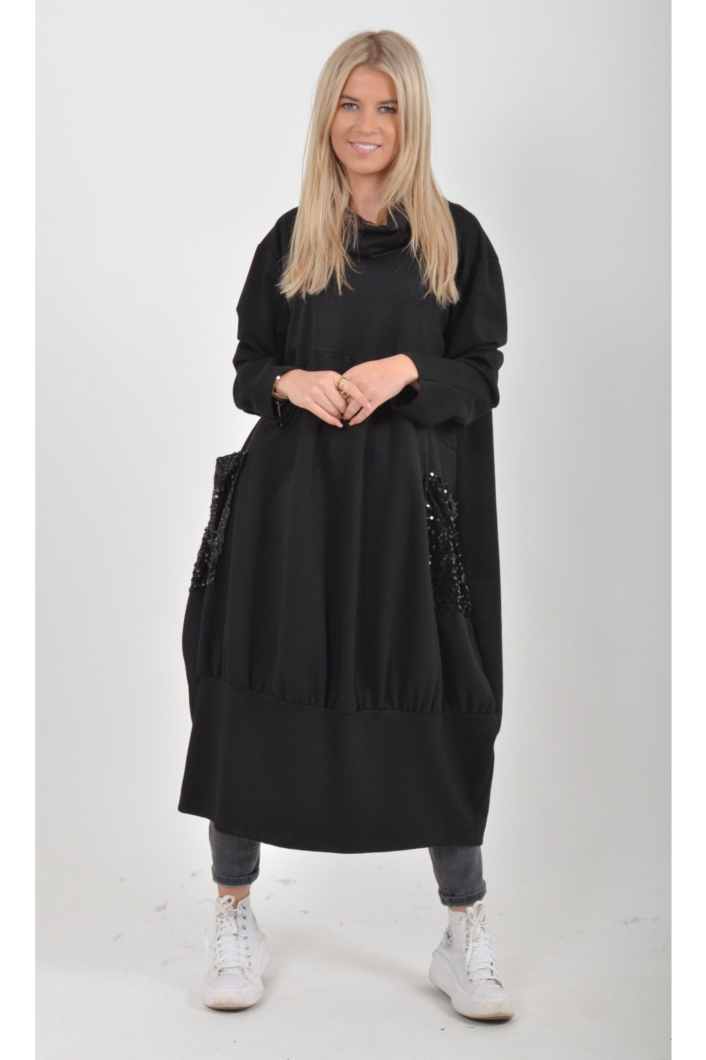 Mikinové šaty zdobené flitry. Mají áčkový střih, dlouhý rukáv a v přední části mají kapsy. Jsou vyrobené z velice příjemného a lehce zatepleného materiálu.