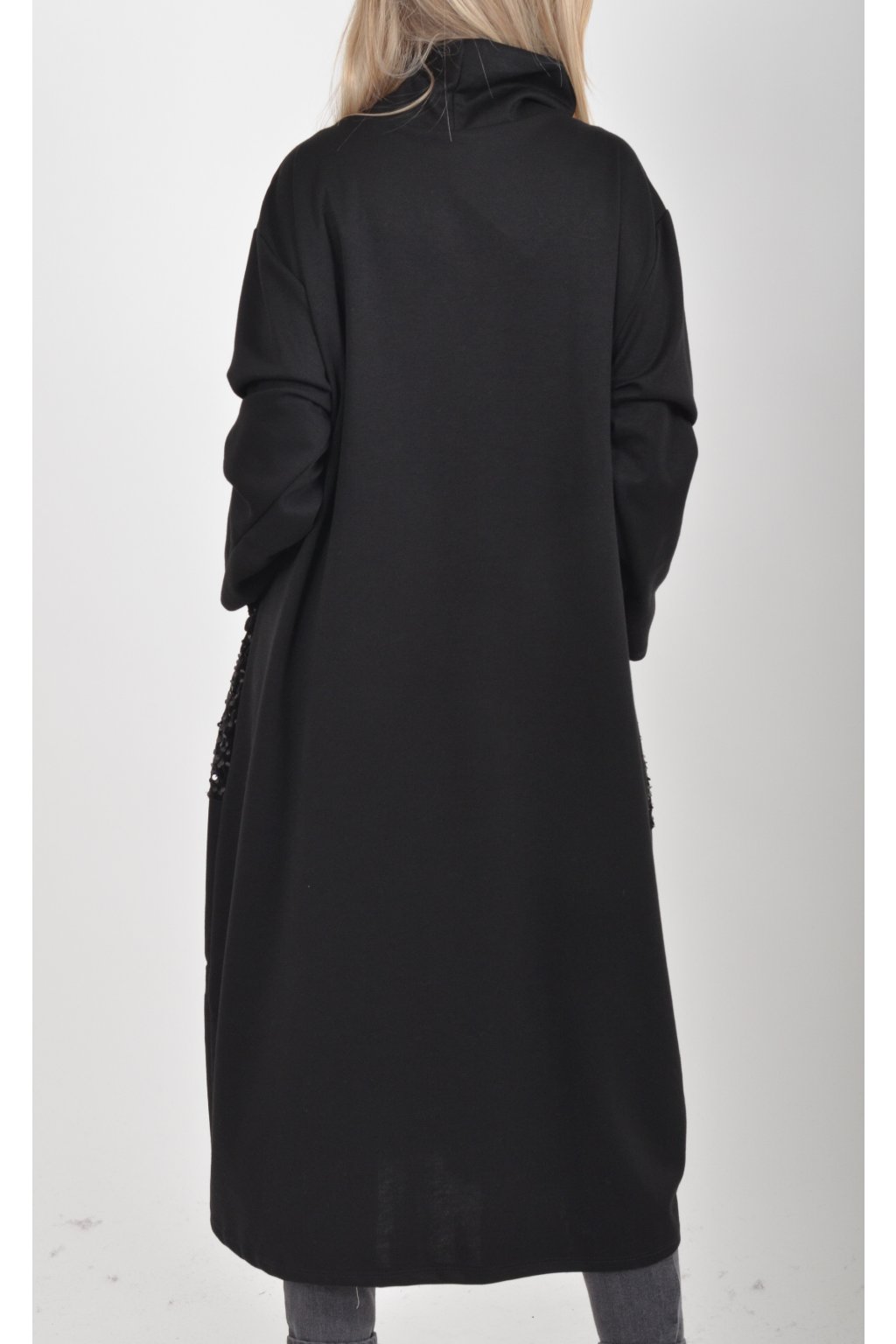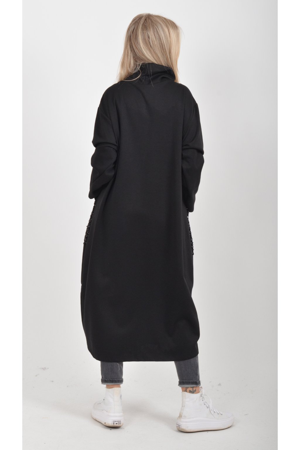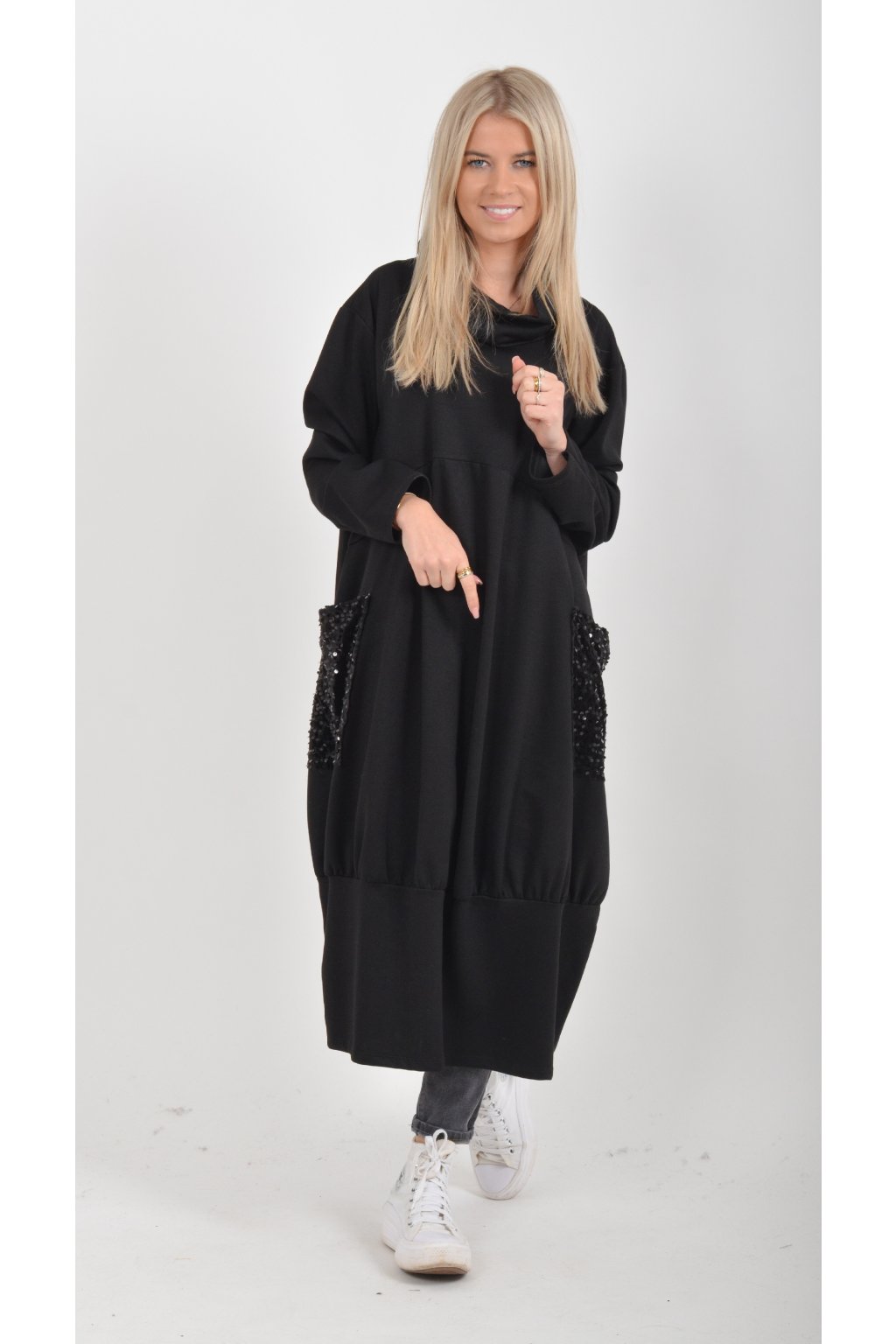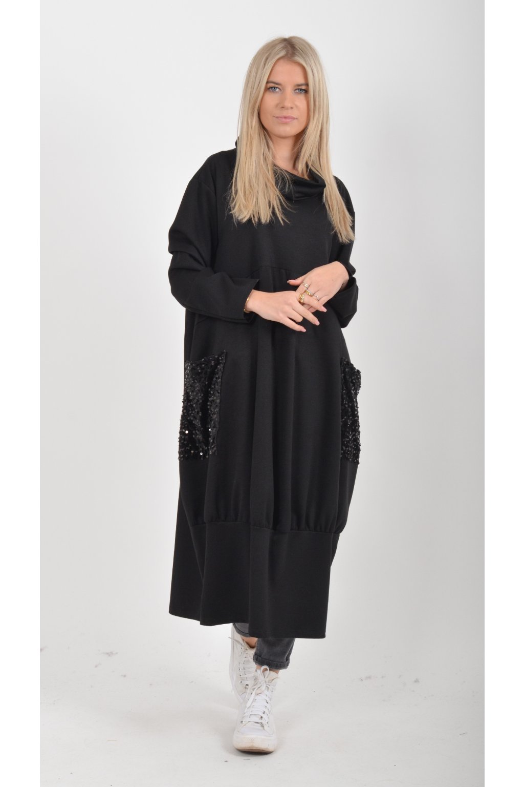 Mikinové šaty zdobené flitry. Mají áčkový střih, dlouhý rukáv a v přední části mají kapsy. Jsou vyrobené z velice příjemného a lehce zatepleného materiálu.
