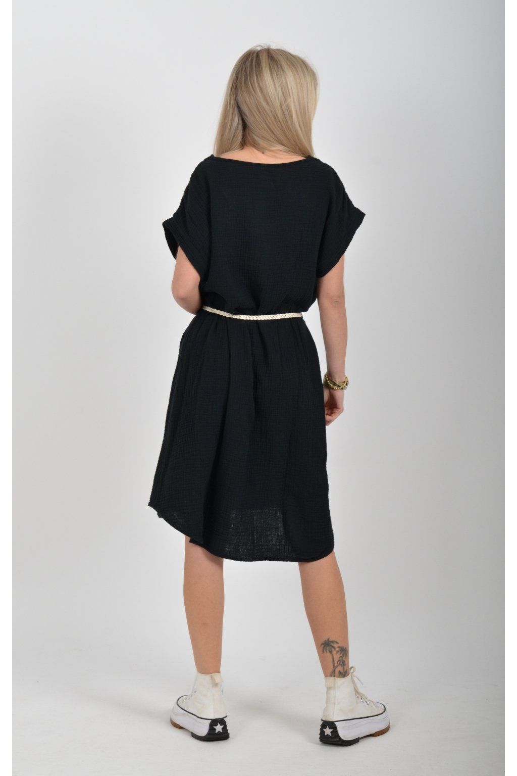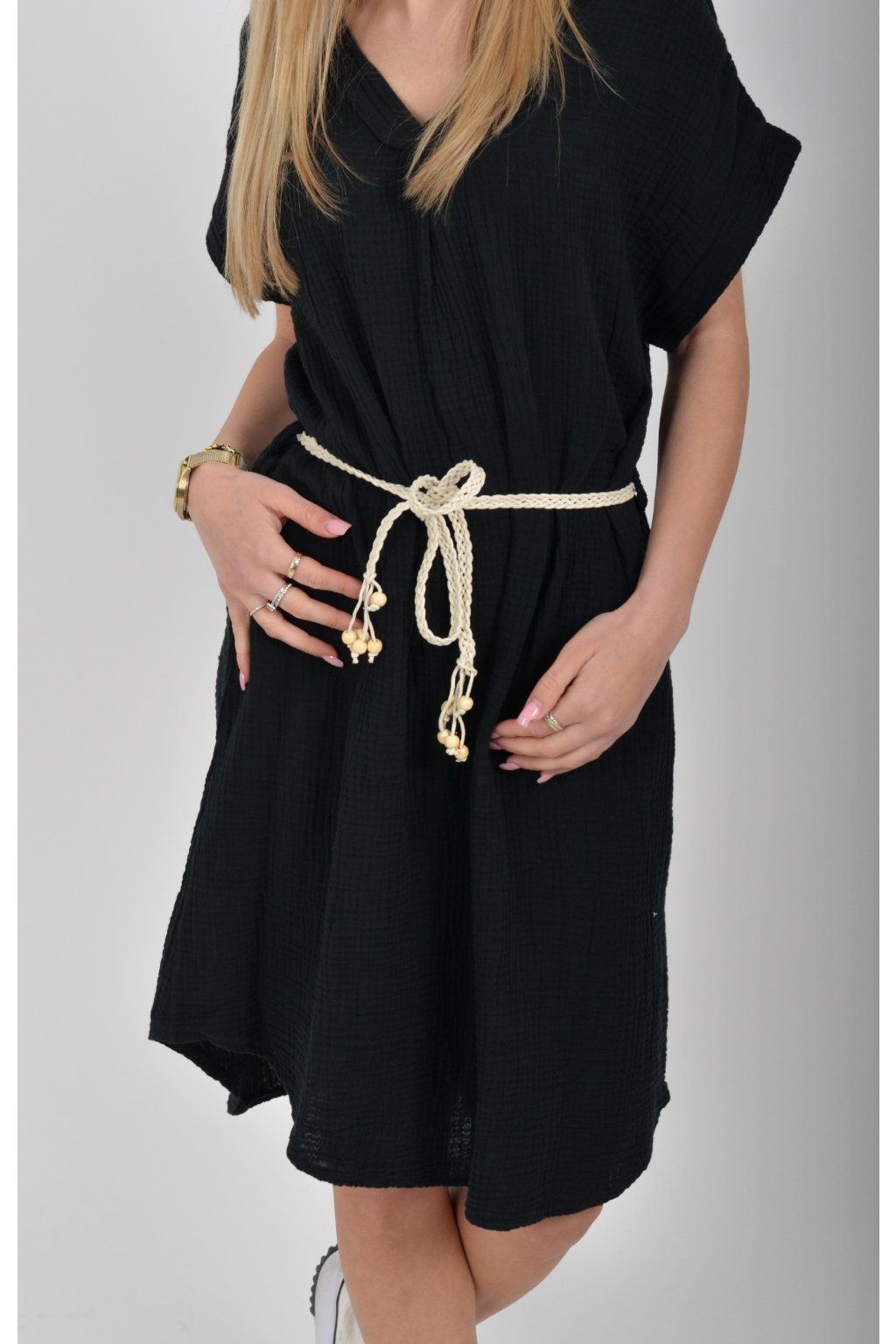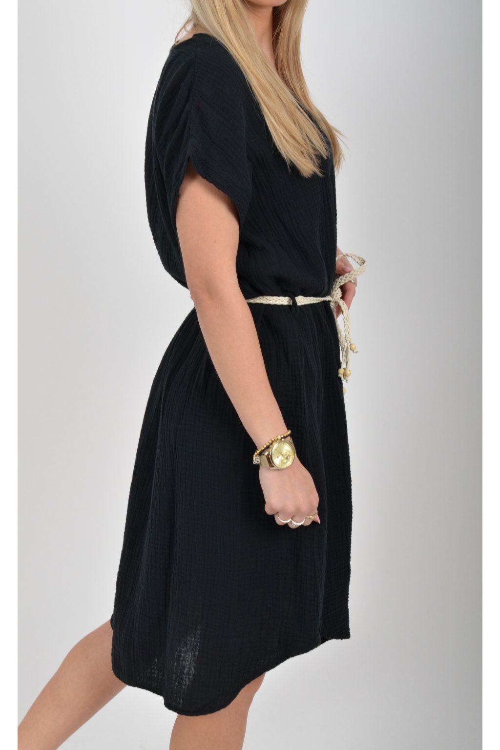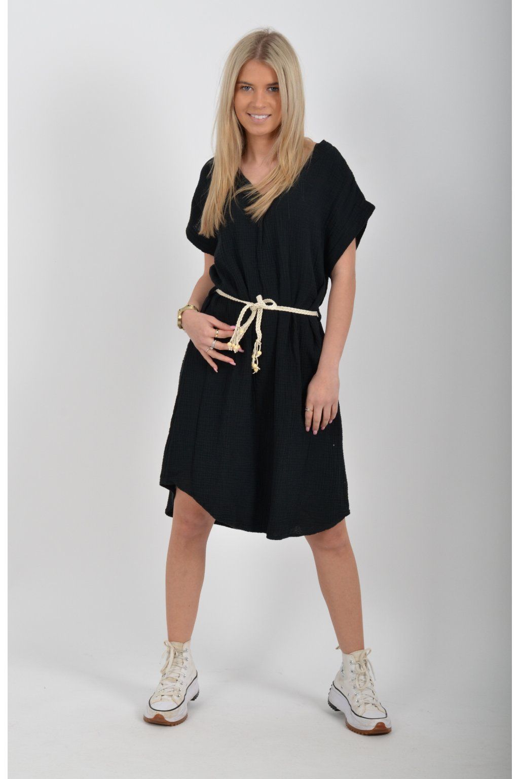Šaty vyrobené z velice příjemného mušelínu. Šaty lehounce áčkový střih a je k nim pásek pro libovolné stažení.