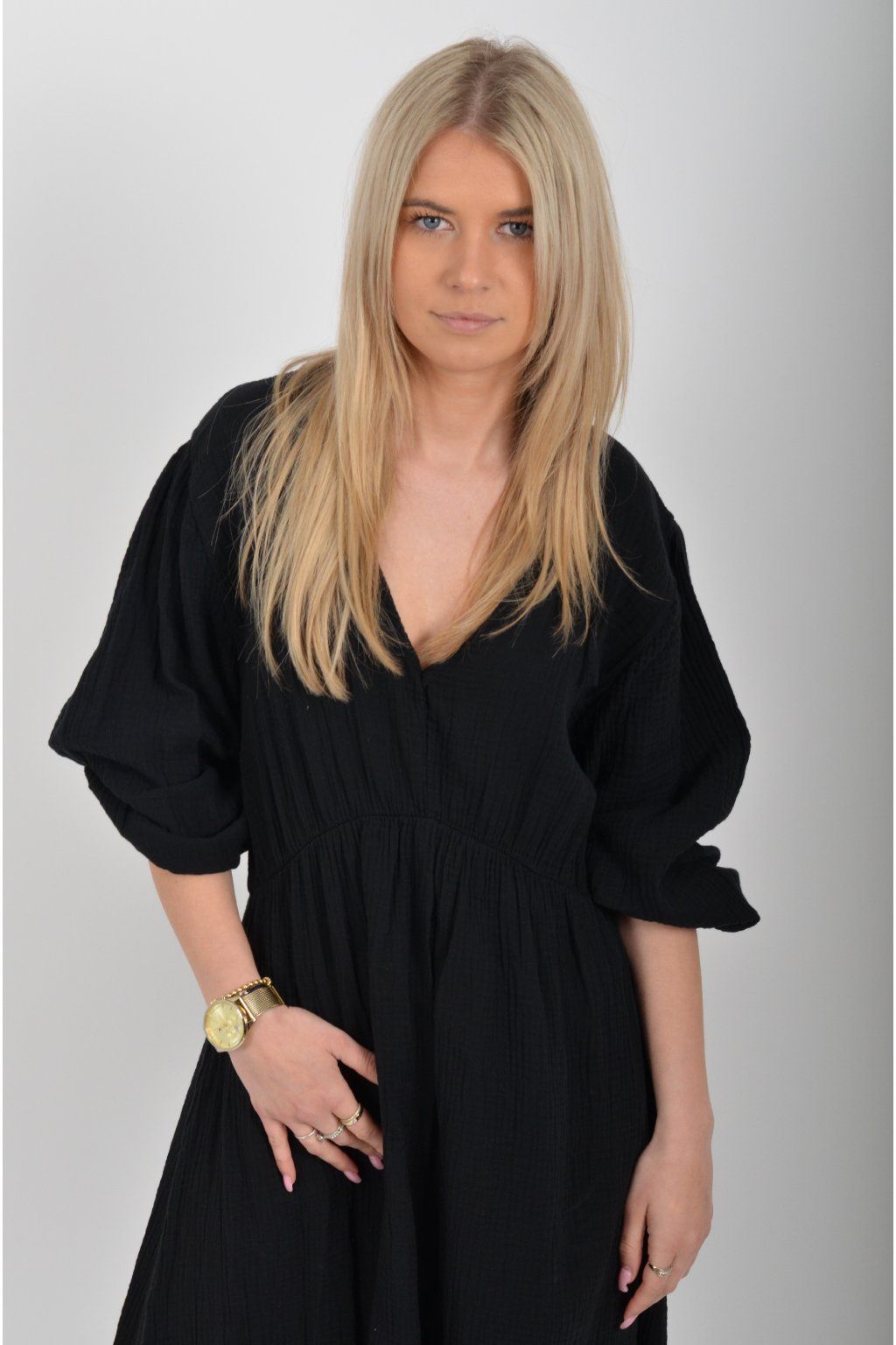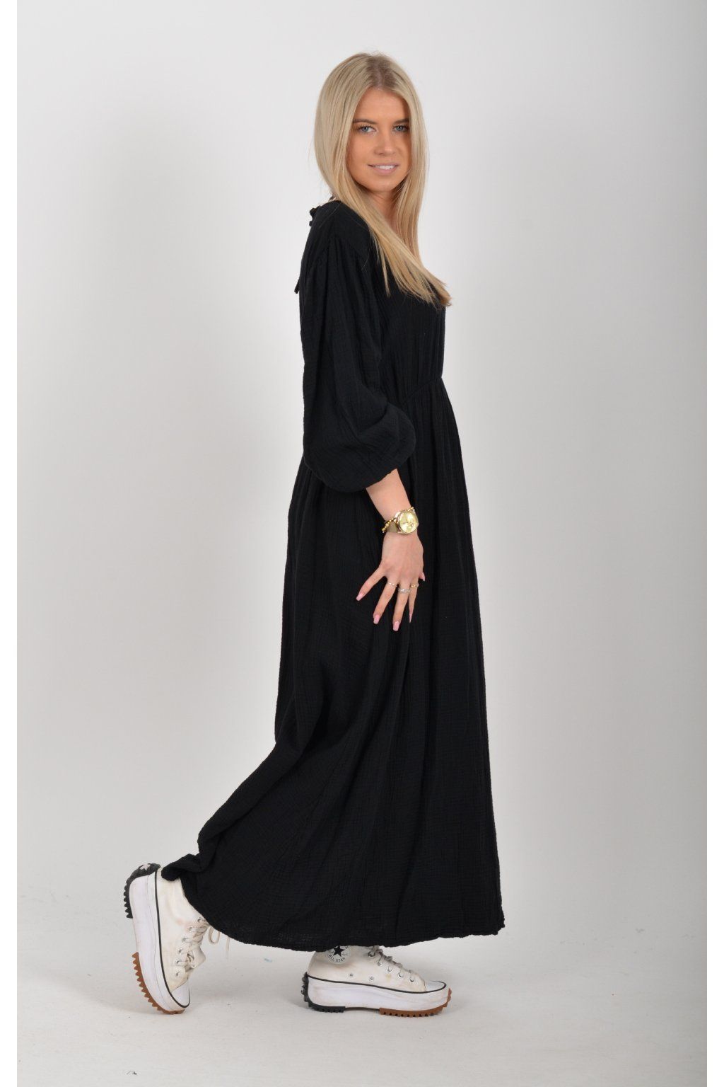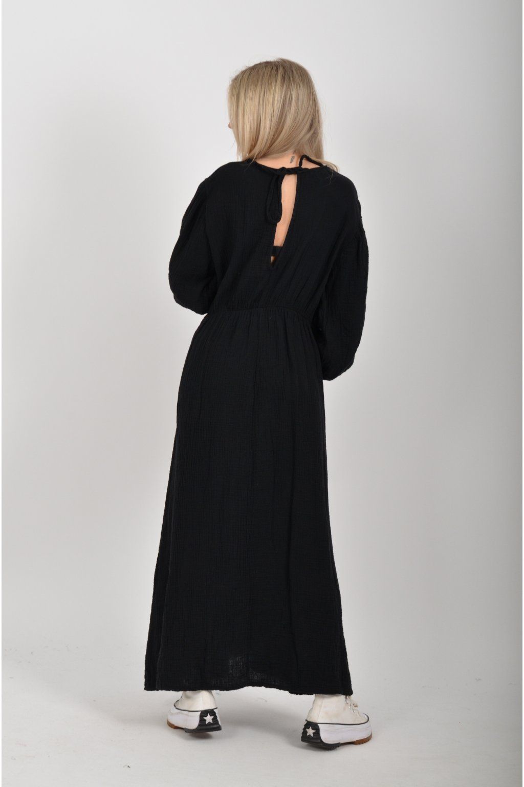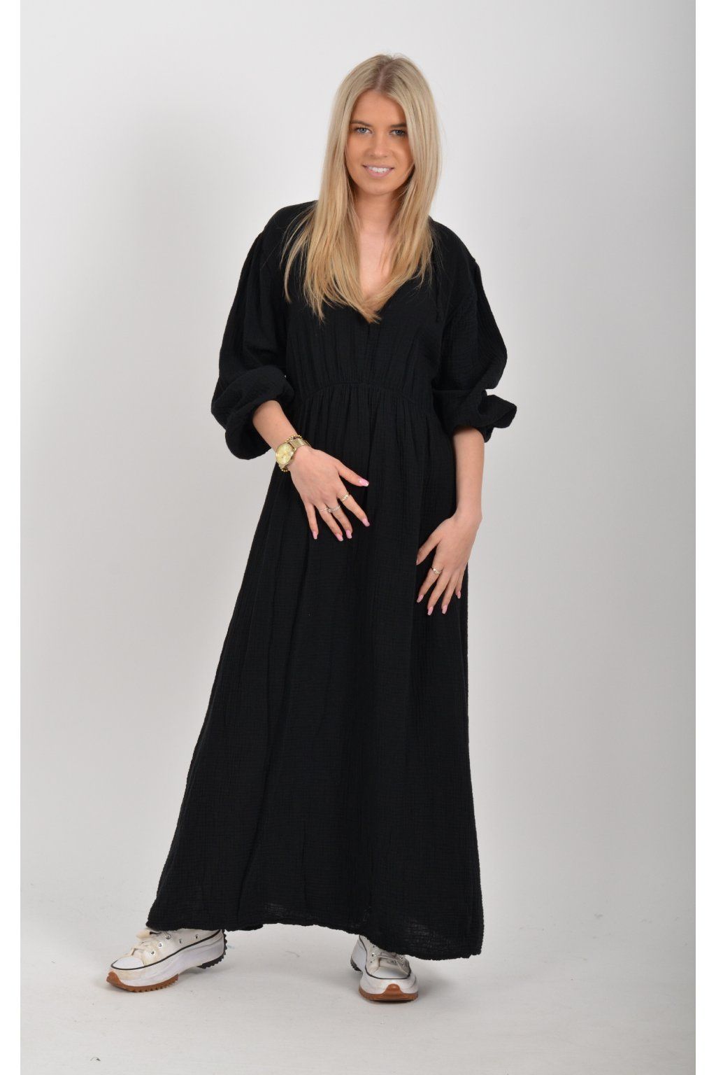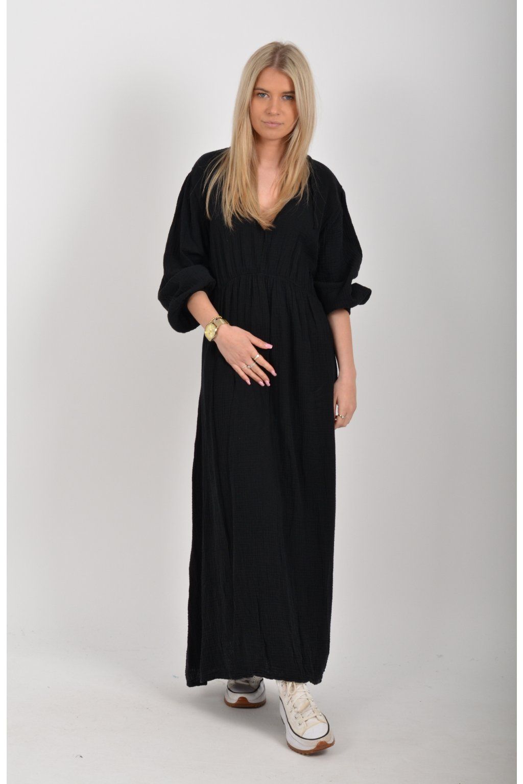 Maxi šaty vyrobené z velice příjemného mušelínu. Šaty mají áčkový střih, jsou střižené pod prsy, kde je také zapracovaná guma. V zadní části u krku mají vázání na tkaničku. Šaty mají tříčtvrteční rukáv zakončený zapracovanou gumou.