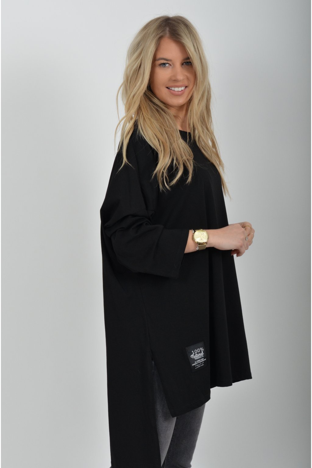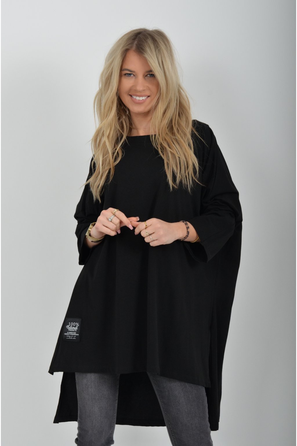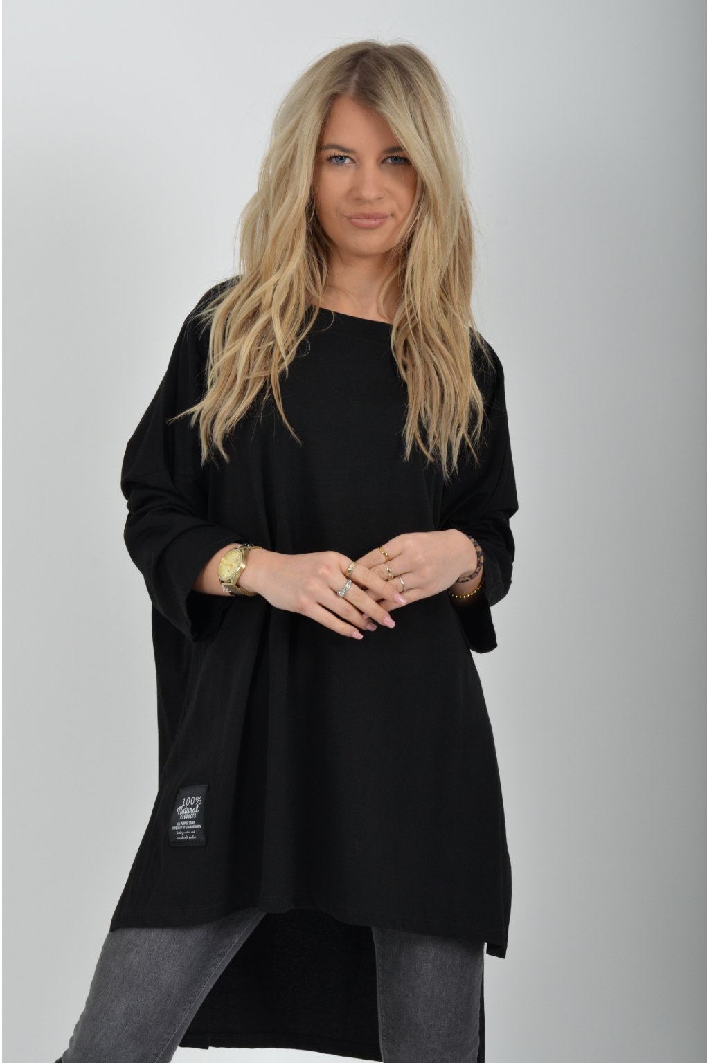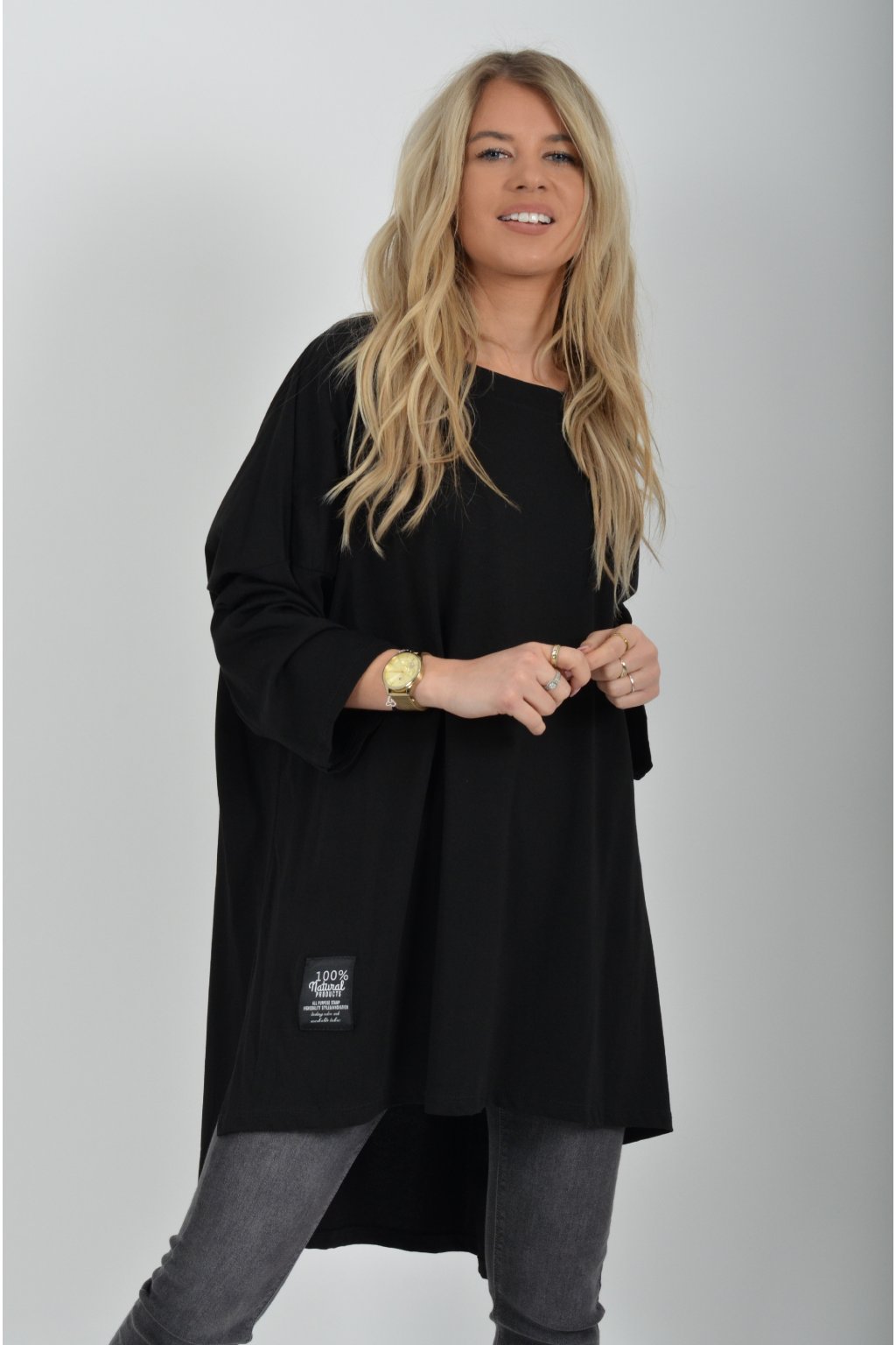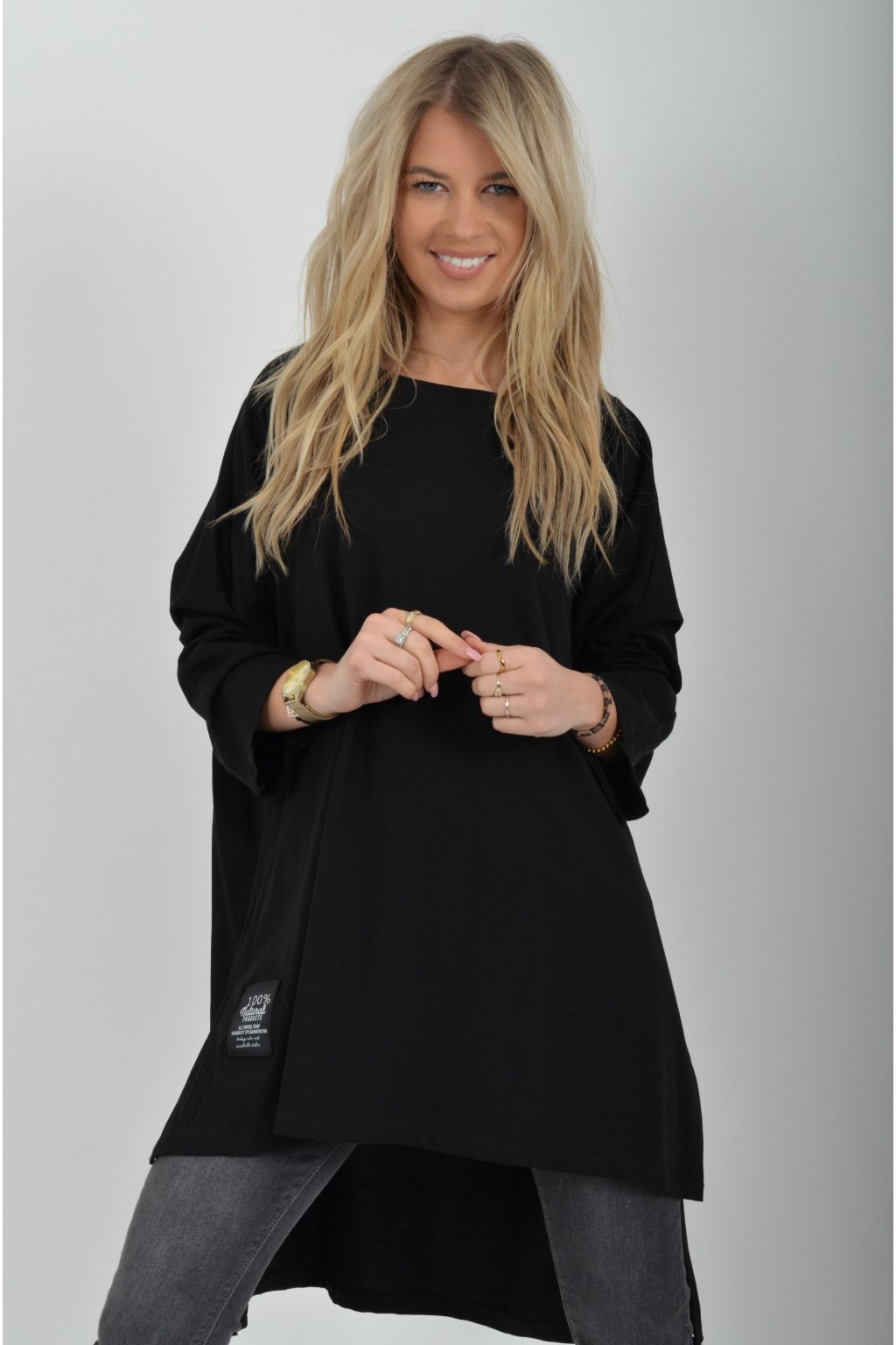 Jednobarevné oversize tričko s 3/4rukávem vyrobené z velice lehké, měkké a příjemné bavlny. Zadní část trička je delší než přední.