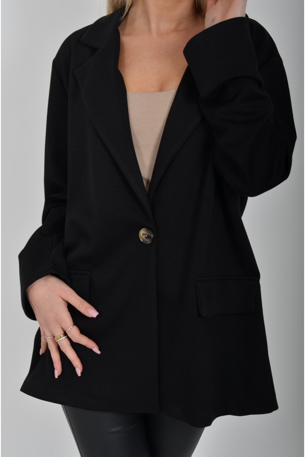 Elegantní sako s podšívkou, a falešnými kapsami v přední části vyrobené z velice příjemného kvalitního a lehounkého materiálu. Materiál je elastický.