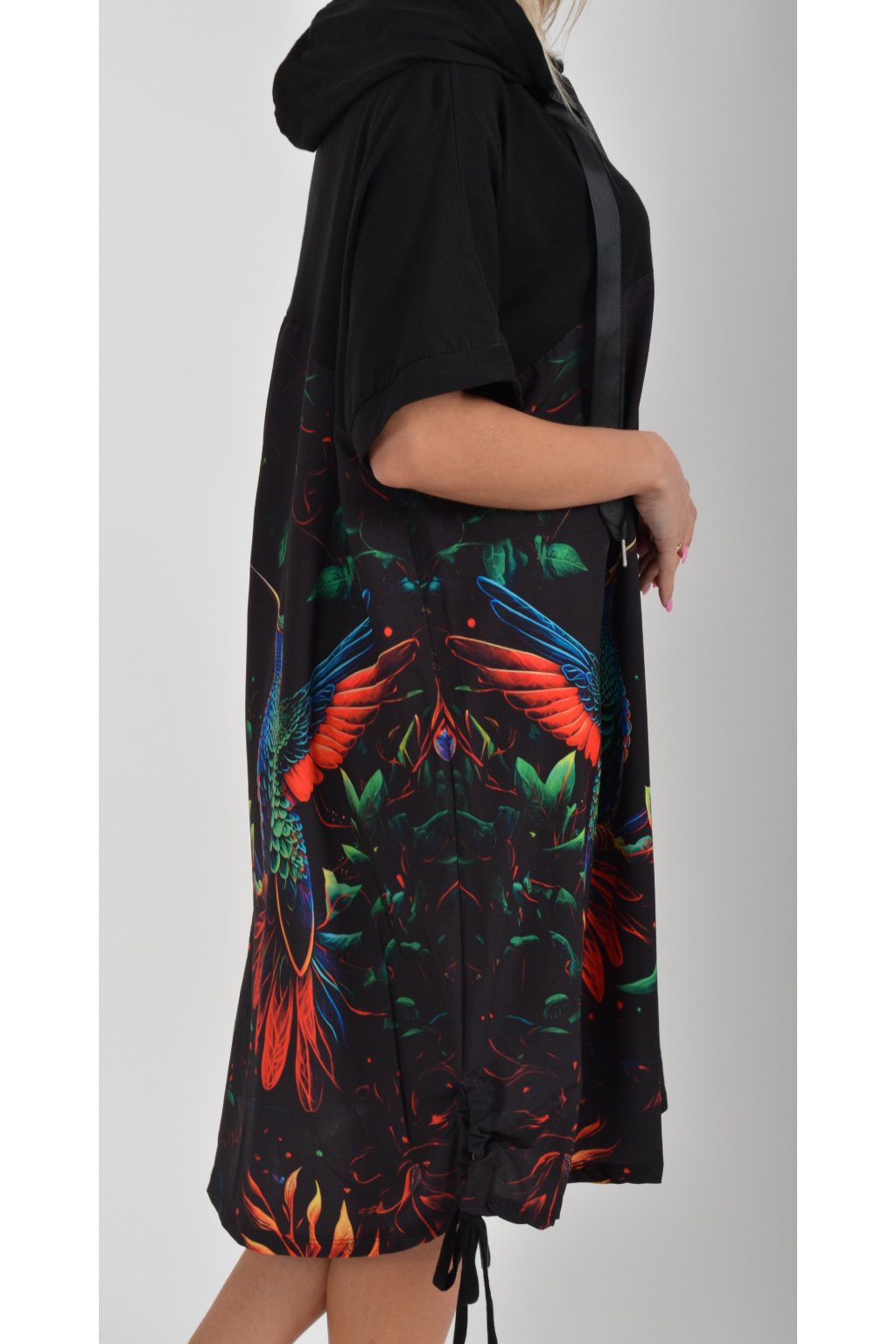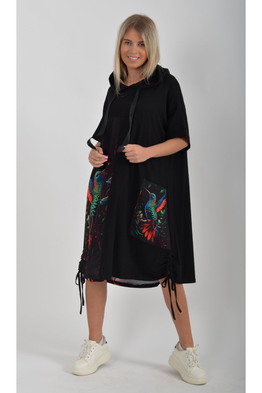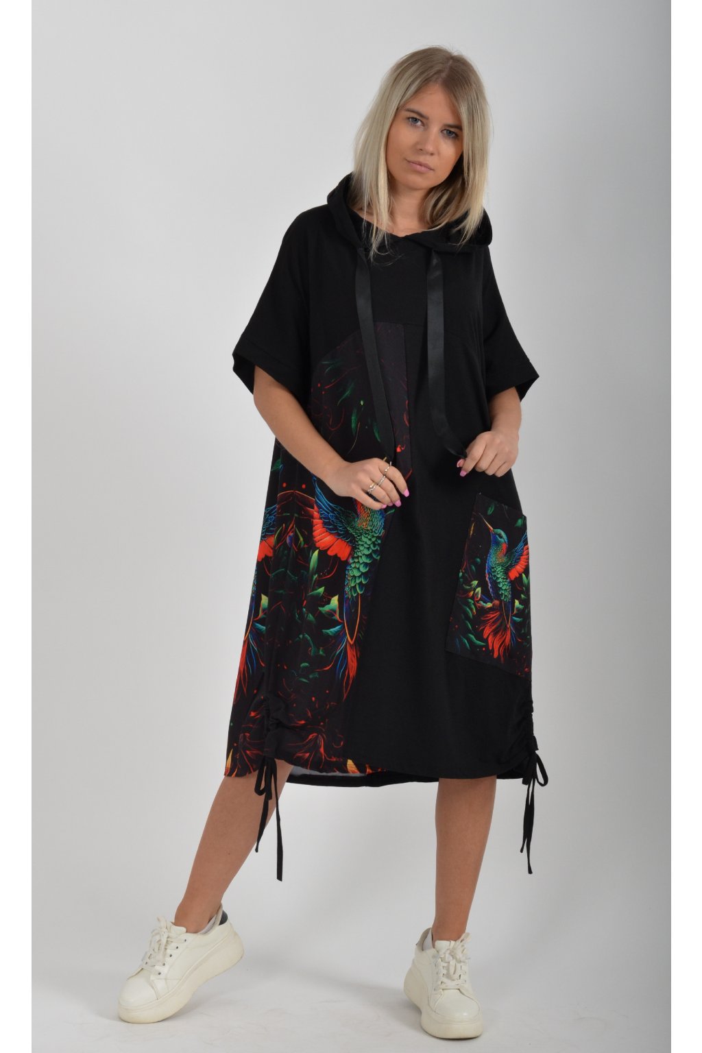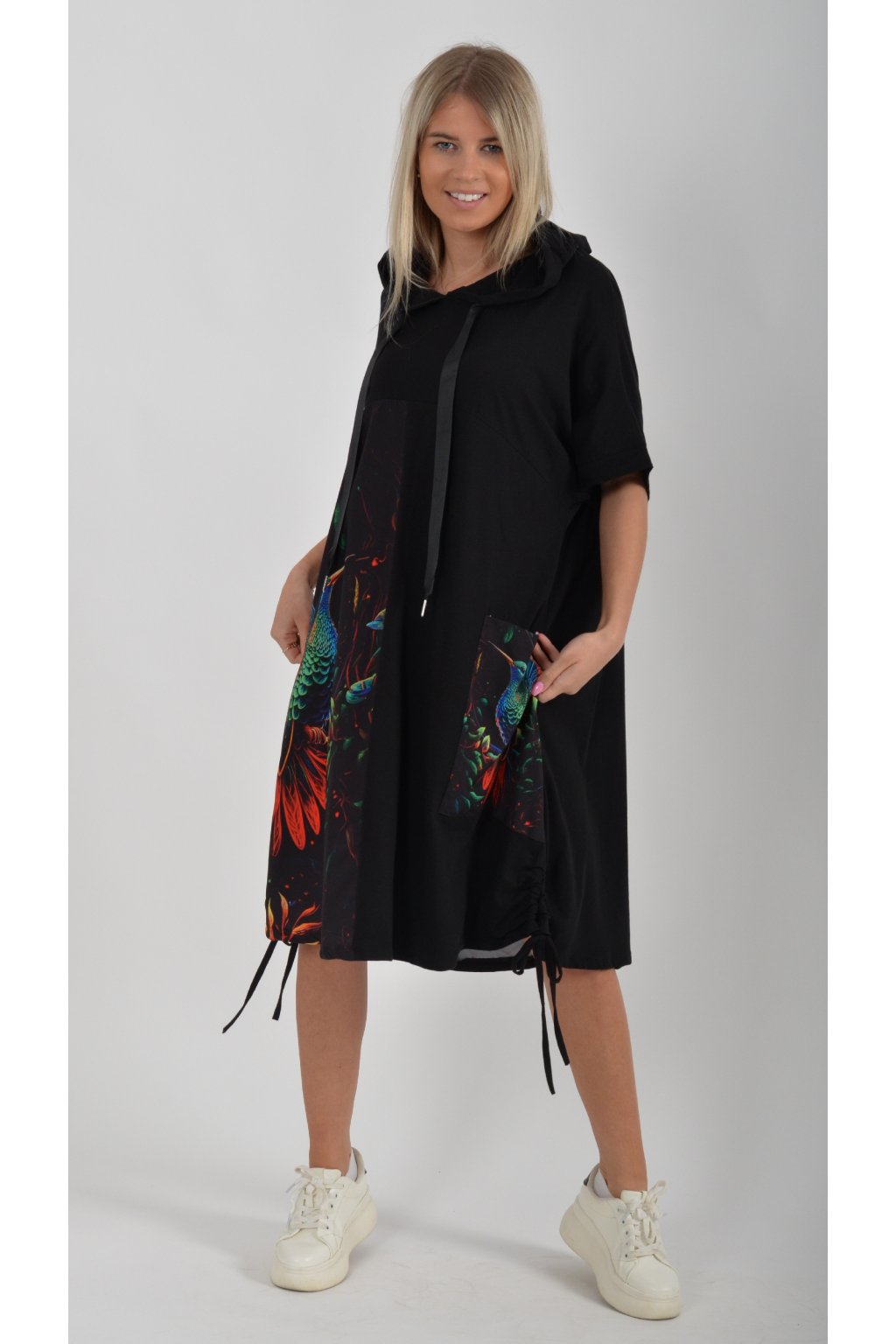 Zajímavé bavlněné šaty s barevným vzorem. Mají áčkový střih, kapuci a krátký rukáv. Bavlna je velice příjemná na dotek. Ve spodní části na bocích je můžete pomocí šňůrky stáhnout.