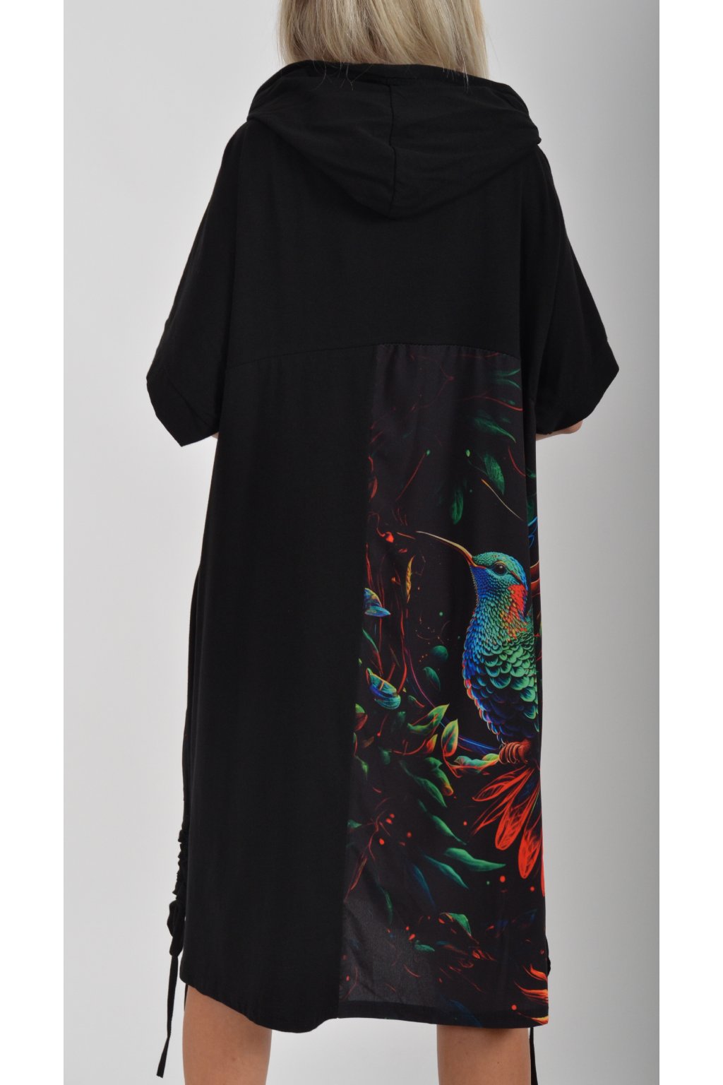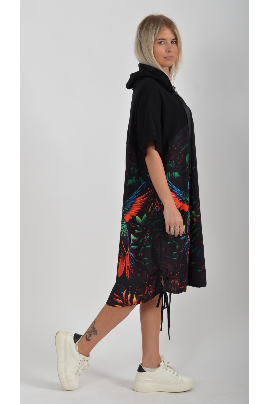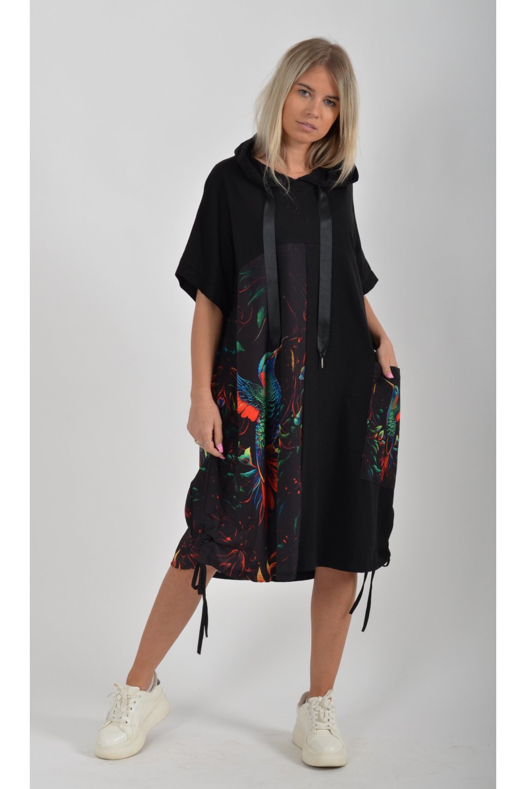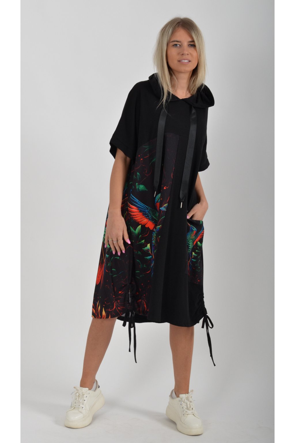 Zajímavé bavlněné šaty s barevným vzorem. Mají áčkový střih, kapuci a krátký rukáv. Bavlna je velice příjemná na dotek. Ve spodní části na bocích je můžete pomocí šňůrky stáhnout.