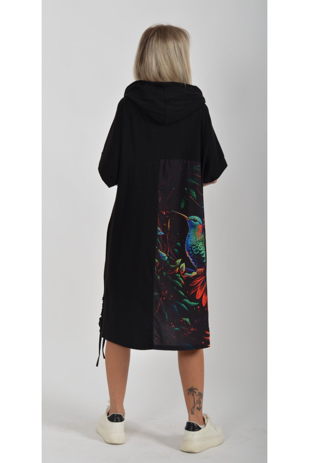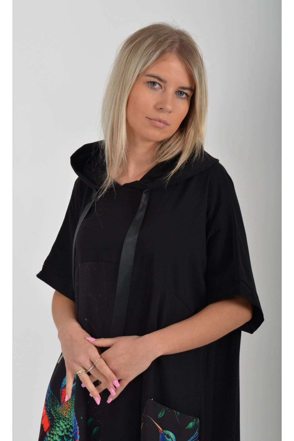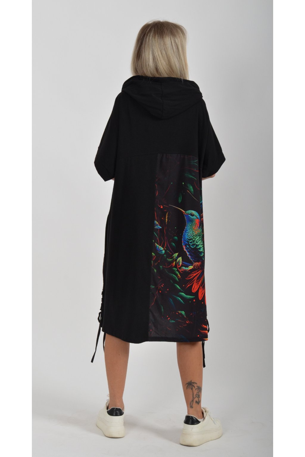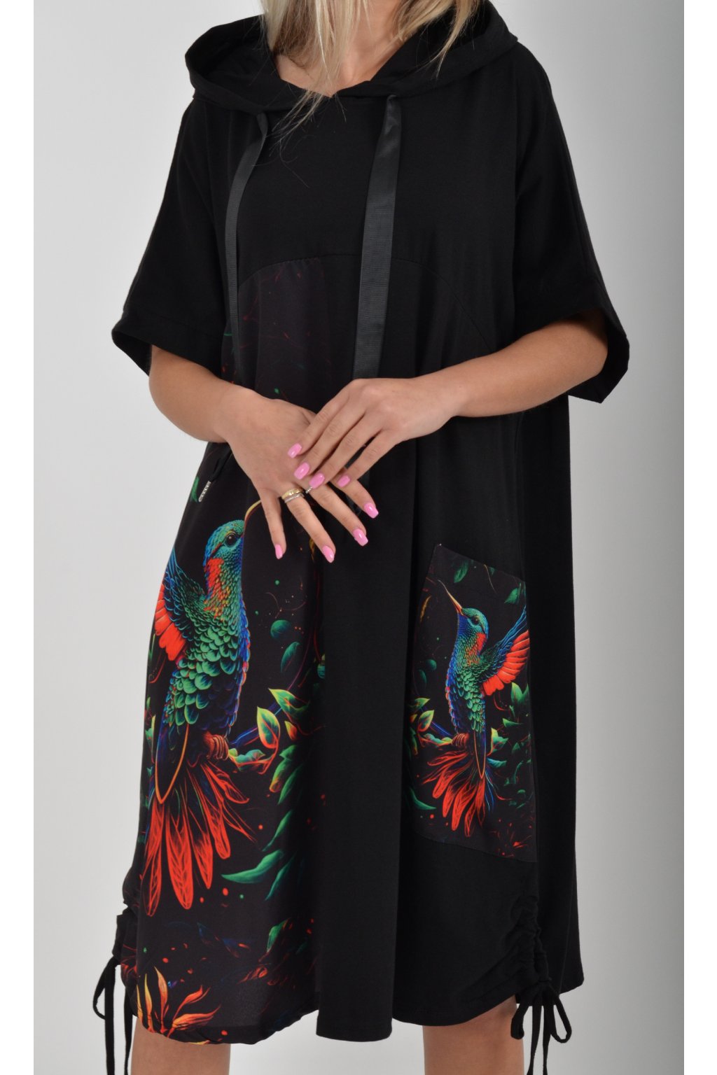 Zajímavé bavlněné šaty s barevným vzorem. Mají áčkový střih, kapuci a krátký rukáv. Bavlna je velice příjemná na dotek. Ve spodní části na bocích je můžete pomocí šňůrky stáhnout.