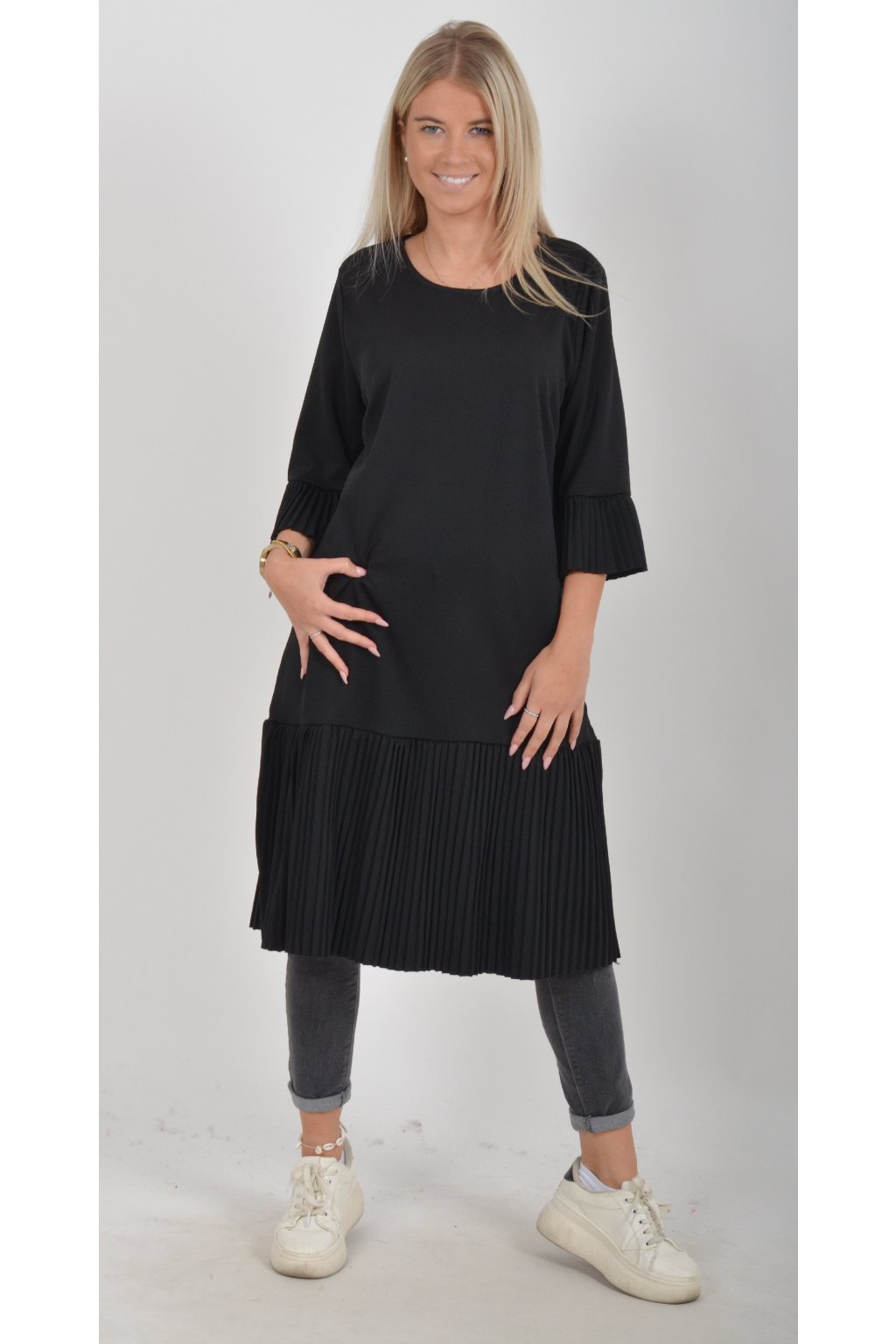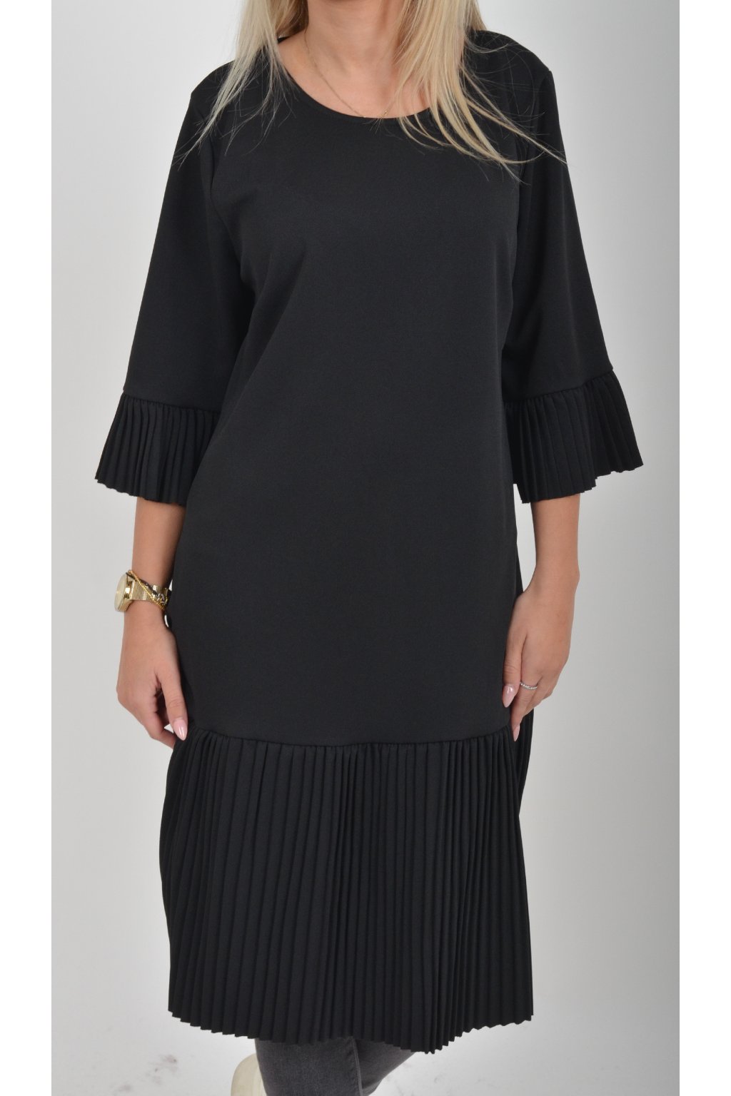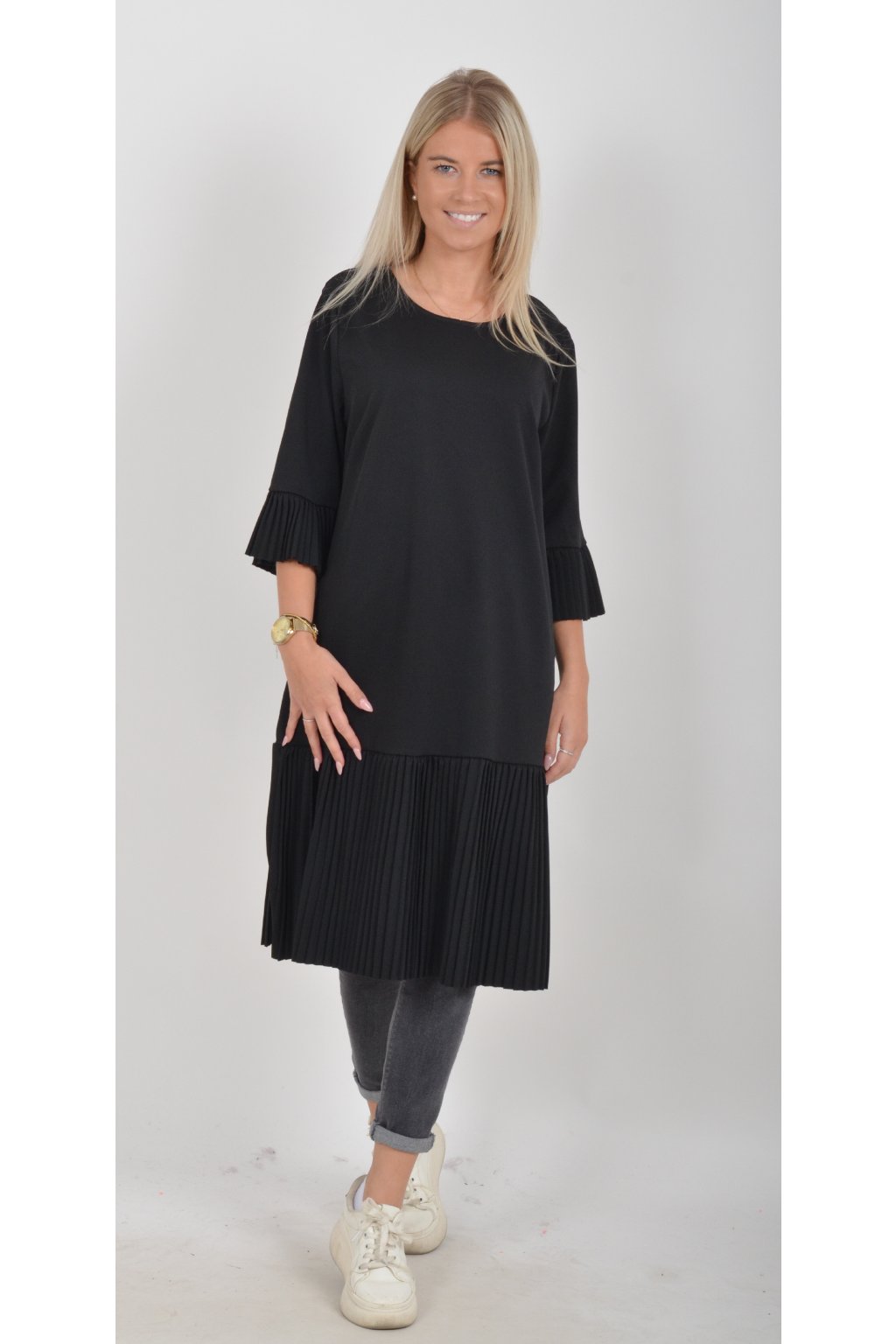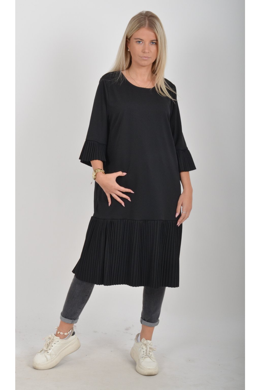Elegantní a pohodlné šaty, které zaujmou originálním plisovaným lemem rukávu a spodní části. Volný střih lichotí každé postavě a poskytuje maximální komfort při nošení. Perfektní volba pro společenské události, rodinné oslavy i běžné nošení. Jako doplněk doporučujeme pásek nebo ozdobnou brož z naší nabídky.