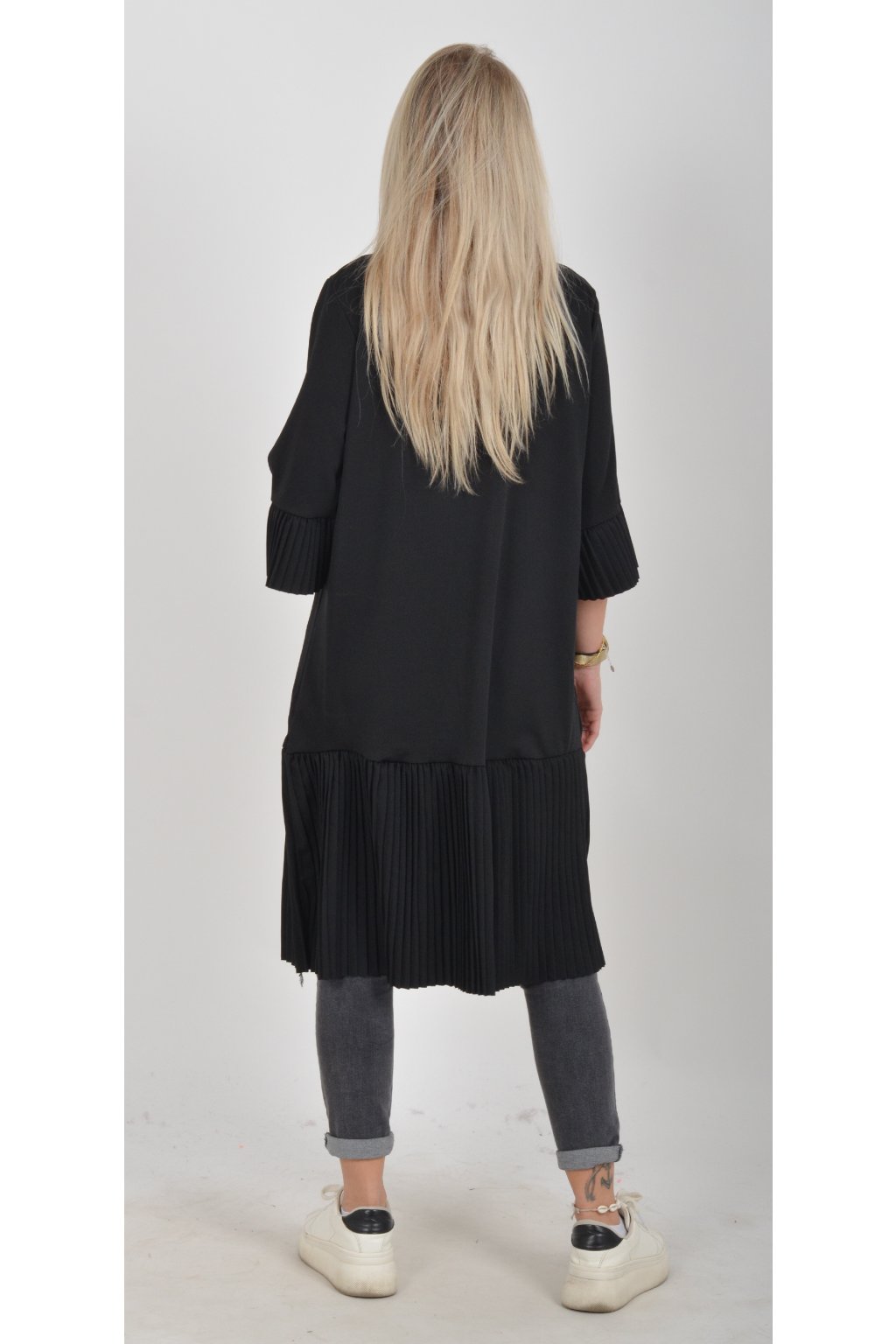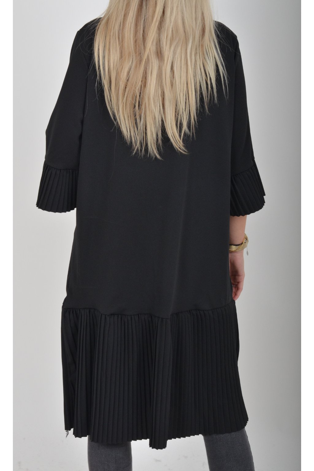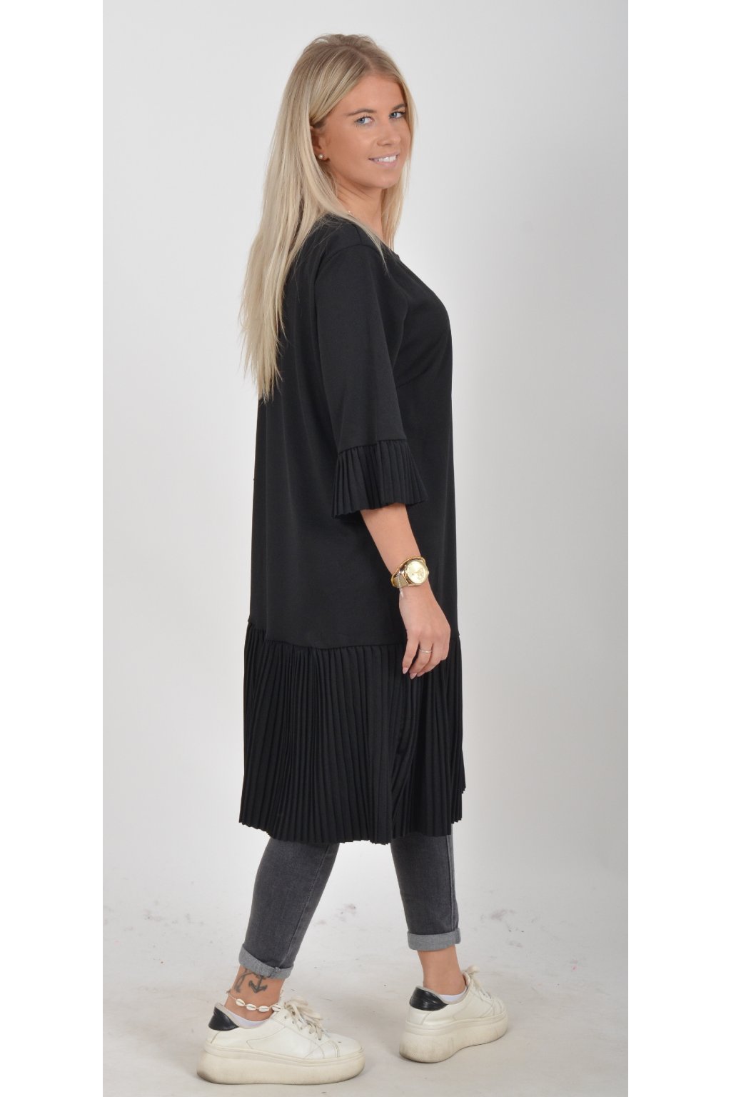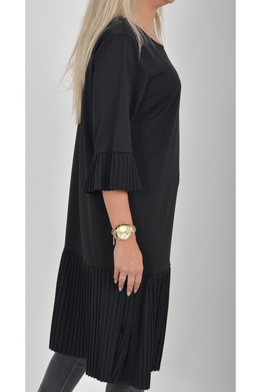 Elegantní a pohodlné šaty, které zaujmou originálním plisovaným lemem rukávu a spodní části. Volný střih lichotí každé postavě a poskytuje maximální komfort při nošení. Perfektní volba pro společenské události, rodinné oslavy i běžné nošení. Jako doplněk doporučujeme pásek nebo ozdobnou brož z naší nabídky.