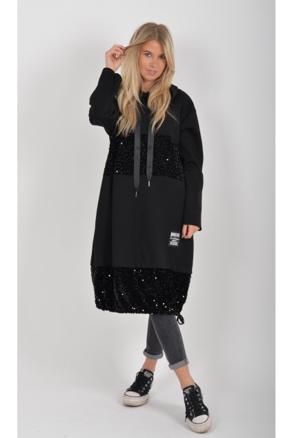 Mikinové šaty zdobené flitry ve spodní části. Šaty mají áčkový střih a jsou z velice příjemného materiálu. Šaty jsou bez kapes.