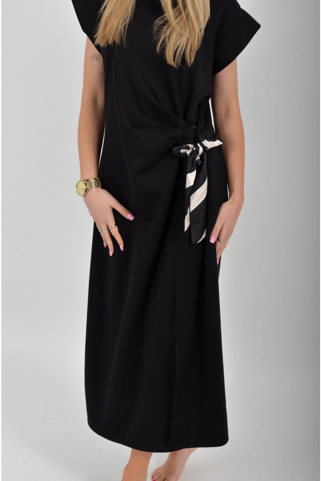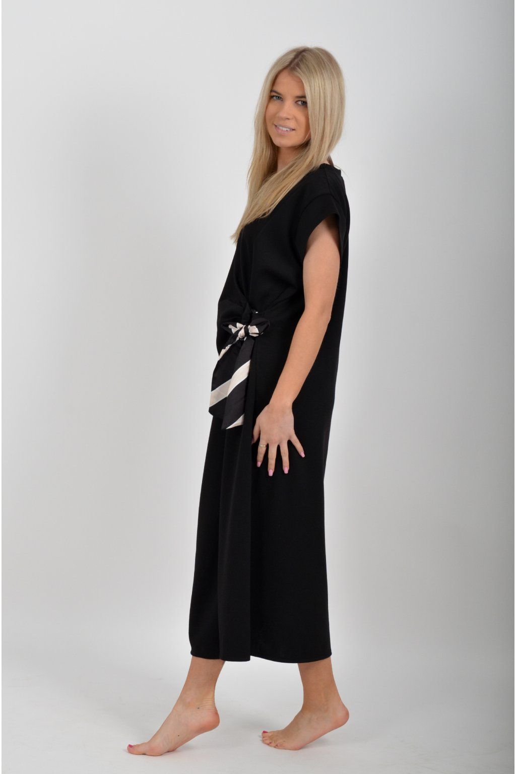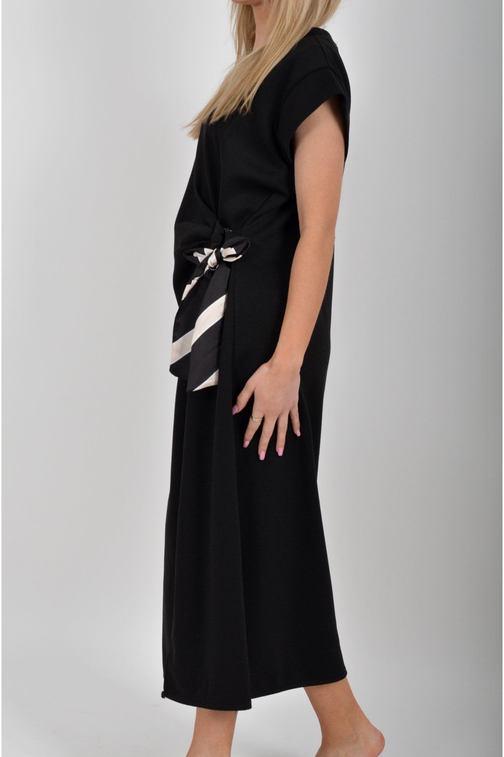 Dlouhé šaty vyrobené z velice příjemného máslového materiálu. Mají od pasu, který je lehce projmutý áčkový střih. V pase na boku mají "vázání" pomocí kterého lze šaty libovolně stáhnout aby dobře seděli na postavě. Ve spodní části májí rozparek a nemají kapsy.
