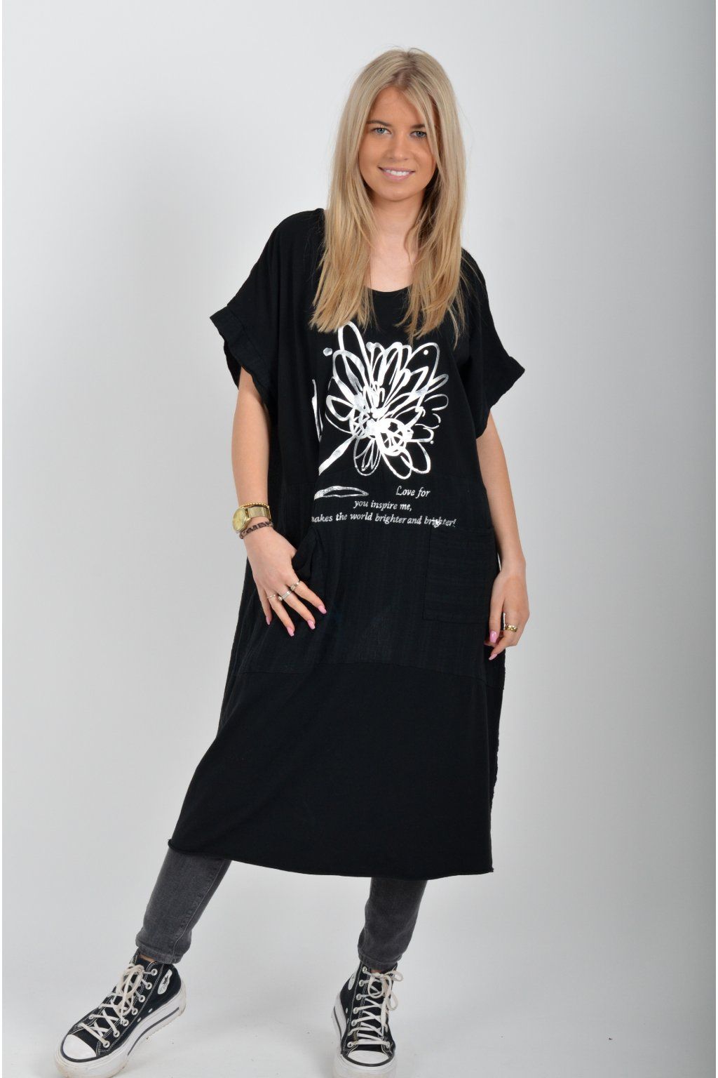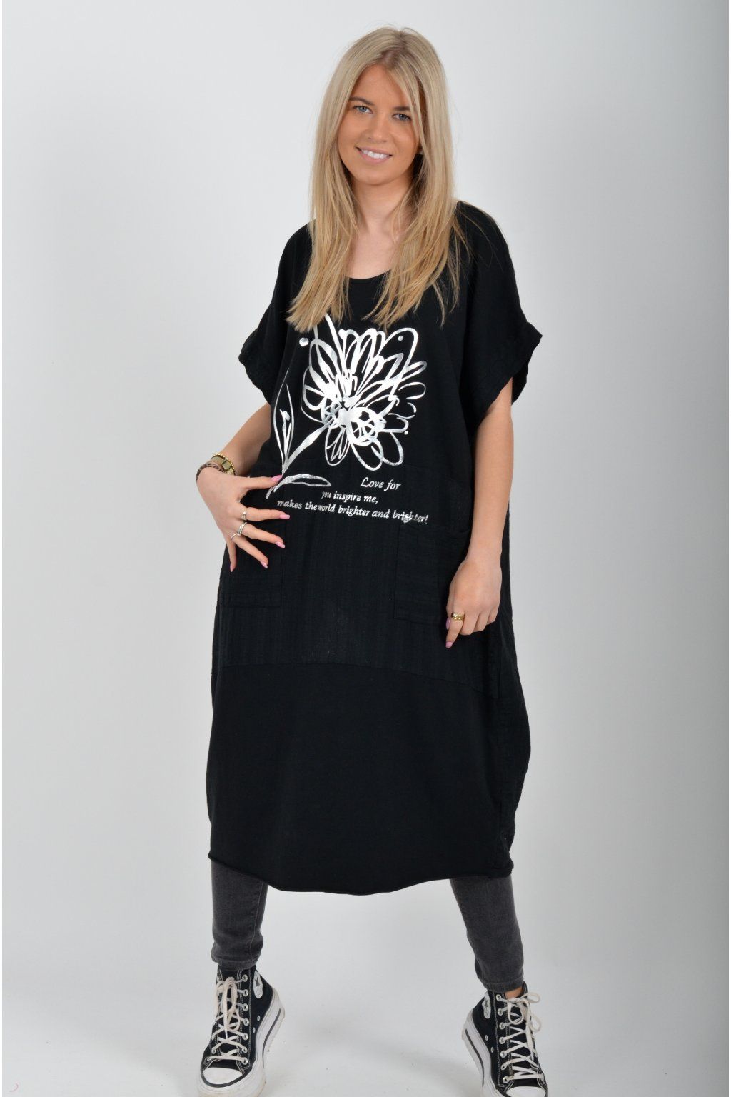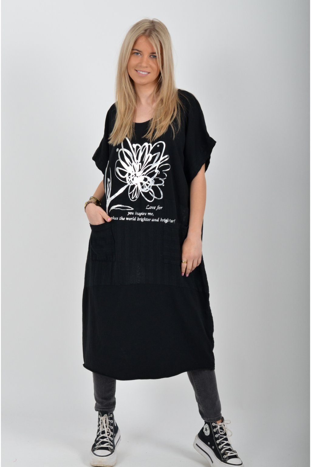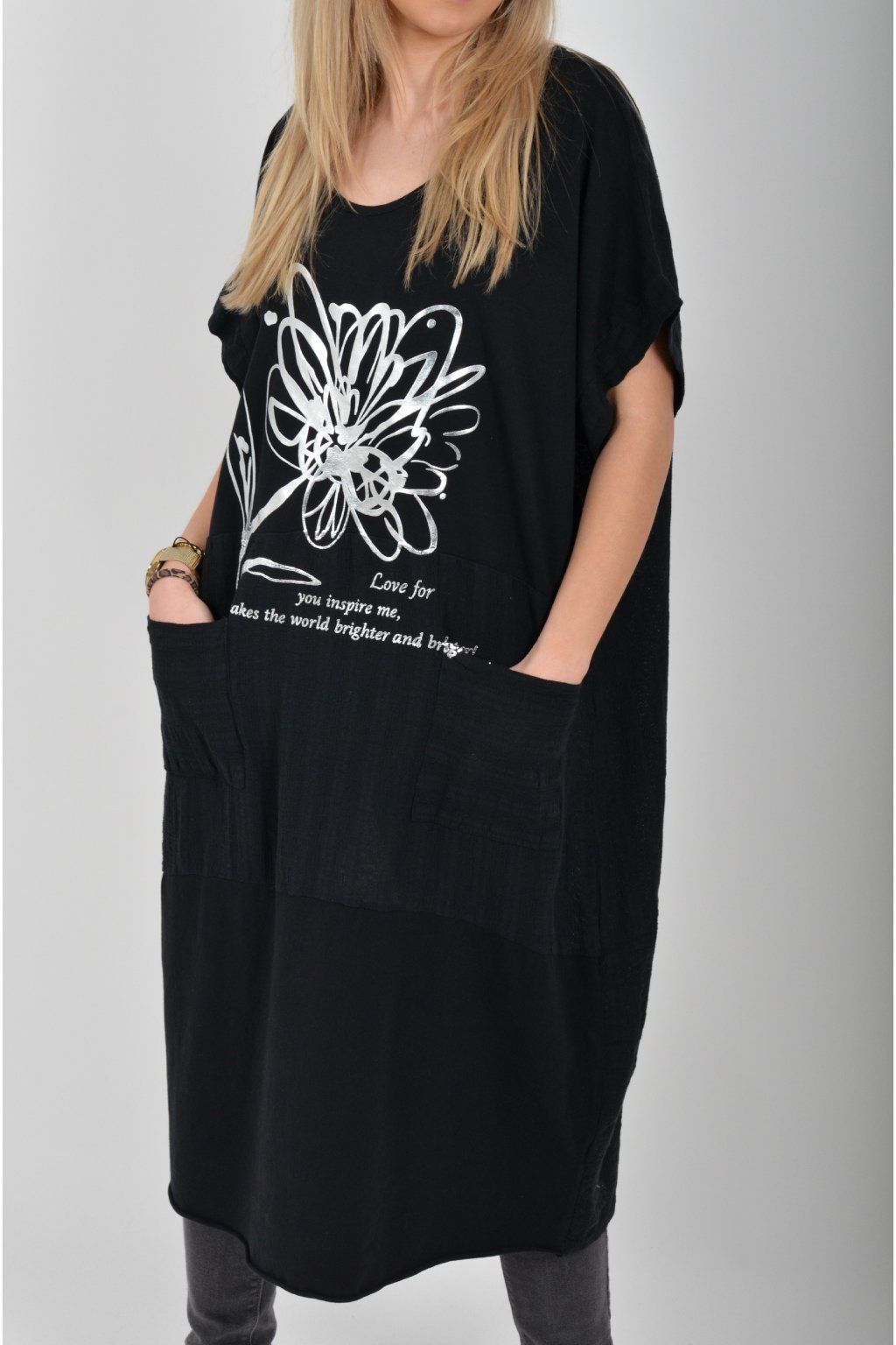 Zajímavé bavlněné šaty se stříbrným potiskem a kapsami v přední části.. Mají balónový střih a krátké rukávy. Jsou vyrobené z velice příjemného a pružného materiálu.