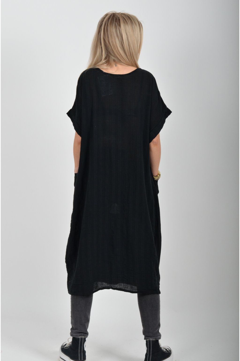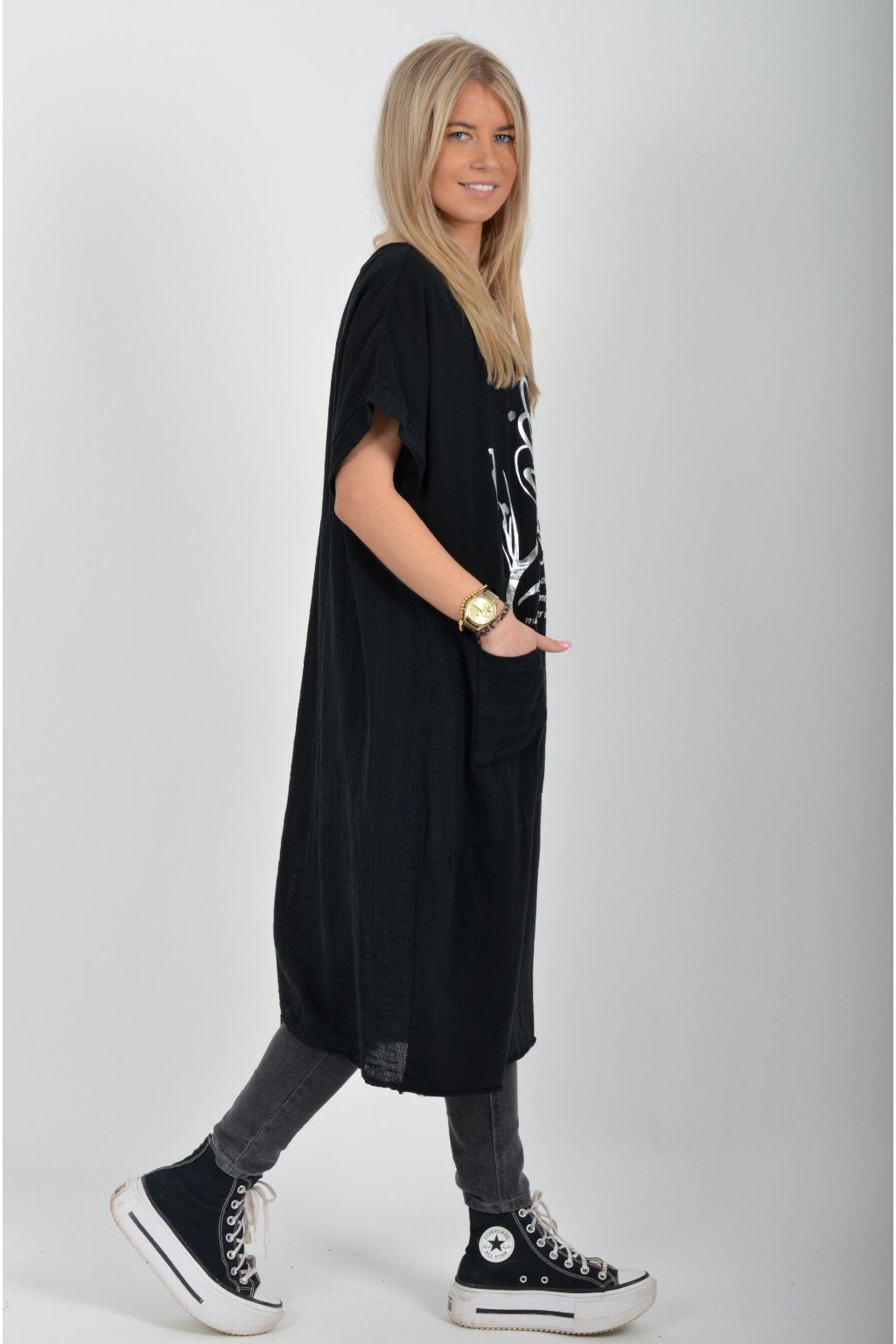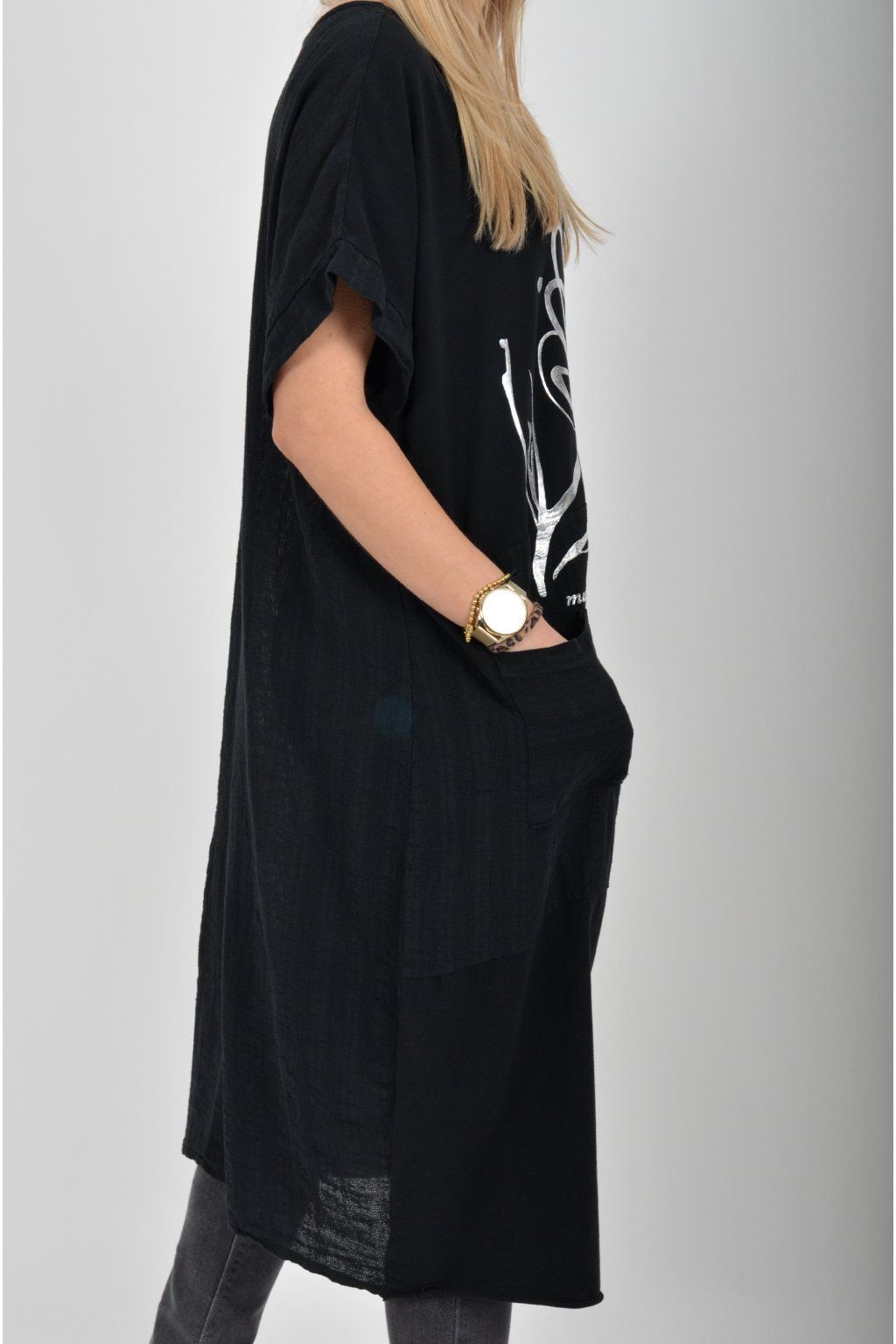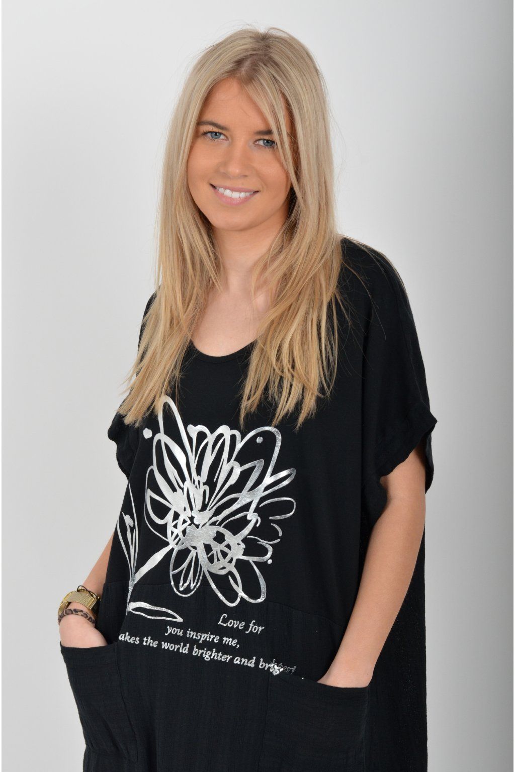 Zajímavé bavlněné šaty se stříbrným potiskem a kapsami v přední části.. Mají balónový střih a krátké rukávy. Jsou vyrobené z velice příjemného a pružného materiálu.