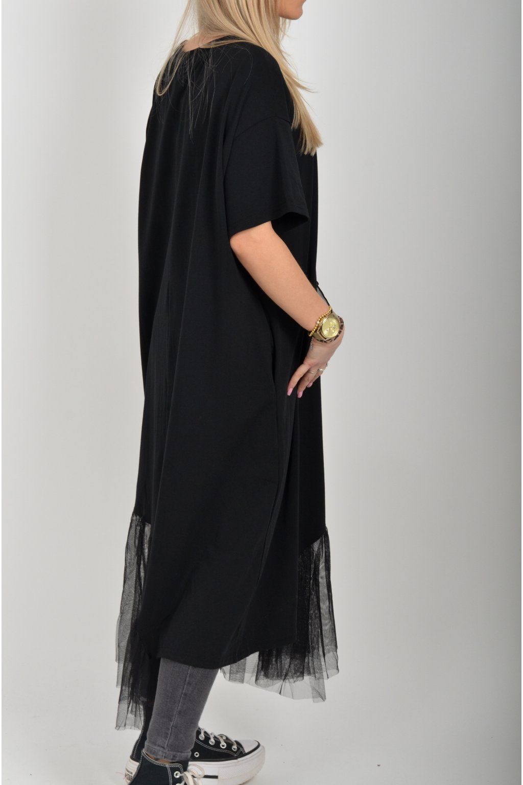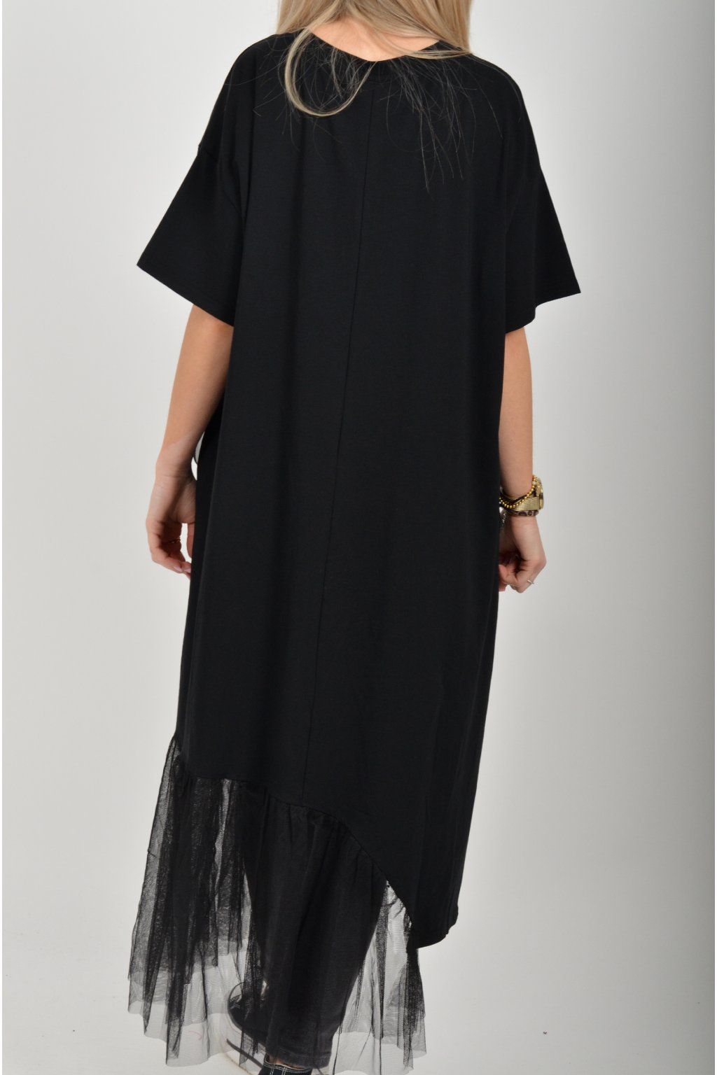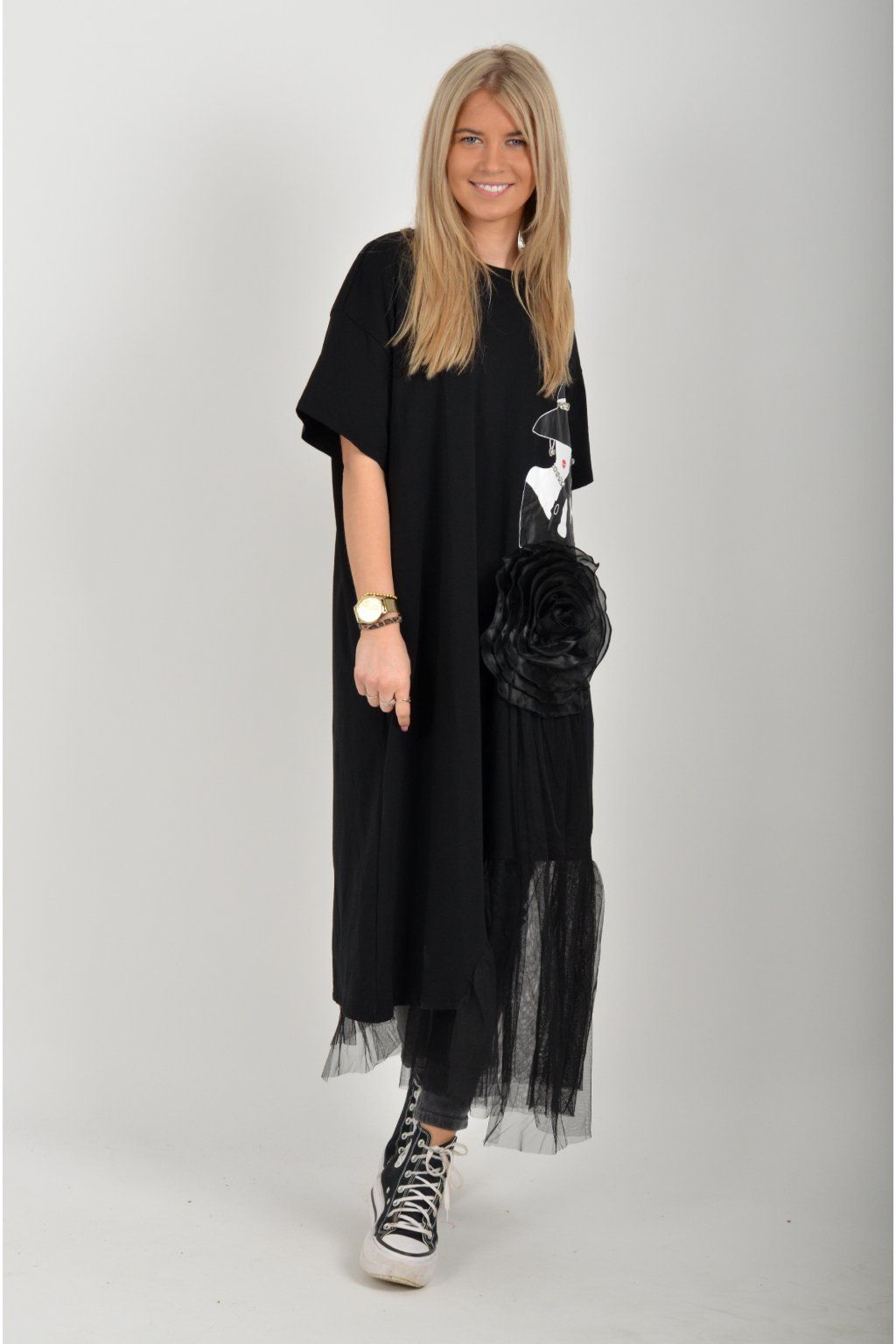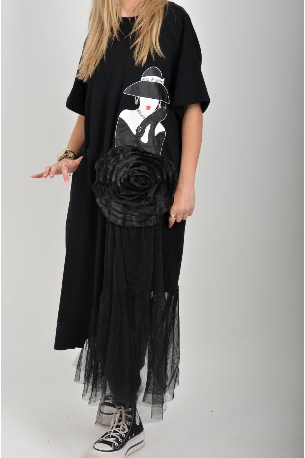 Černé typické bavlněné šaty s modrým potiskem a našitým vzorem. Šaty mají na bocích kapsy a jsou vyrobené z velice příjemného a elastického materiálu.