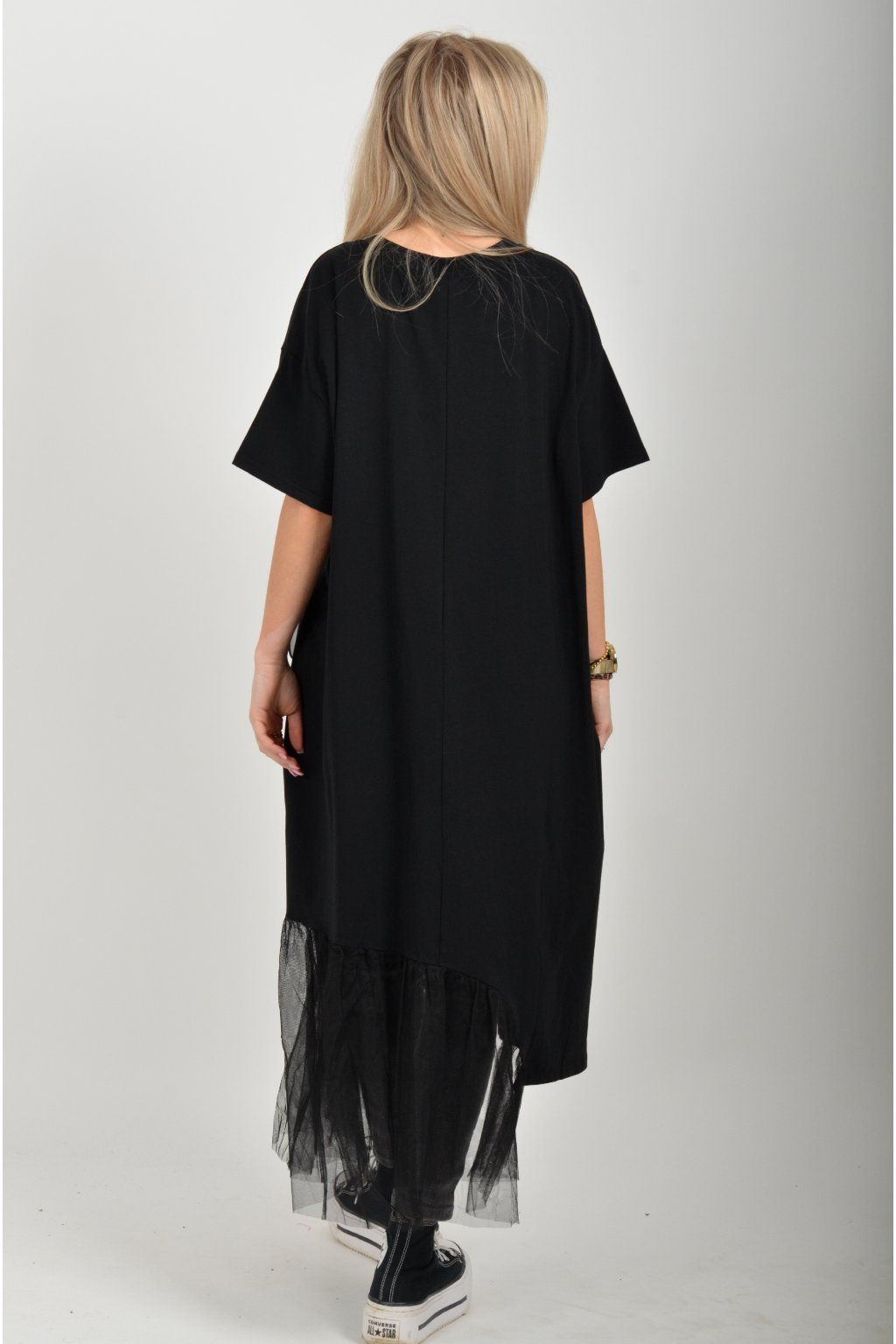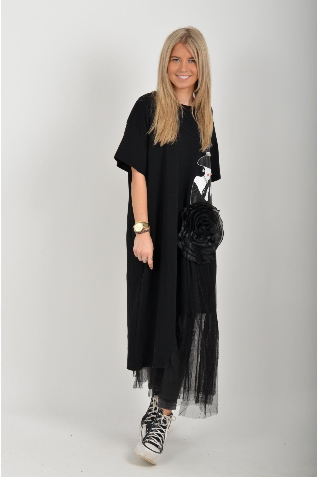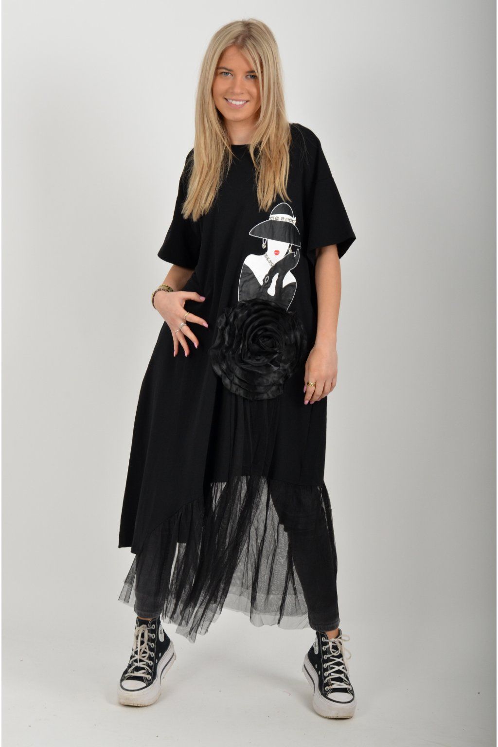Černé typické bavlněné šaty s modrým potiskem a našitým vzorem. Šaty mají na bocích kapsy a jsou vyrobené z velice příjemného a elastického materiálu.