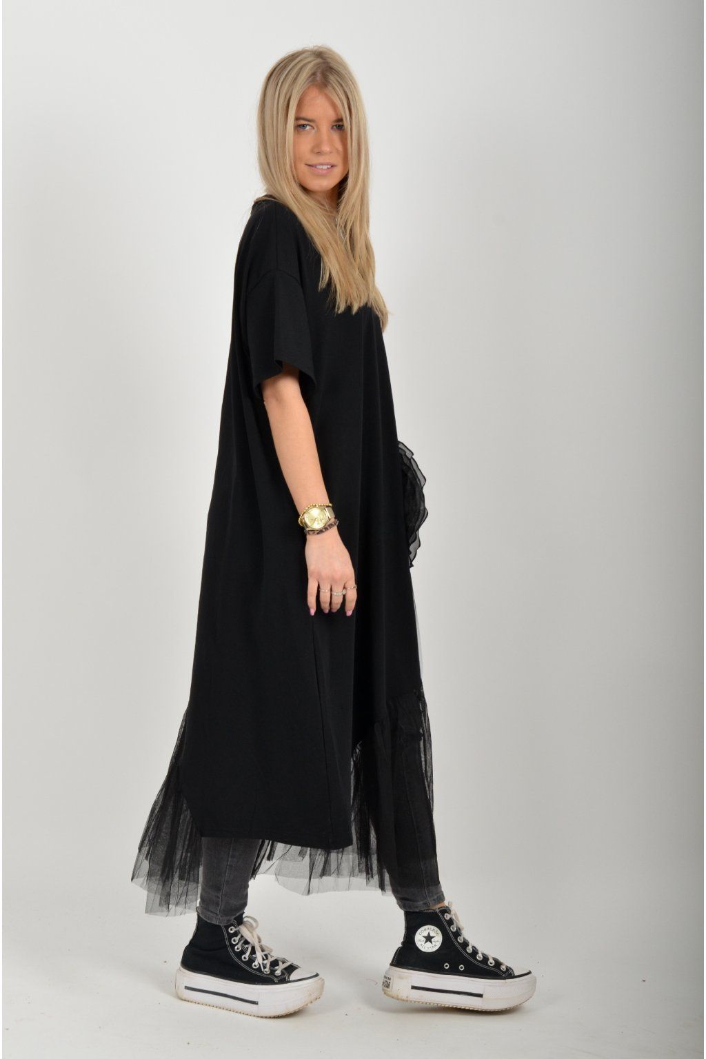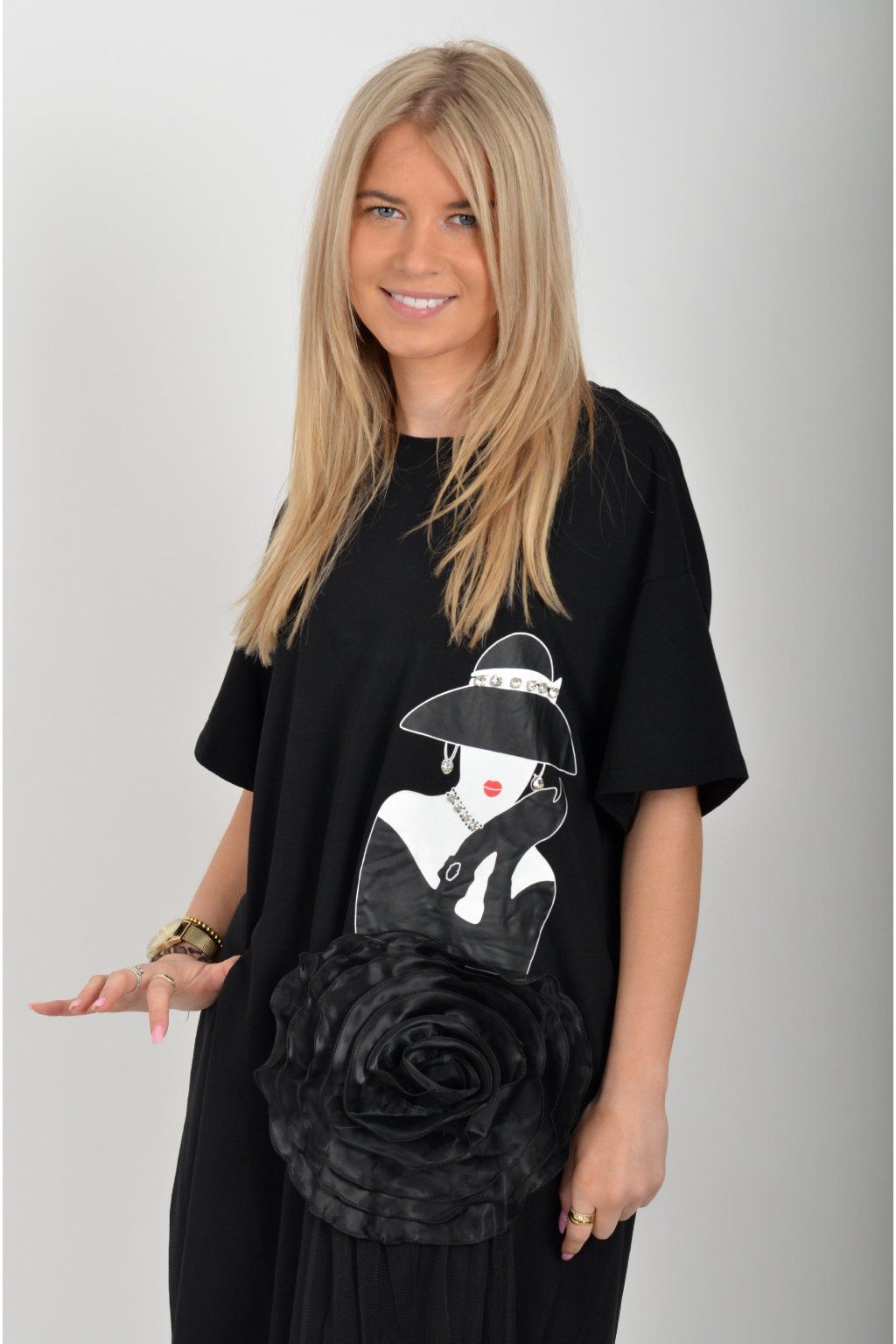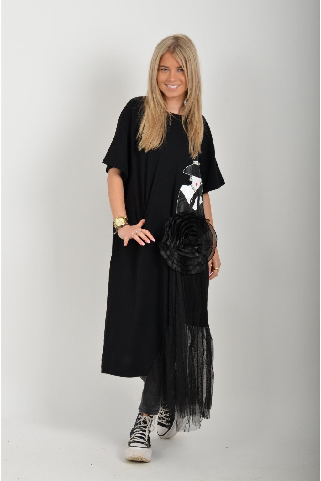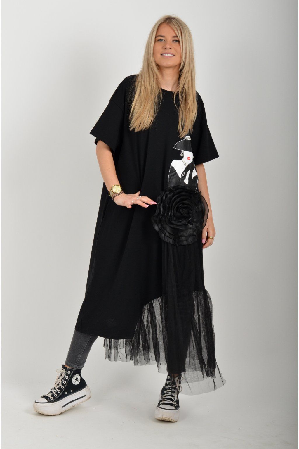 Černé typické bavlněné šaty s modrým potiskem a našitým vzorem. Šaty mají na bocích kapsy a jsou vyrobené z velice příjemného a elastického materiálu.
