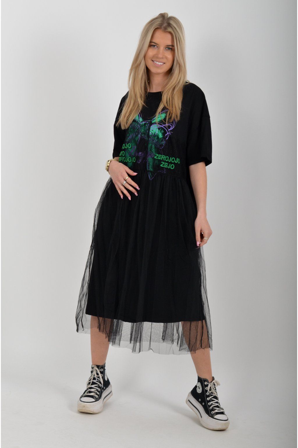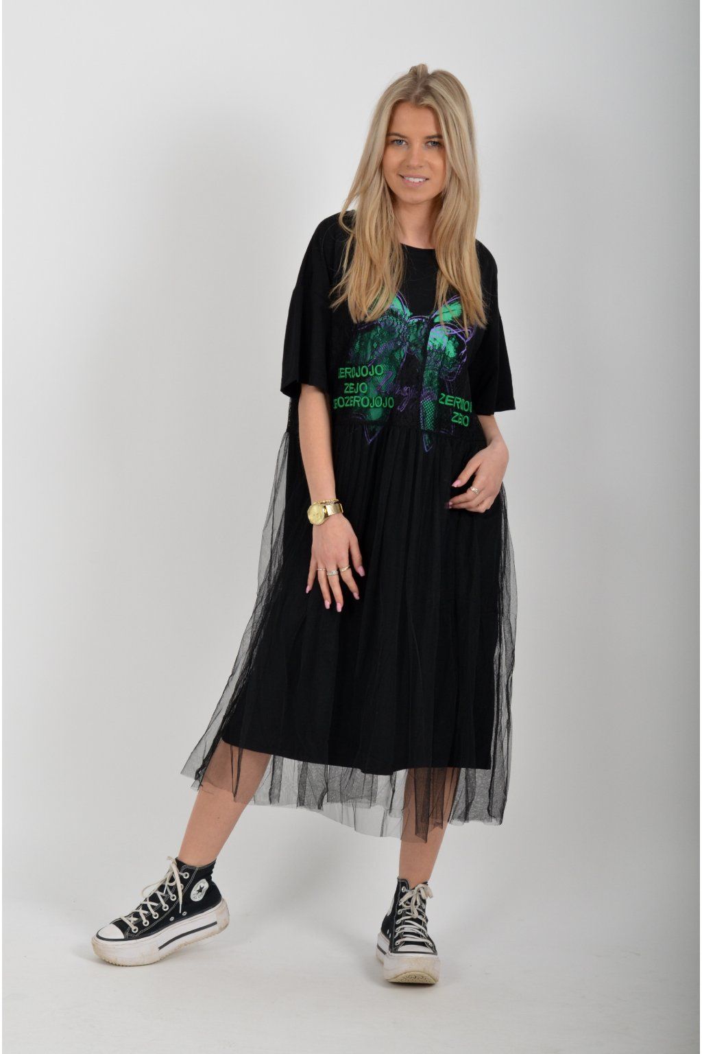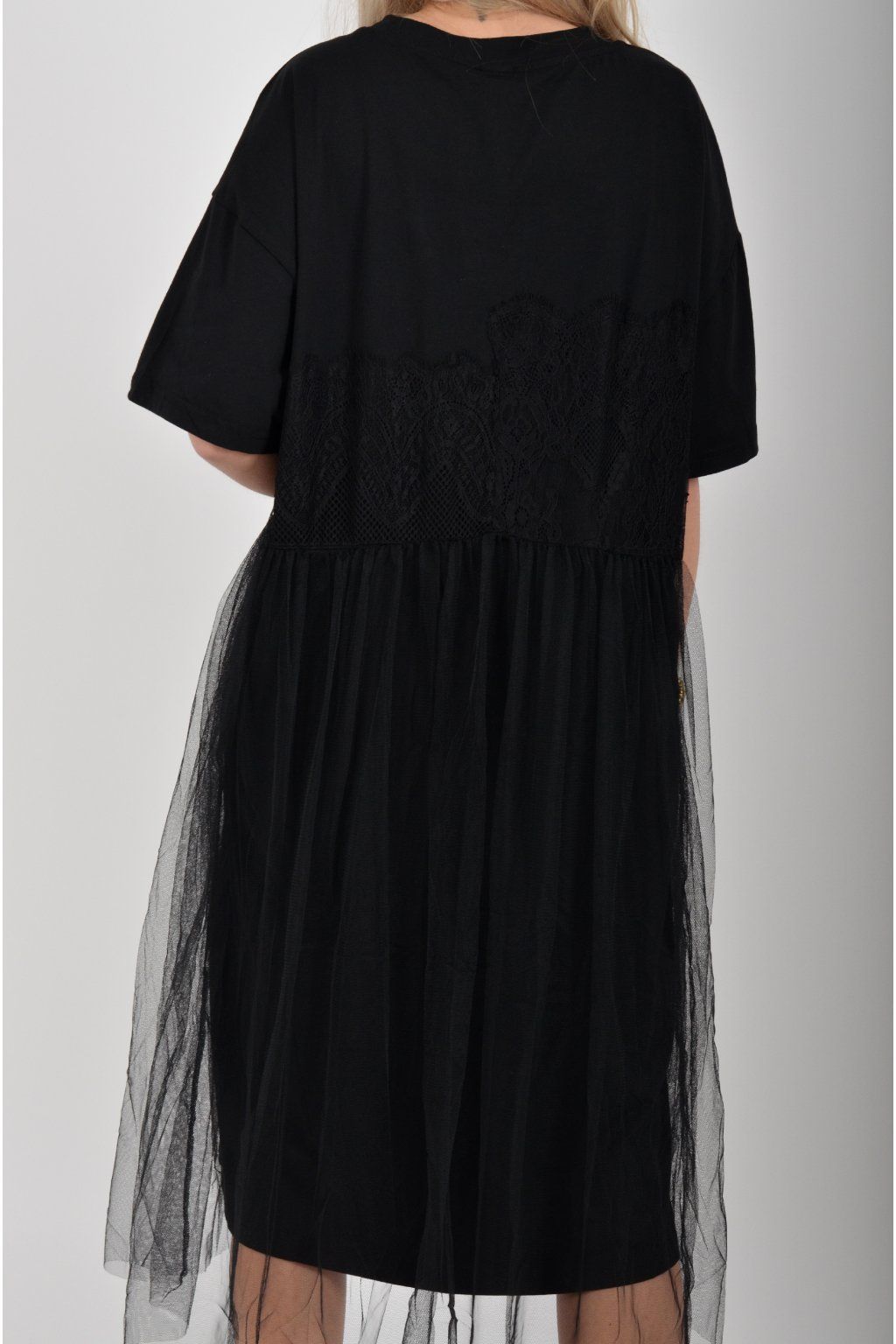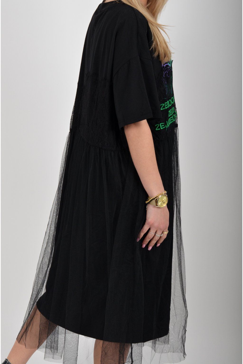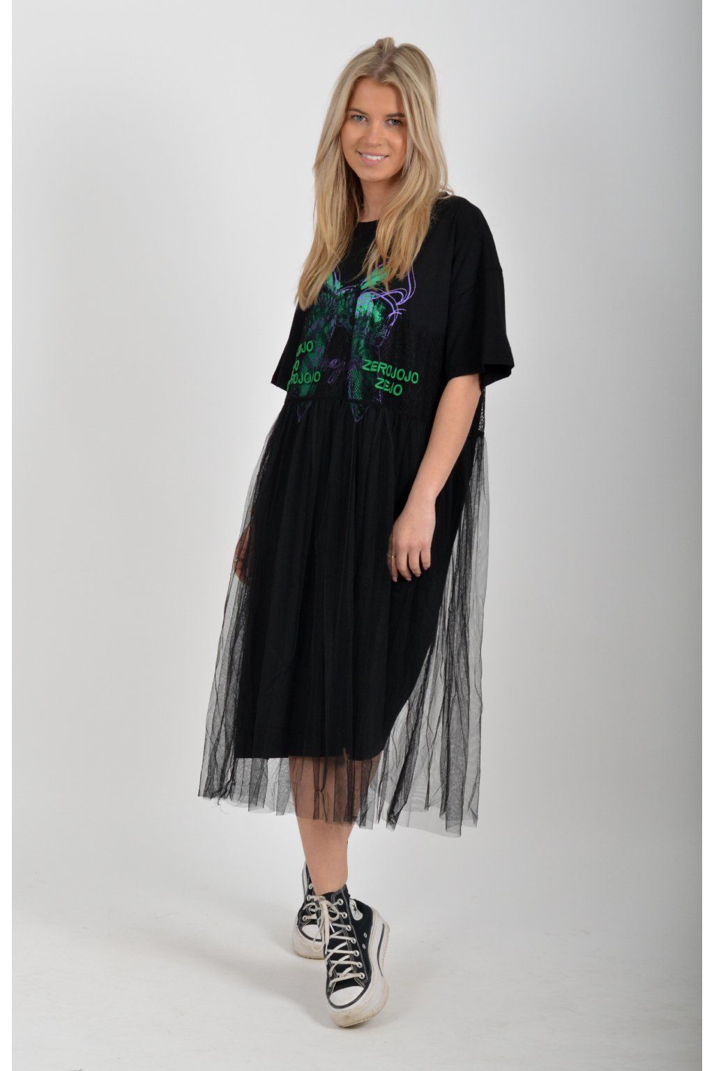 Černé atypické bavlněné šaty s potiskem a našitým vzorem. Šaty jsou áčkového střihu a mají přes bavlněný spodek našitou šifonovou sukni. Jsou vyrobeny z velice příjemného materiálu,