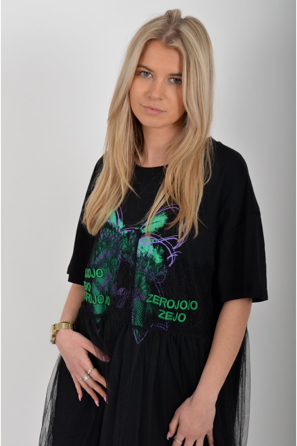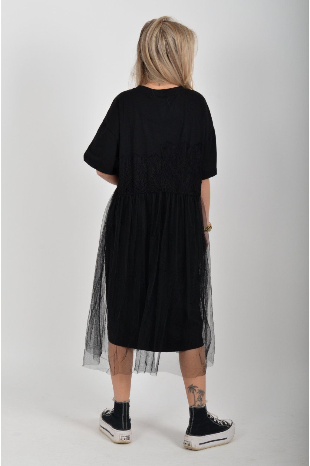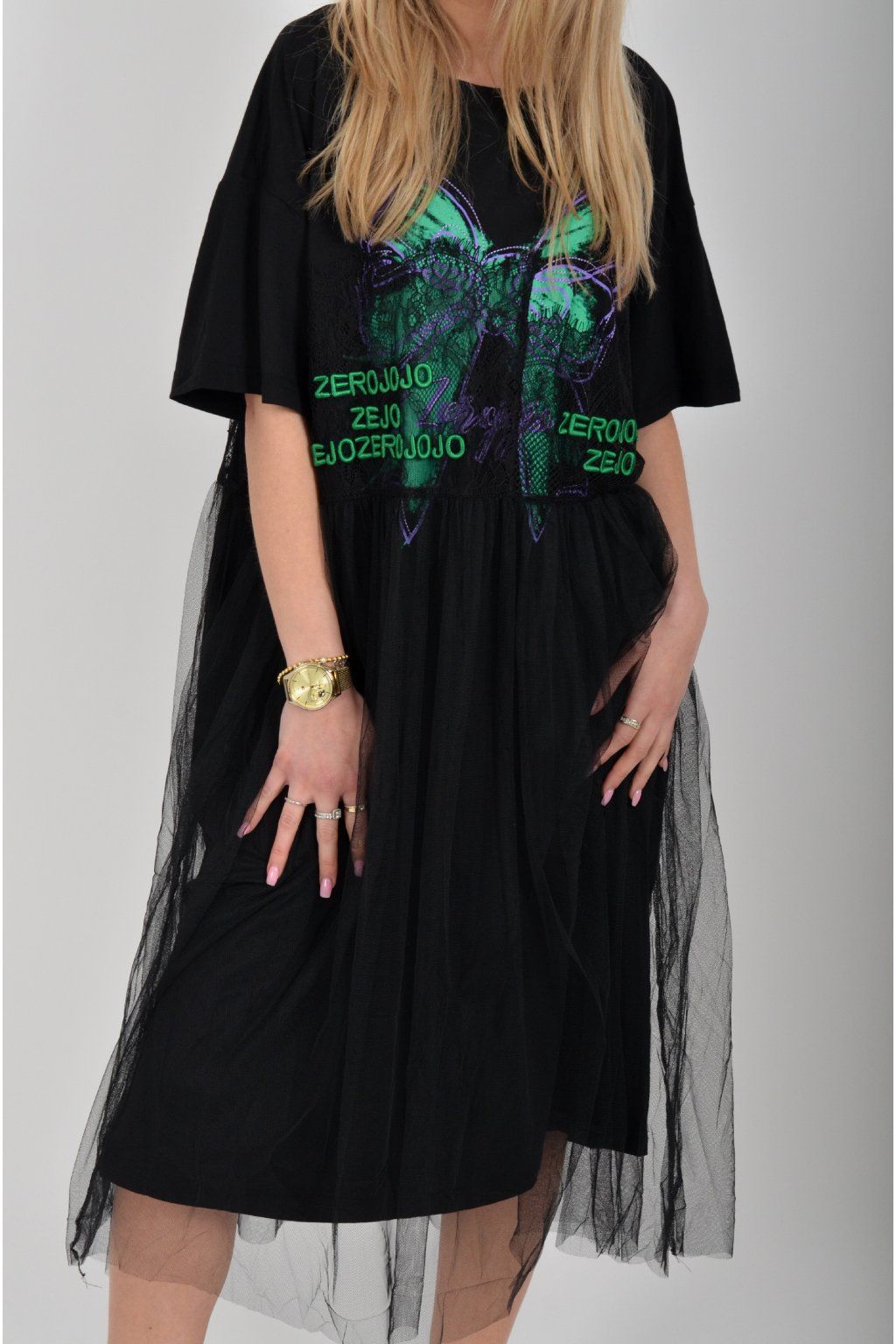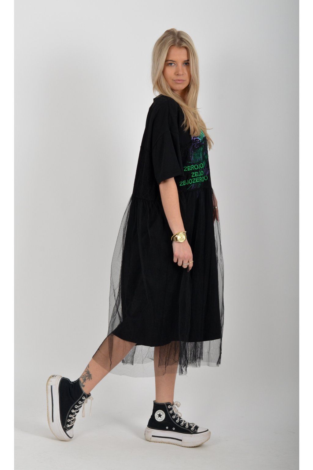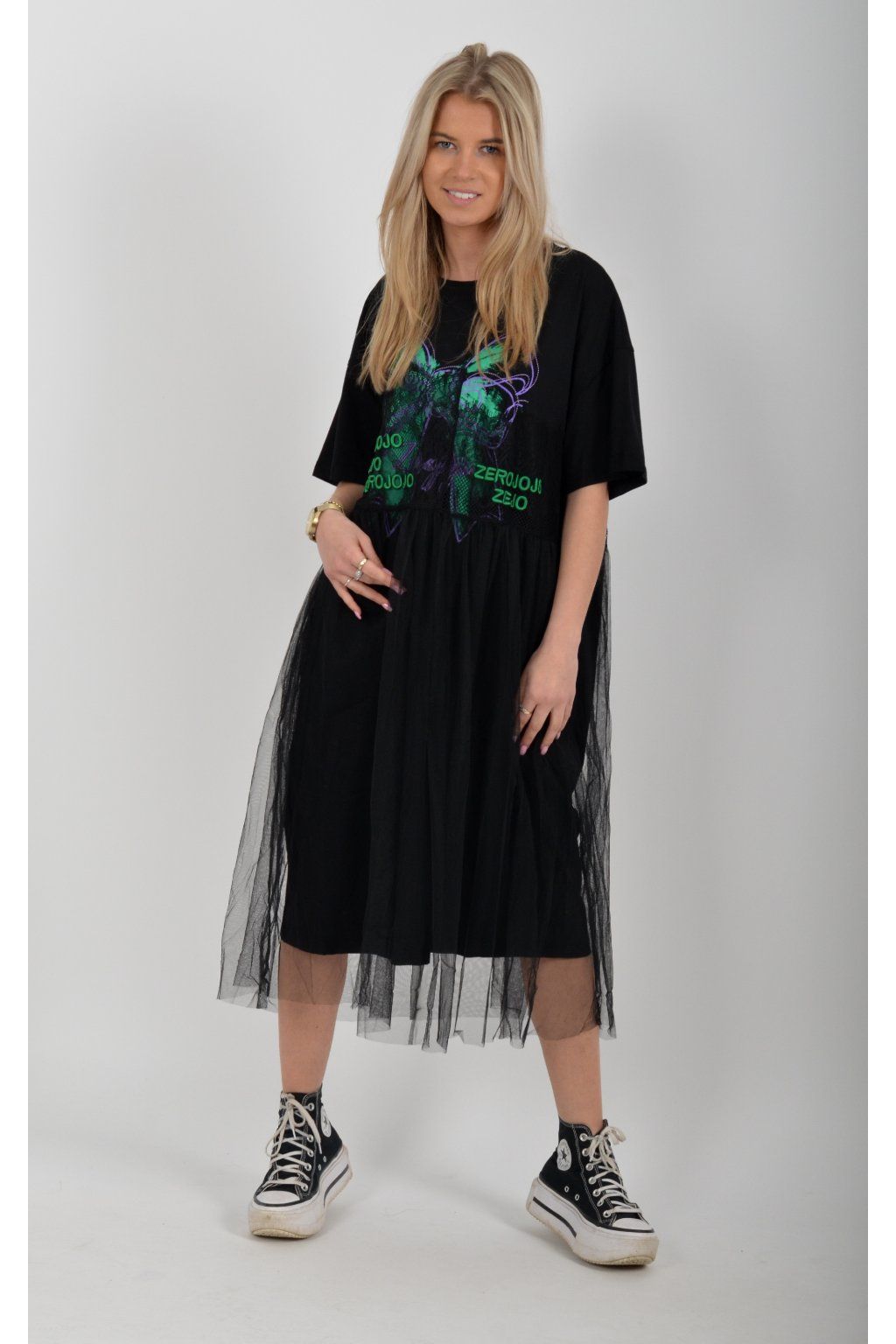 Černé atypické bavlněné šaty s potiskem a našitým vzorem. Šaty jsou áčkového střihu a mají přes bavlněný spodek našitou šifonovou sukni. Jsou vyrobeny z velice příjemného materiálu,