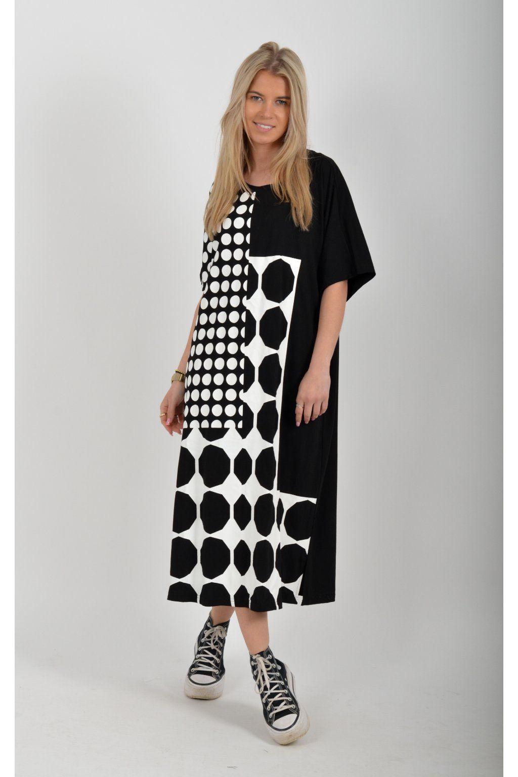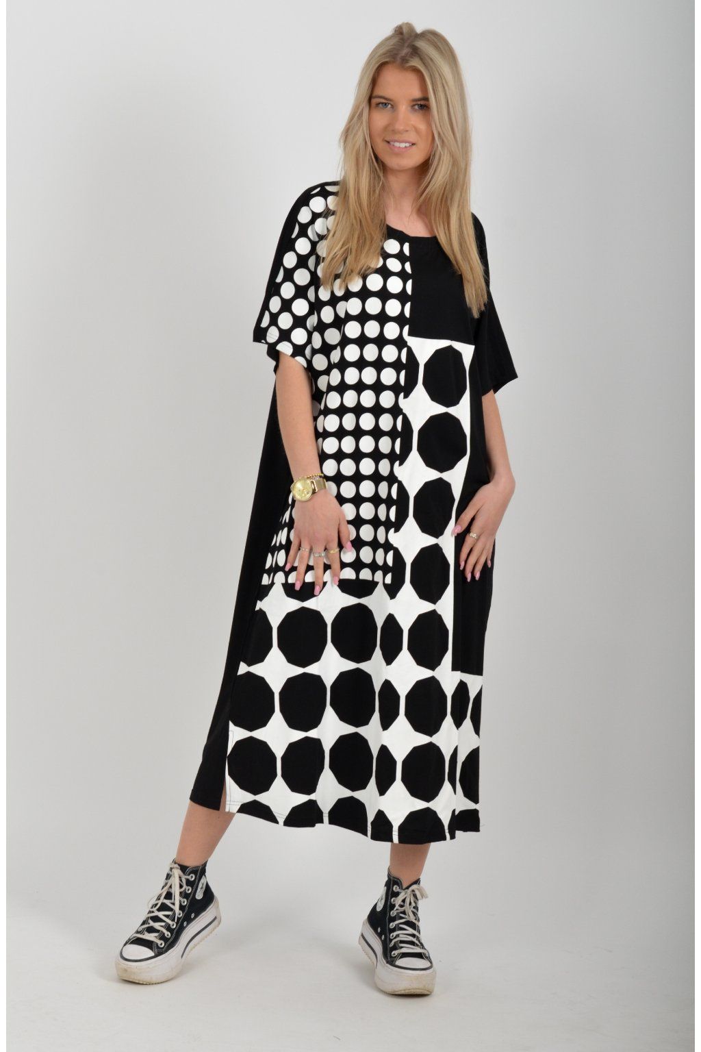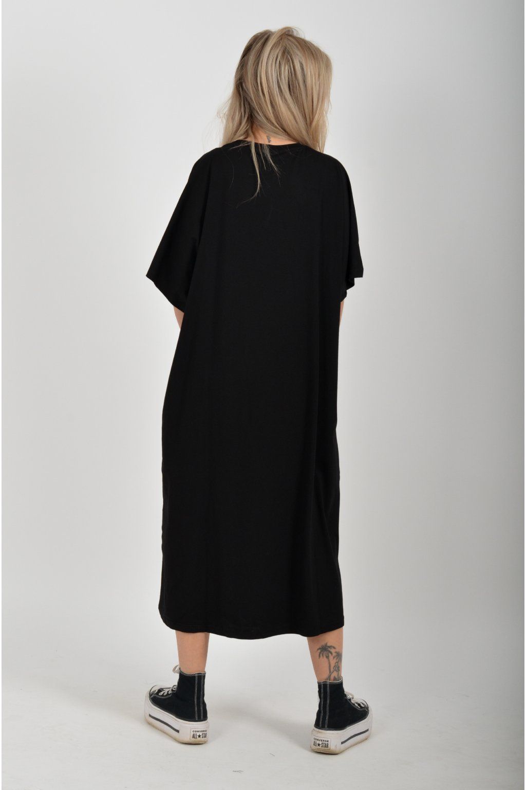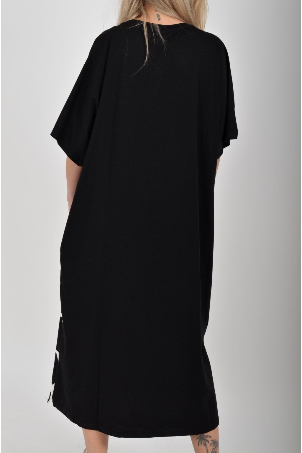 Černé atypické bavlněné šaty s potiskem a kapsami na bocích. Šaty jsou lehce áčkového střihu a mají rozparky. Jsou vyrobeny z velice příjemného materiálu