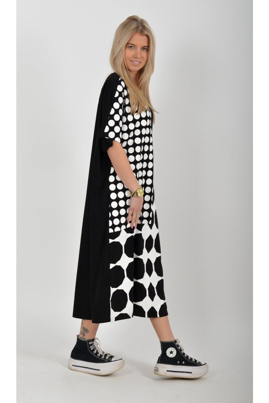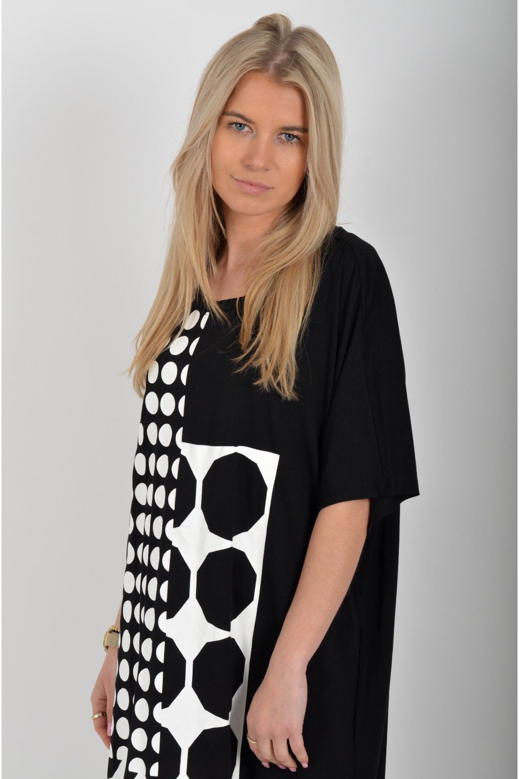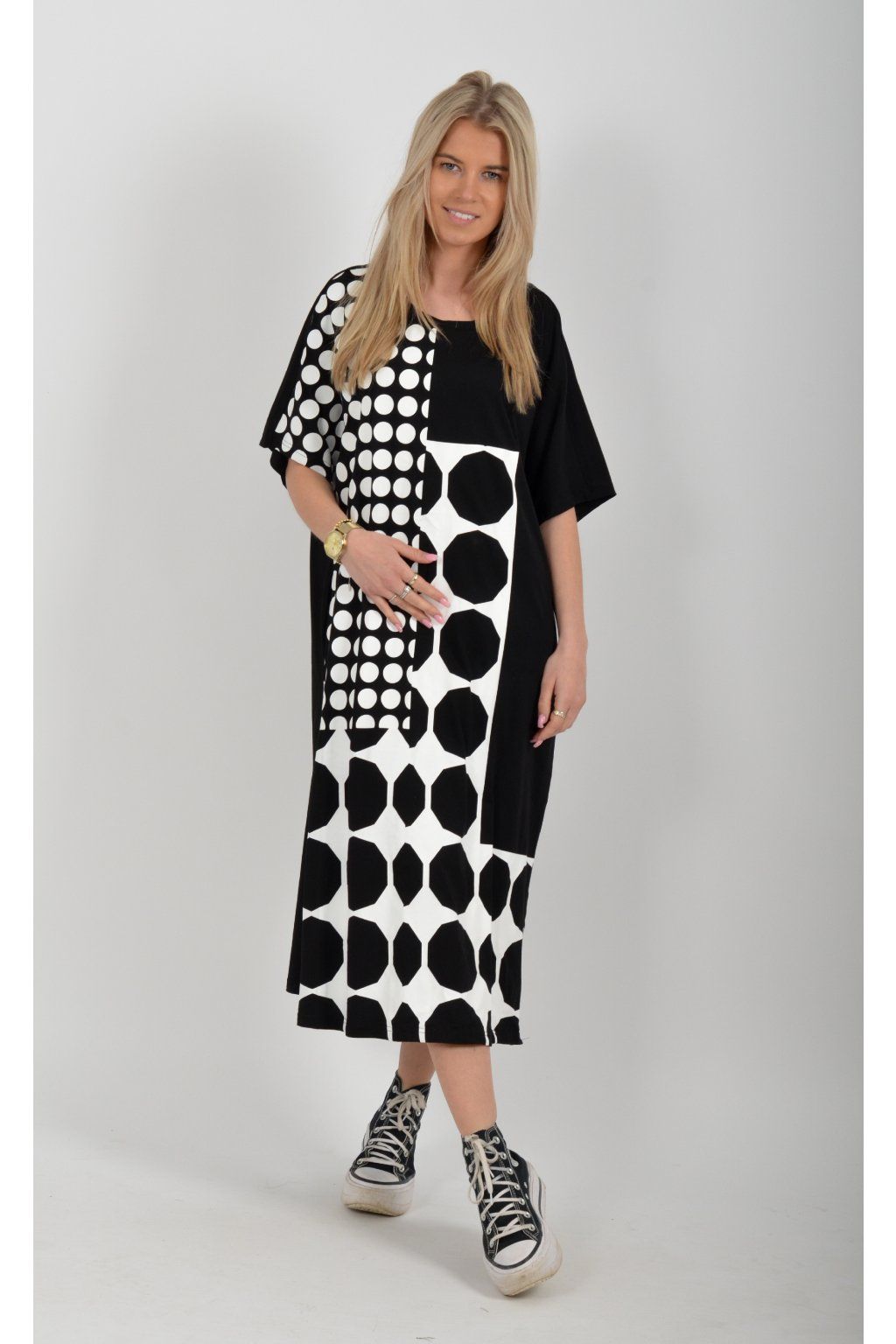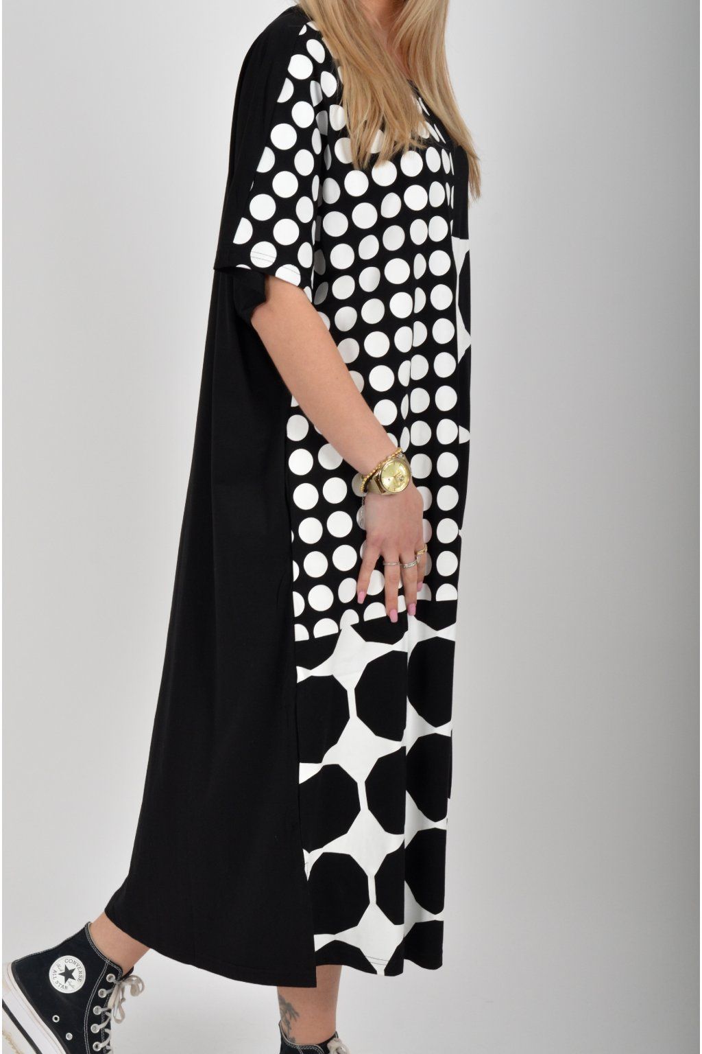 Černé atypické bavlněné šaty s potiskem a kapsami na bocích. Šaty jsou lehce áčkového střihu a mají rozparky. Jsou vyrobeny z velice příjemného materiálu