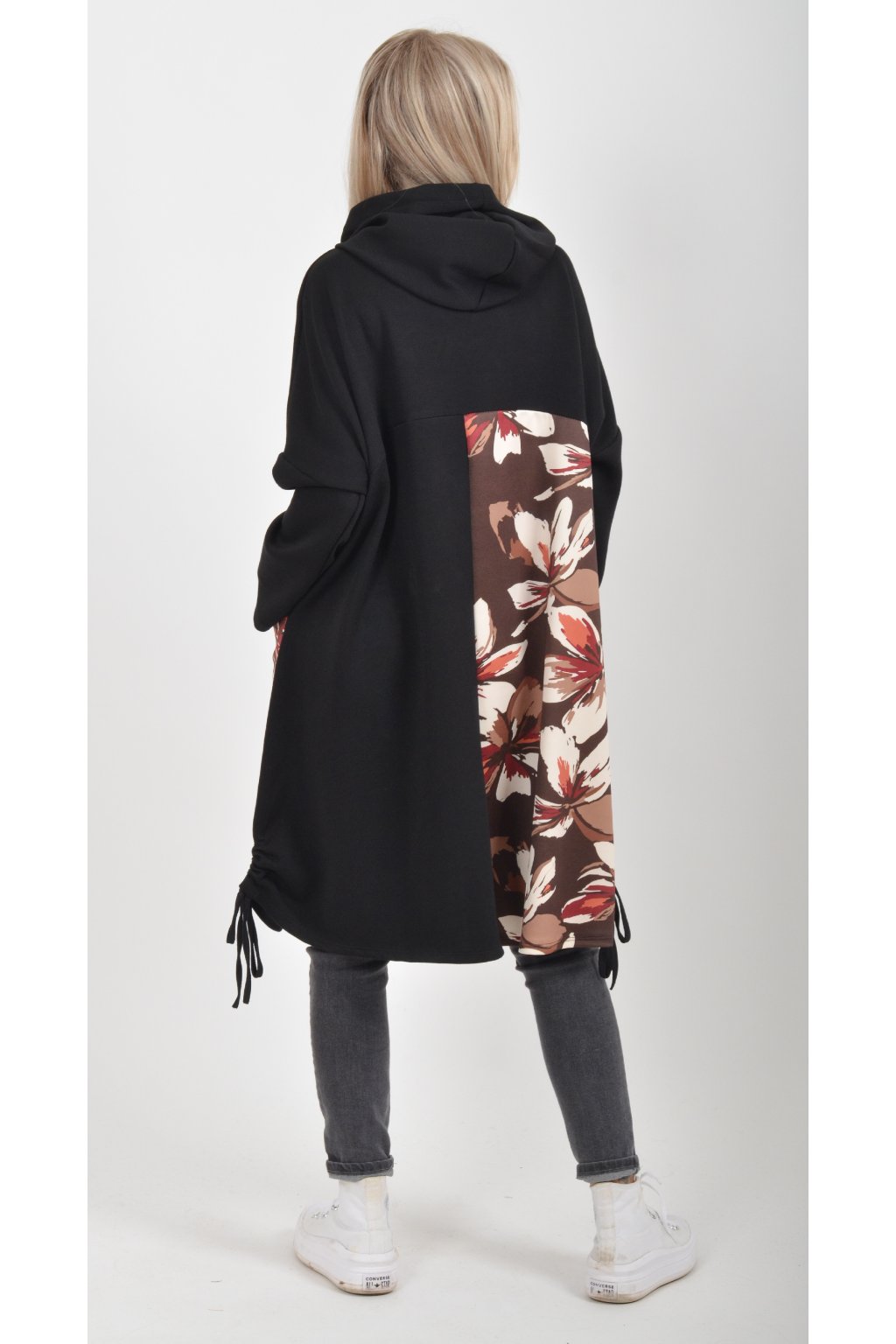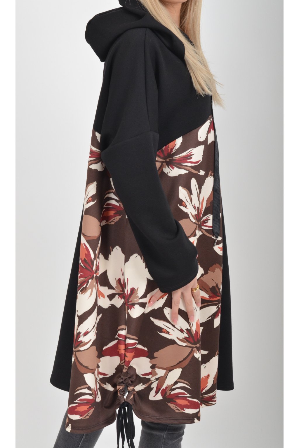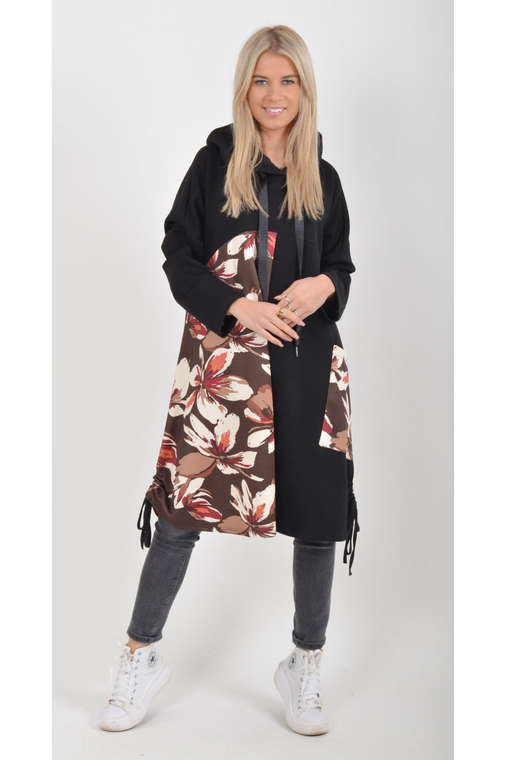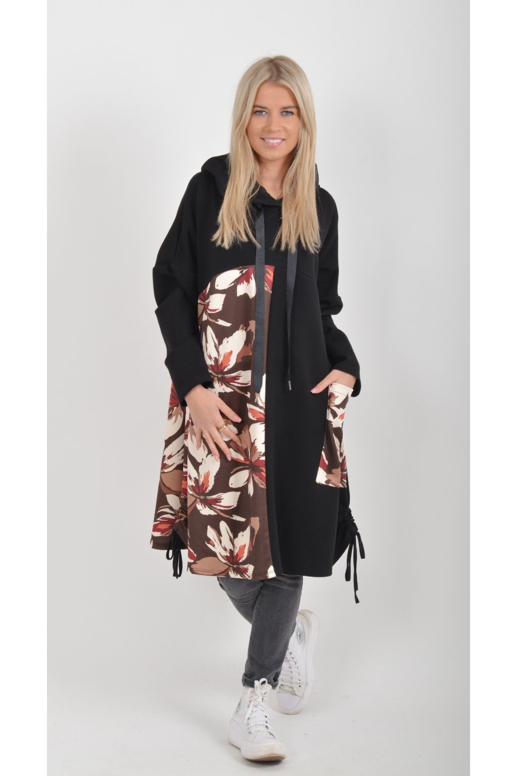 Zajímavé lehce zateplené šaty s barevným vzorem. Mají áčkový střih, kapuci a dlouhý rukáv. Materiál je velice příjemný na dotek. Ve spodní části na bocích je můžete pomocí šňůrky stáhnout.