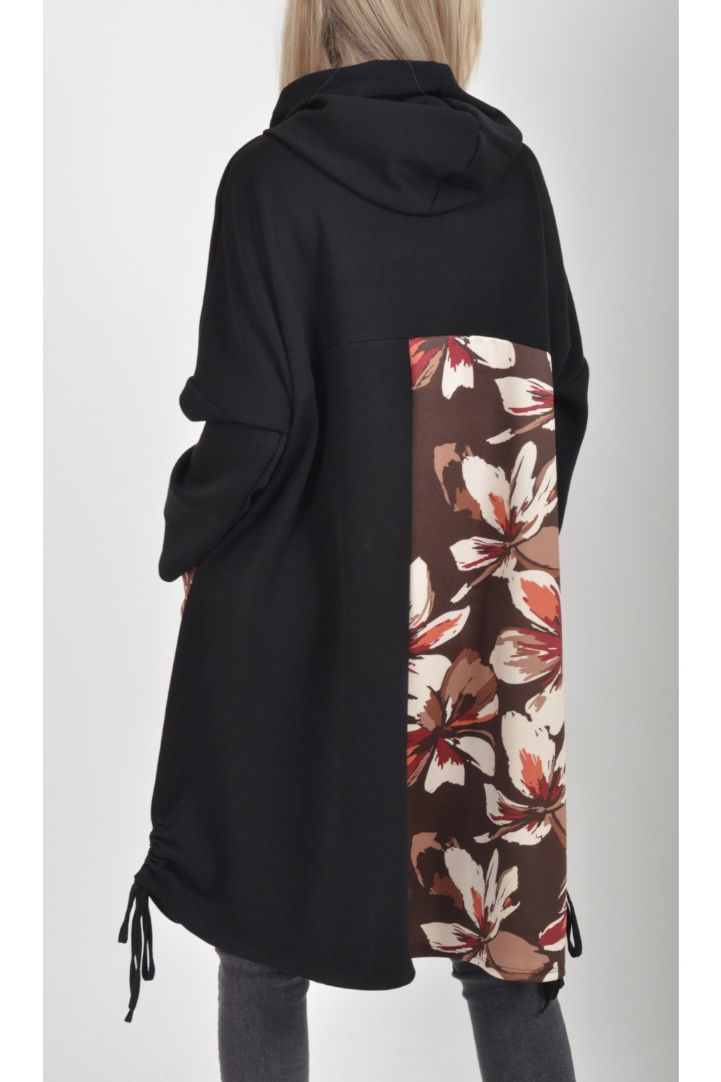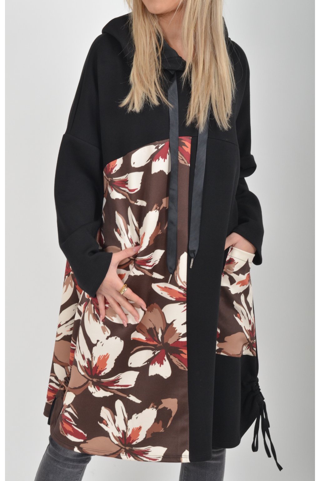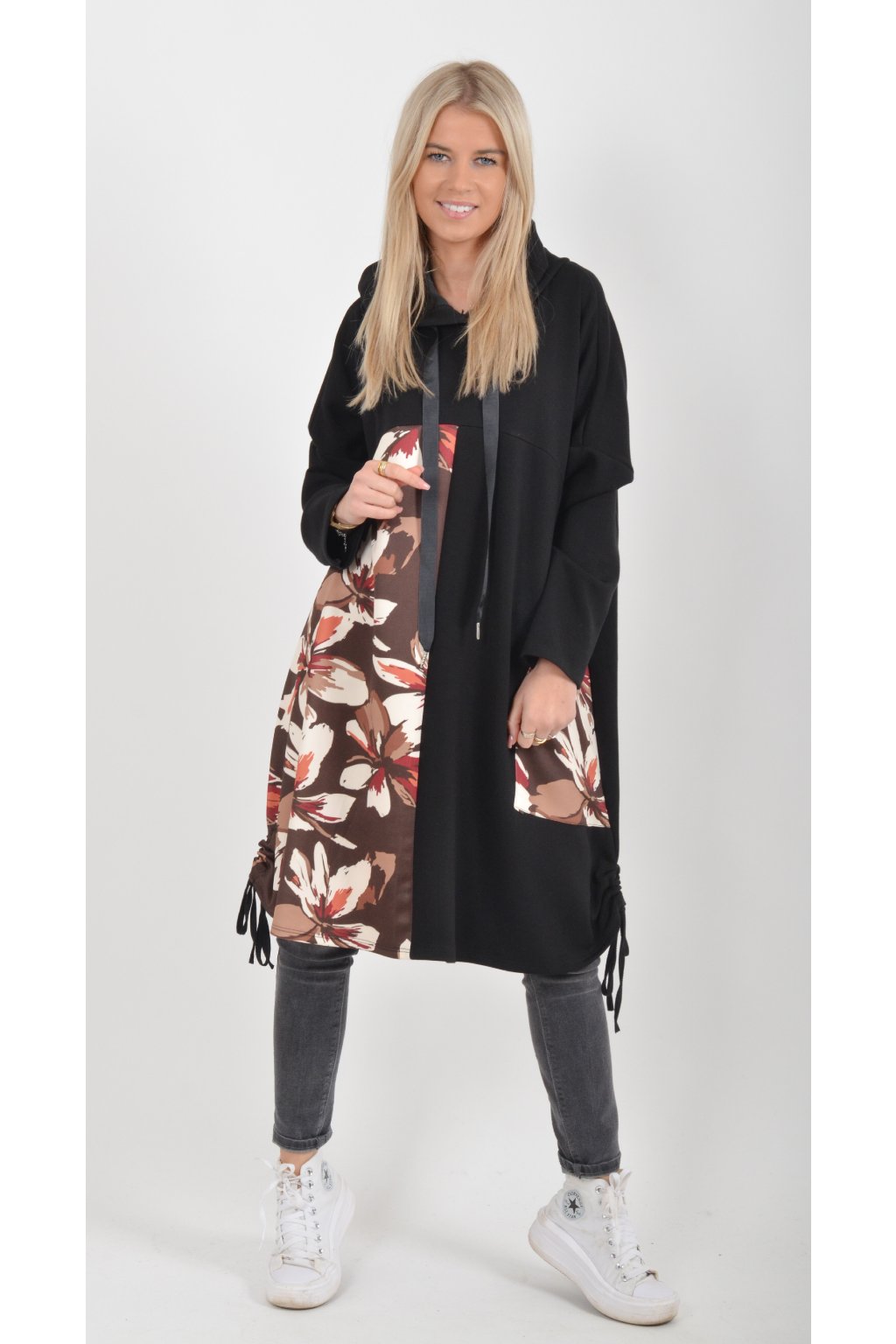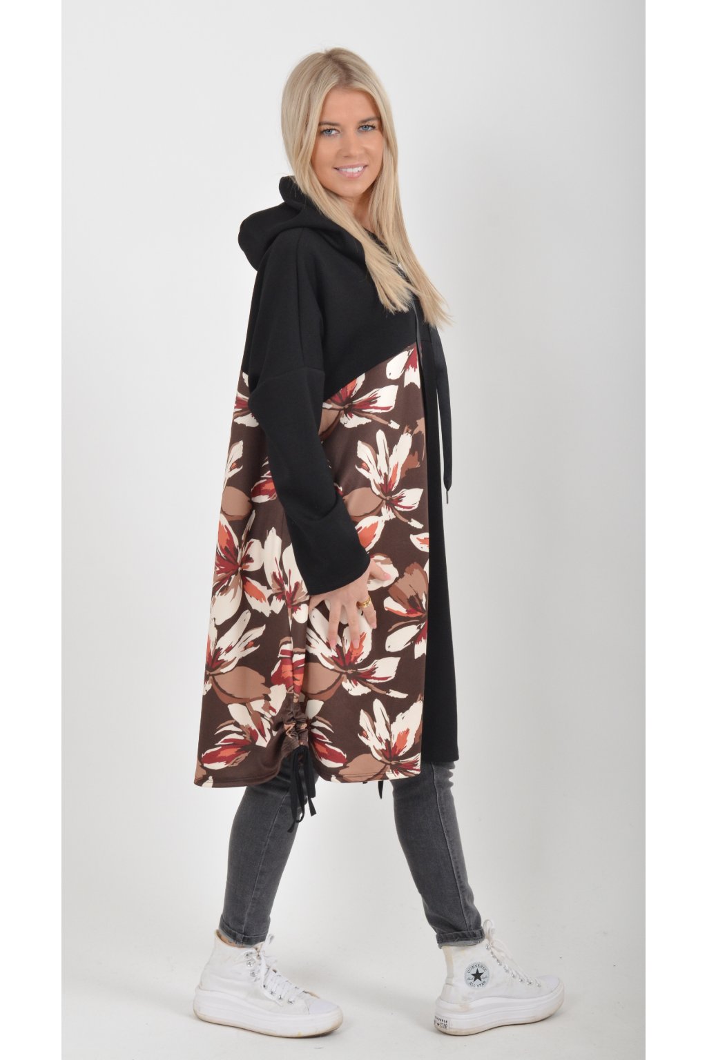 Zajímavé lehce zateplené šaty s barevným vzorem. Mají áčkový střih, kapuci a dlouhý rukáv. Materiál je velice příjemný na dotek. Ve spodní části na bocích je můžete pomocí šňůrky stáhnout.