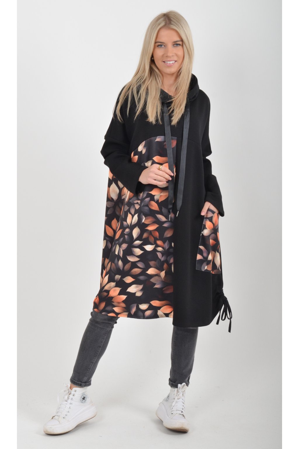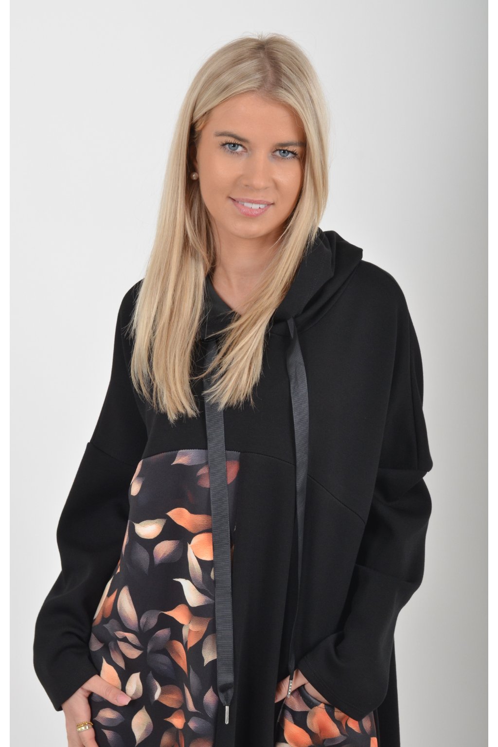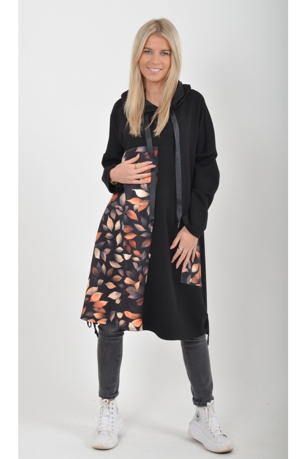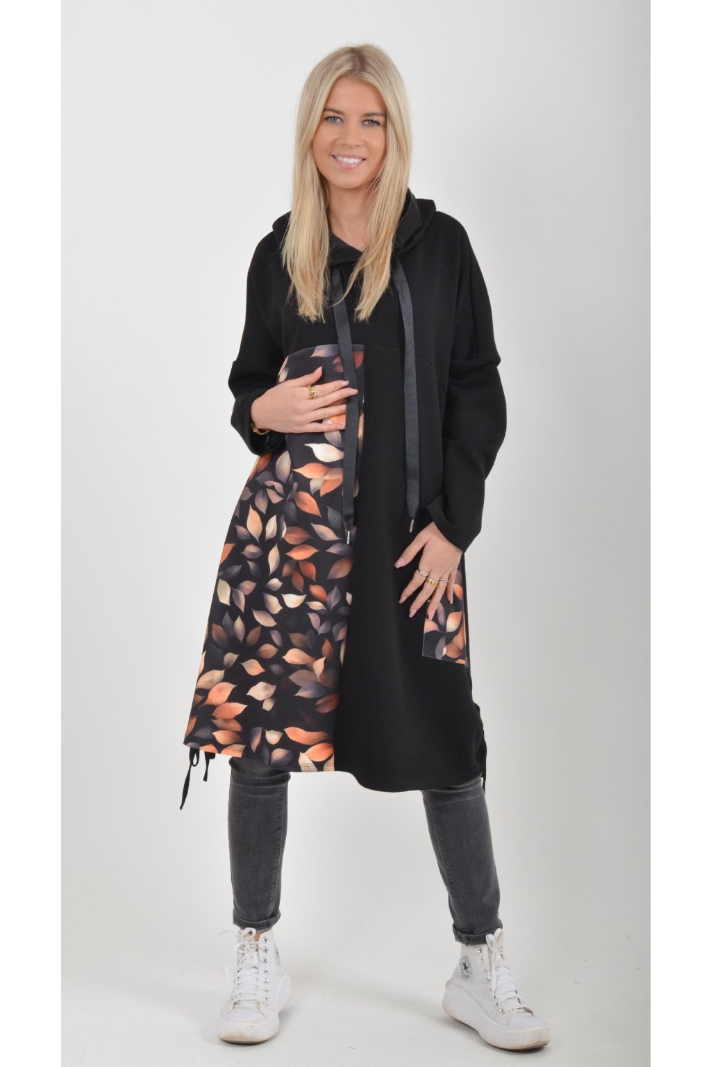 Zajímavé lehce zateplené šaty s barevným vzorem. Mají áčkový střih, kapuci a dlouhý rukáv. Materiál je velice příjemný na dotek. Ve spodní části na bocích je můžete pomocí šňůrky stáhnout.