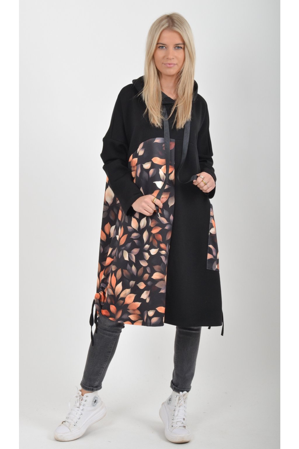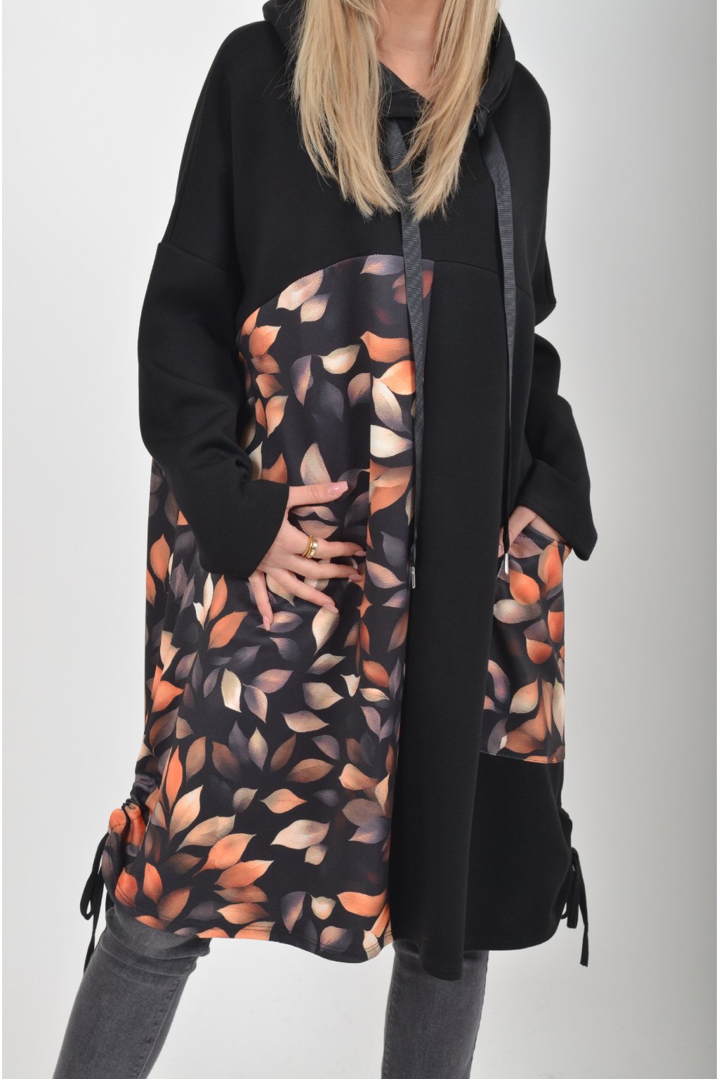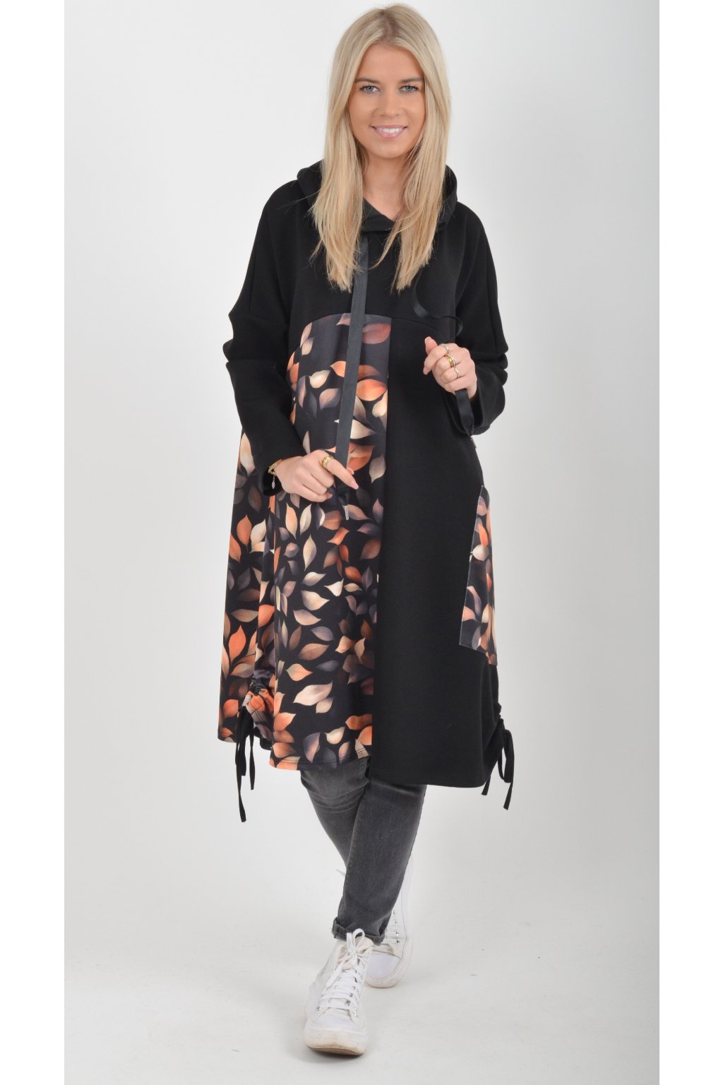 Zajímavé lehce zateplené šaty s barevným vzorem. Mají áčkový střih, kapuci a dlouhý rukáv. Materiál je velice příjemný na dotek. Ve spodní části na bocích je můžete pomocí šňůrky stáhnout.