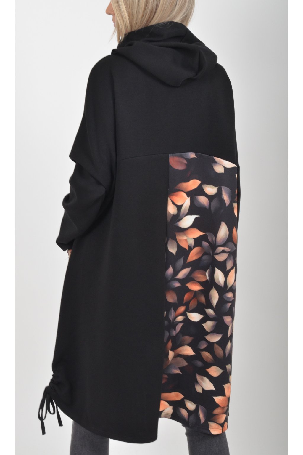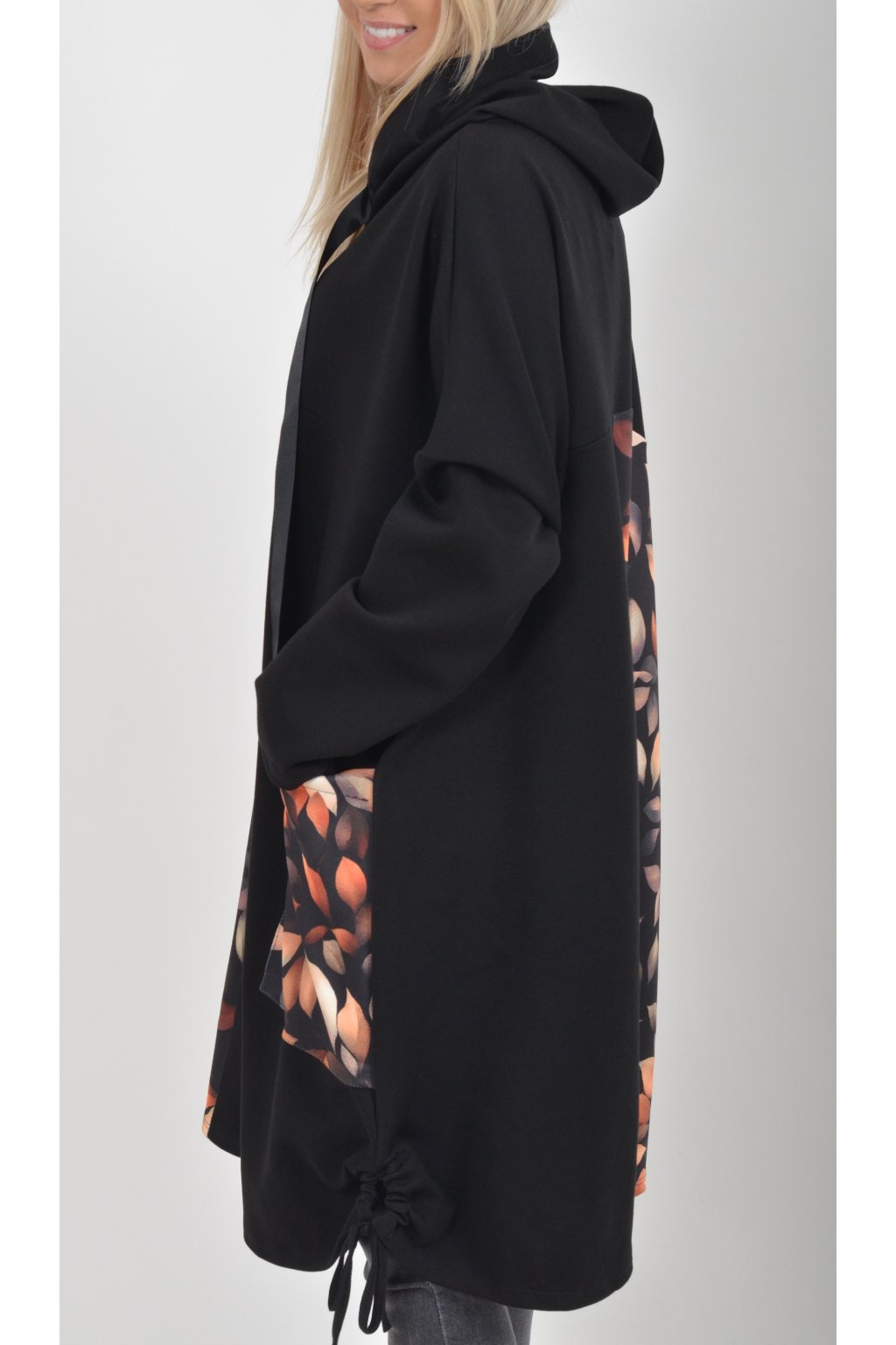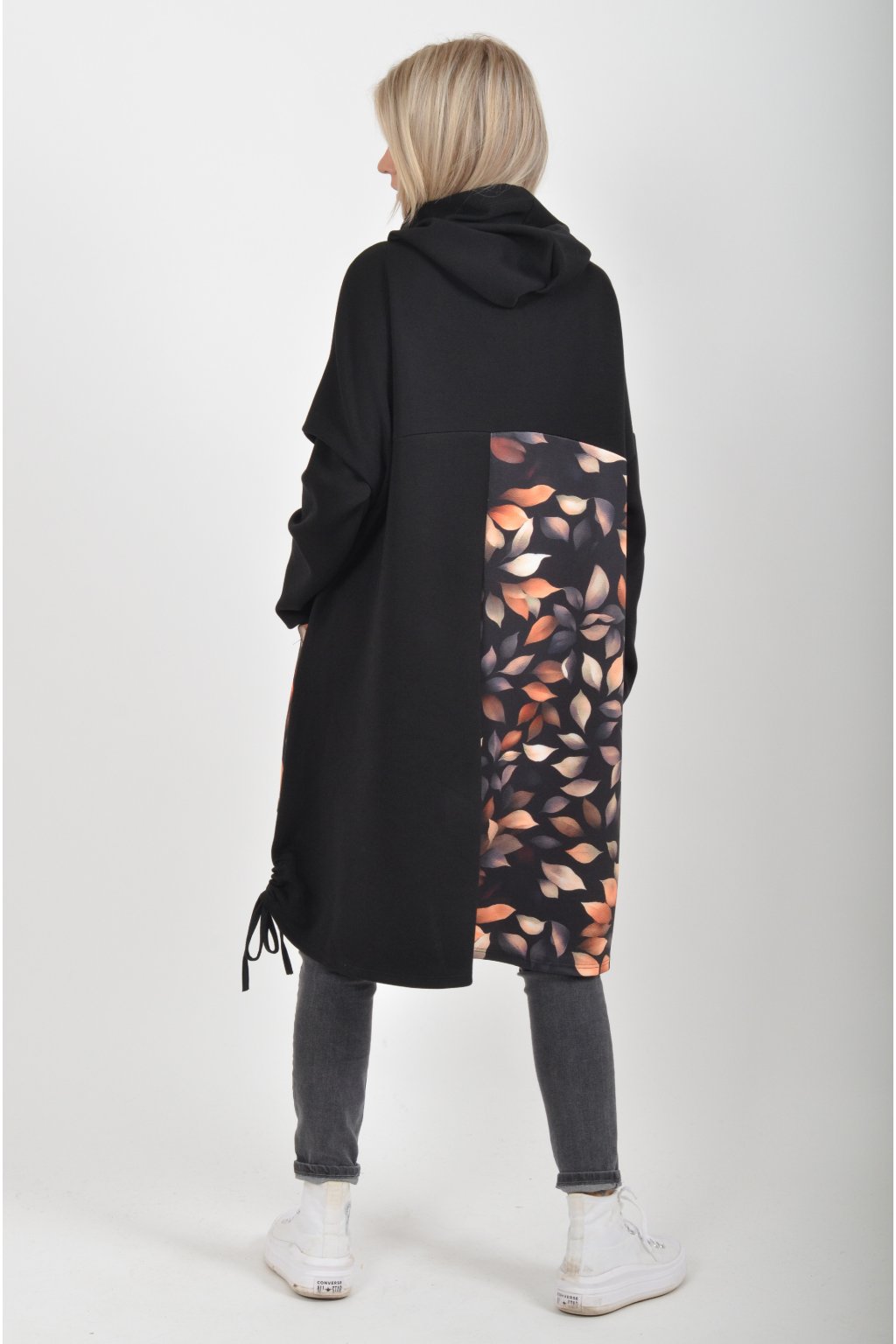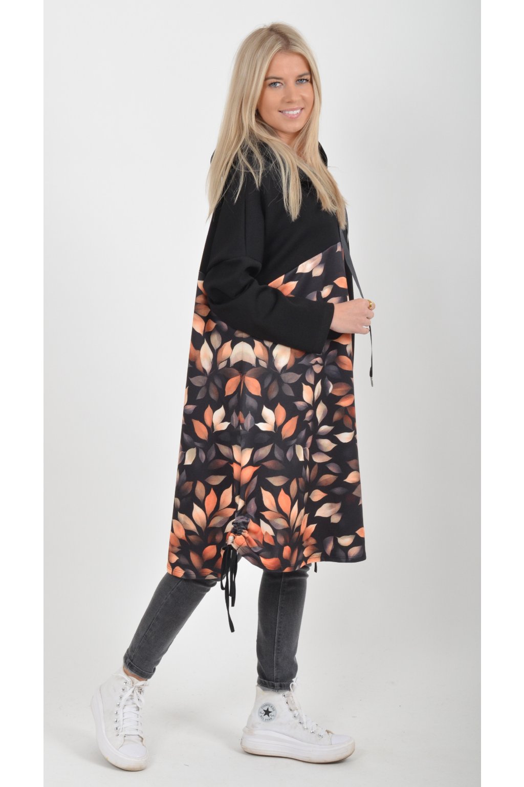 Zajímavé lehce zateplené šaty s barevným vzorem. Mají áčkový střih, kapuci a dlouhý rukáv. Materiál je velice příjemný na dotek. Ve spodní části na bocích je můžete pomocí šňůrky stáhnout.