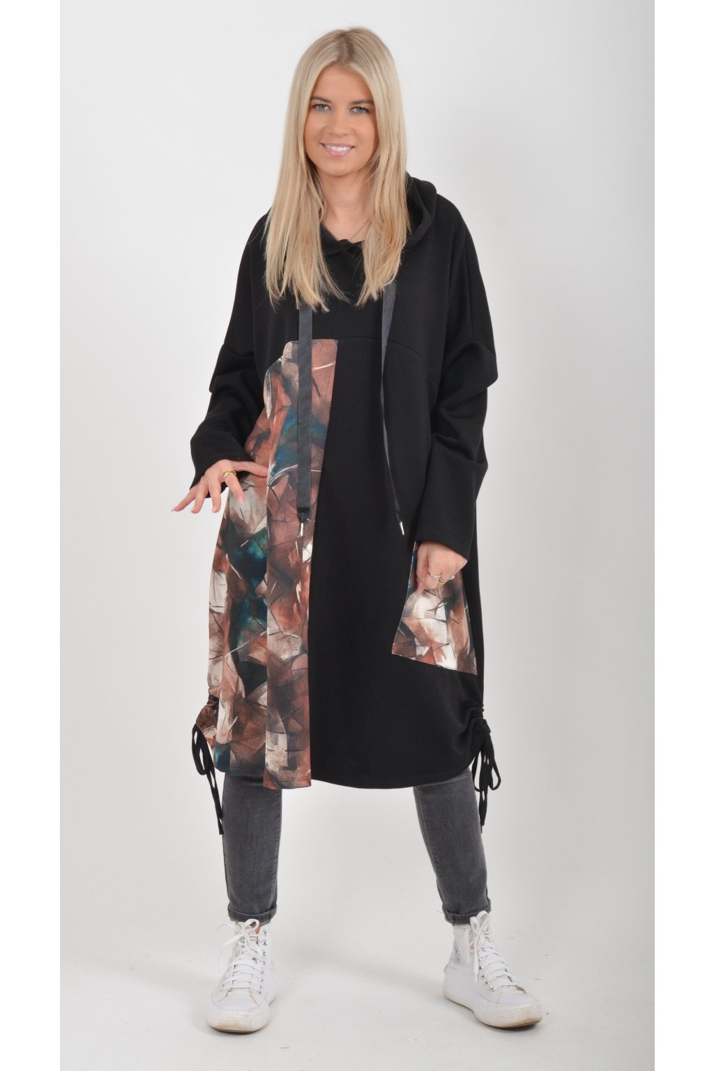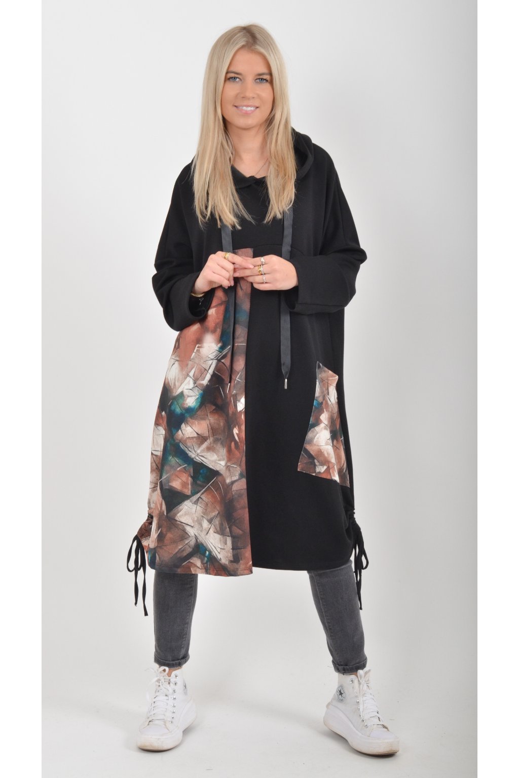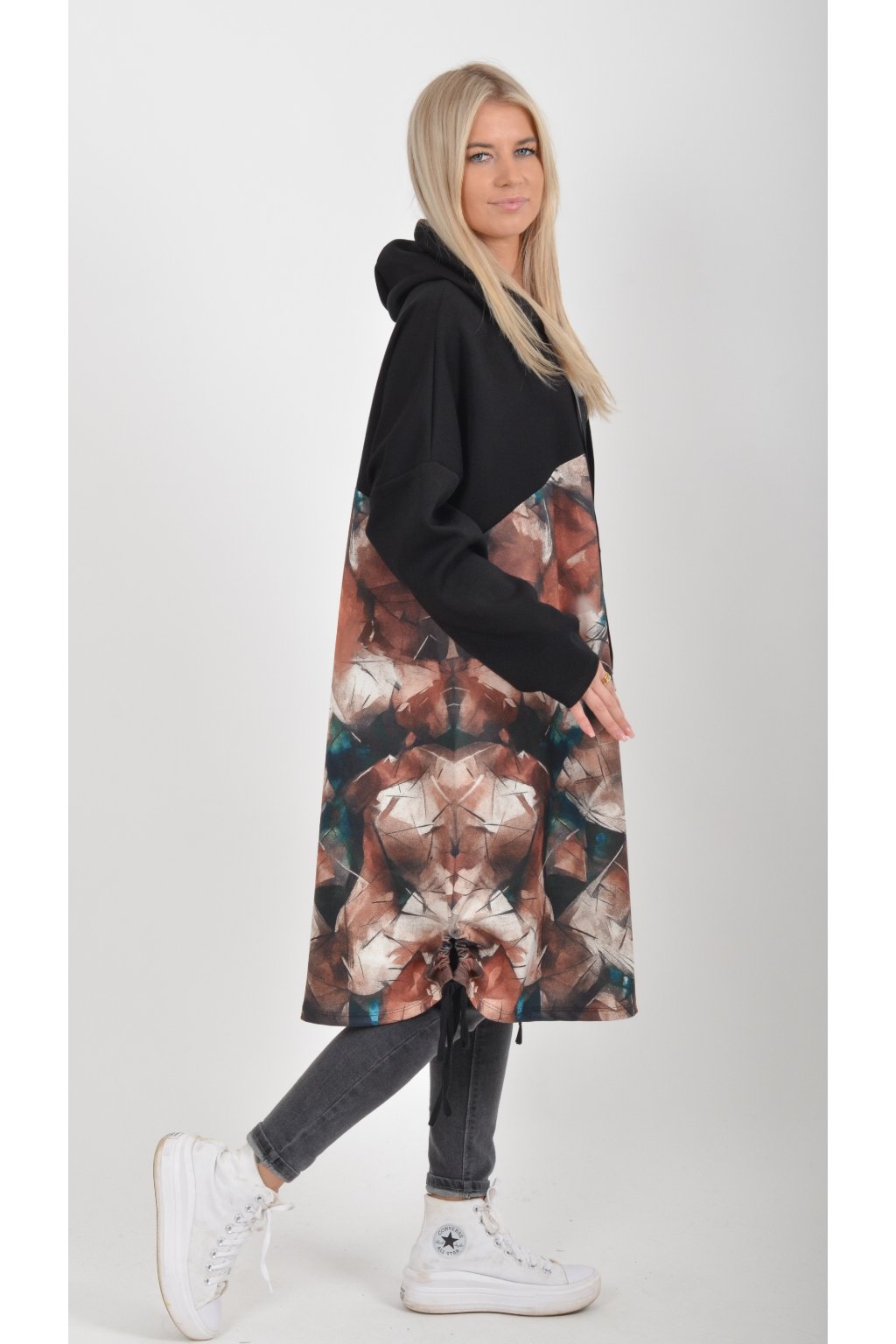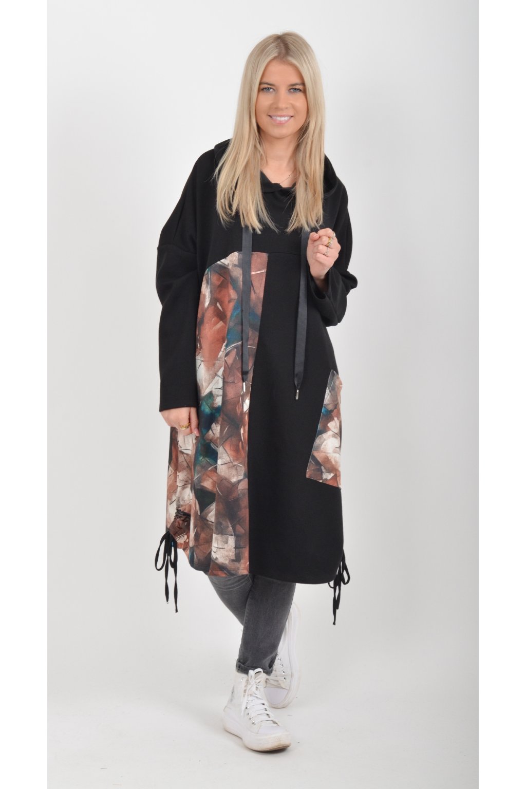 Zajímavé lehce zateplené šaty s barevným vzorem. Mají áčkový střih, kapuci a dlouhý rukáv. Materiál je velice příjemný na dotek. Ve spodní části na bocích je můžete pomocí šňůrky stáhnout.