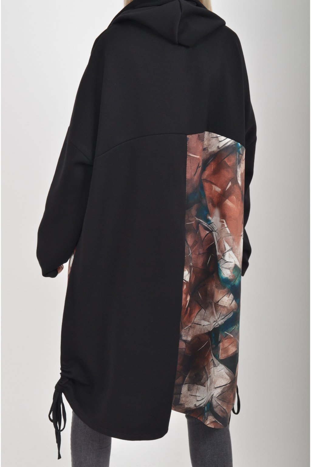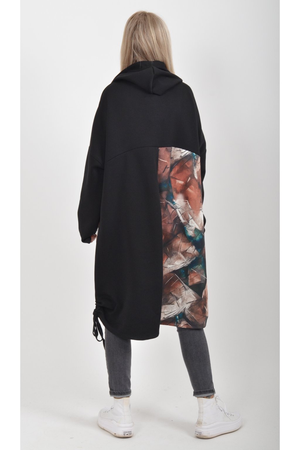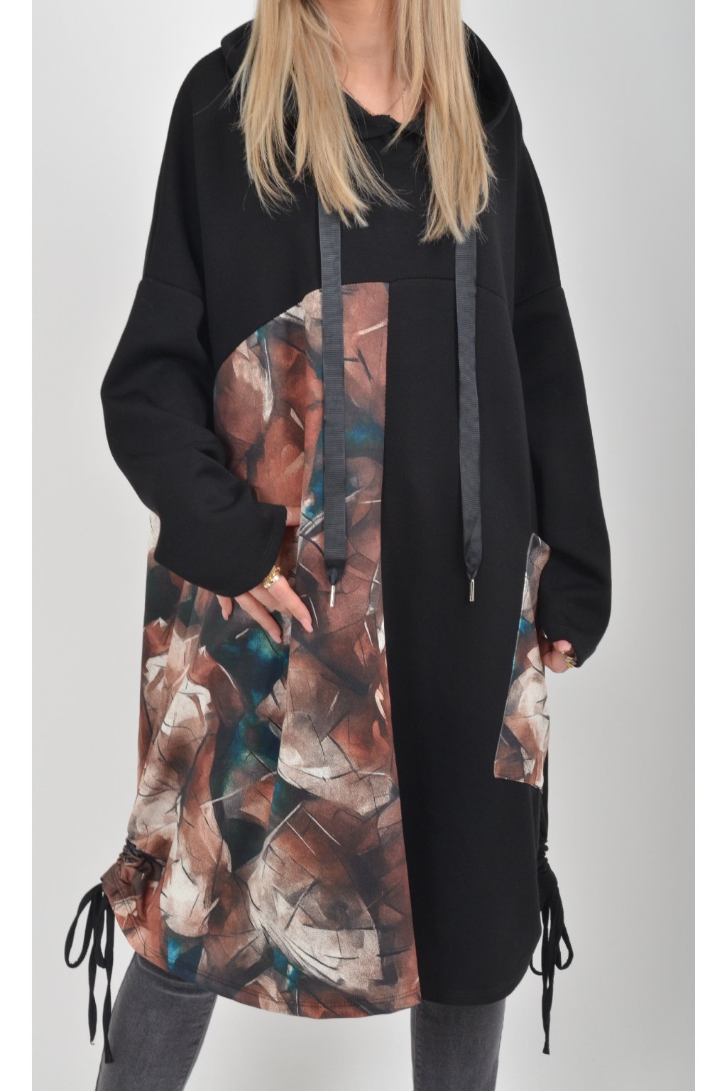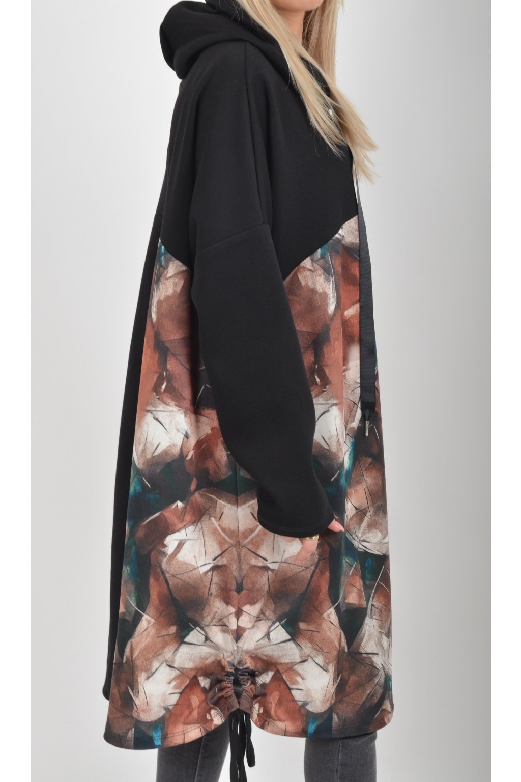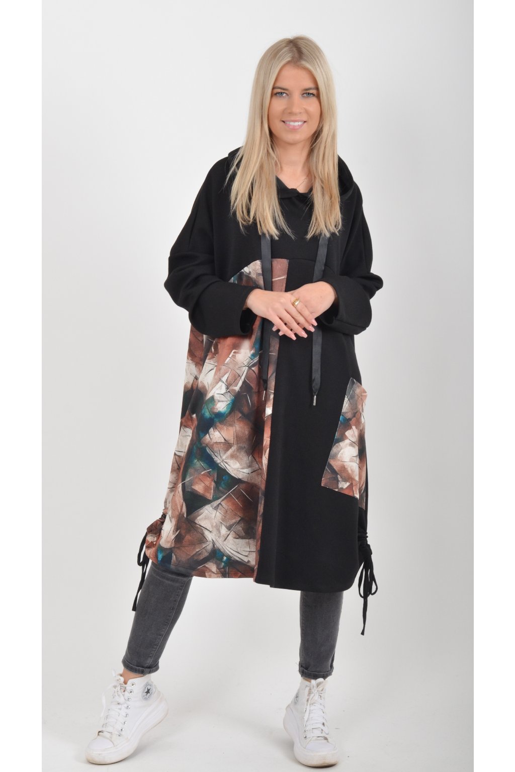 Zajímavé lehce zateplené šaty s barevným vzorem. Mají áčkový střih, kapuci a dlouhý rukáv. Materiál je velice příjemný na dotek. Ve spodní části na bocích je můžete pomocí šňůrky stáhnout.