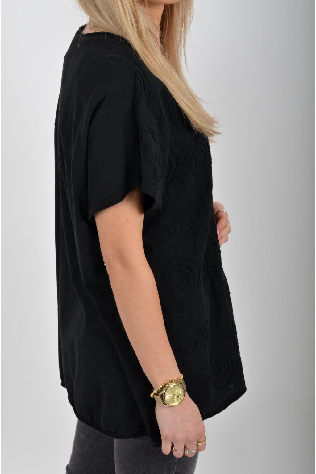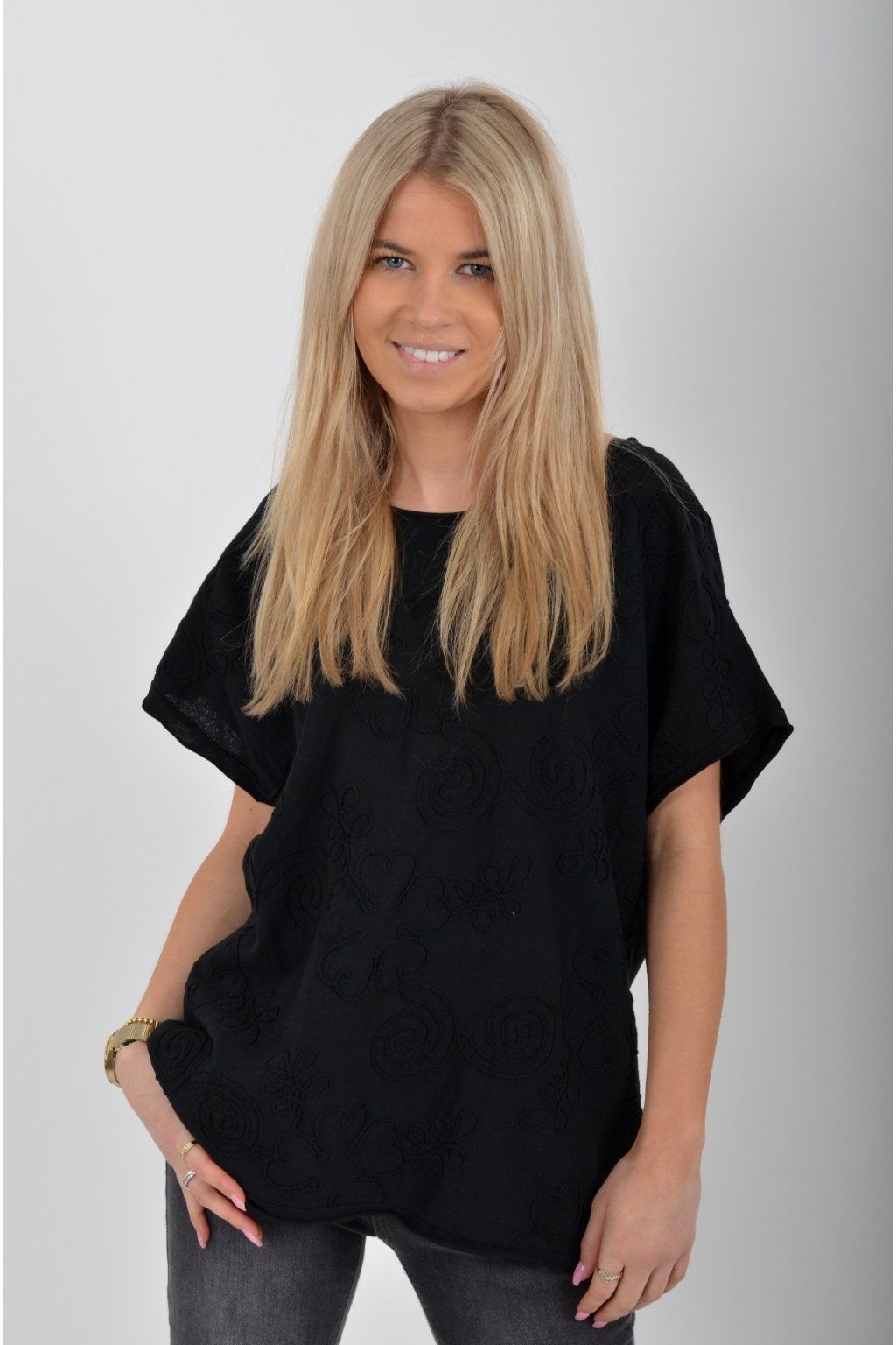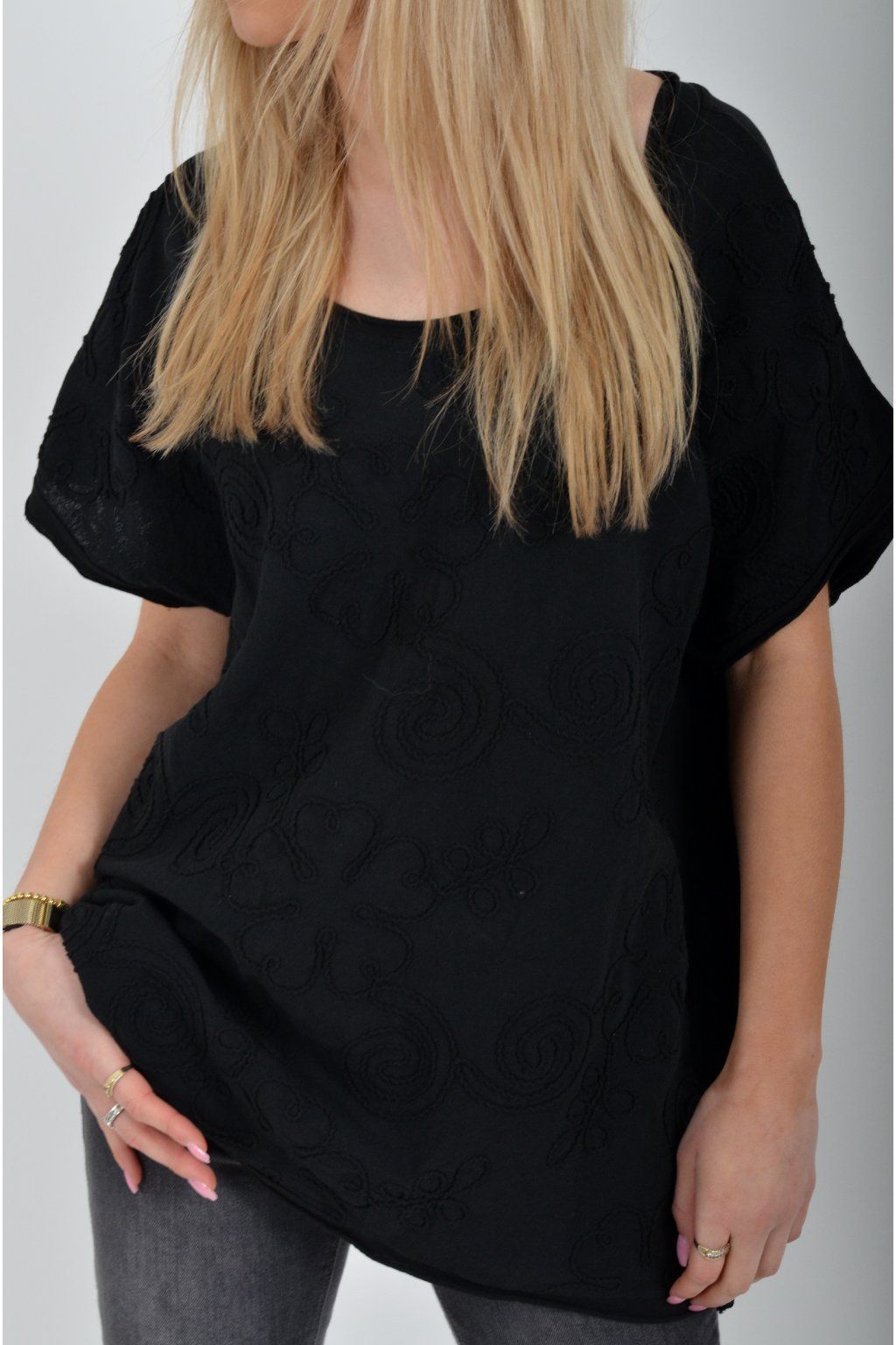 Jednobarevné tričko s krátkým rukávem a vyšívaným vzorem v přední části. Tričko je vyrobené z velice příjemné bavlny.