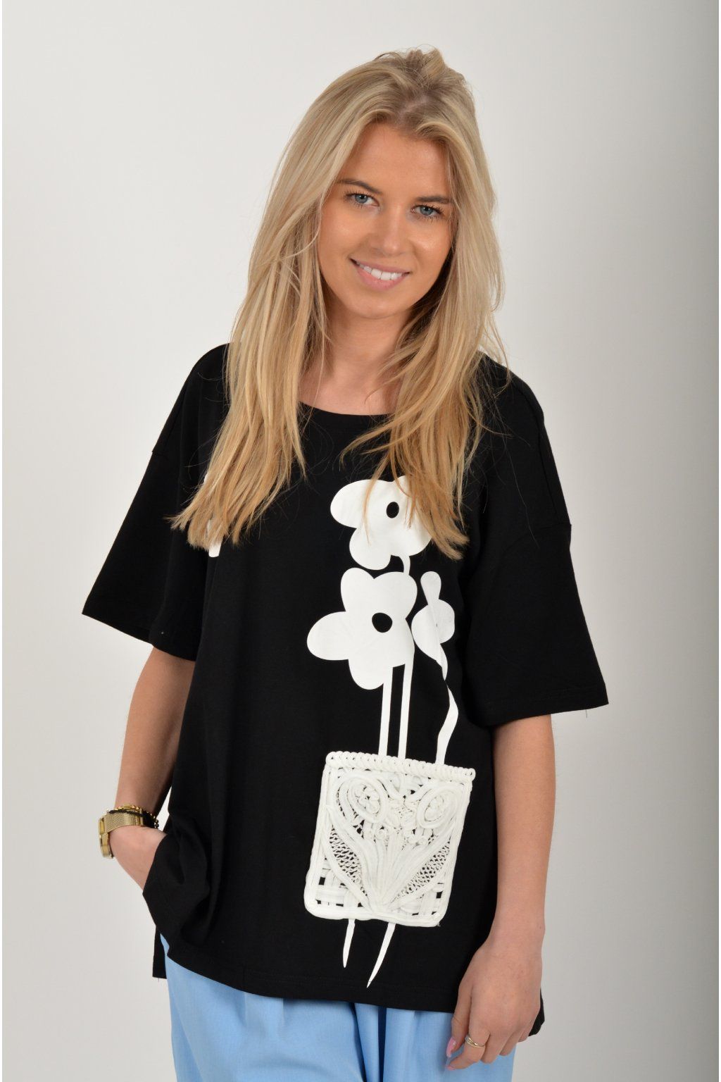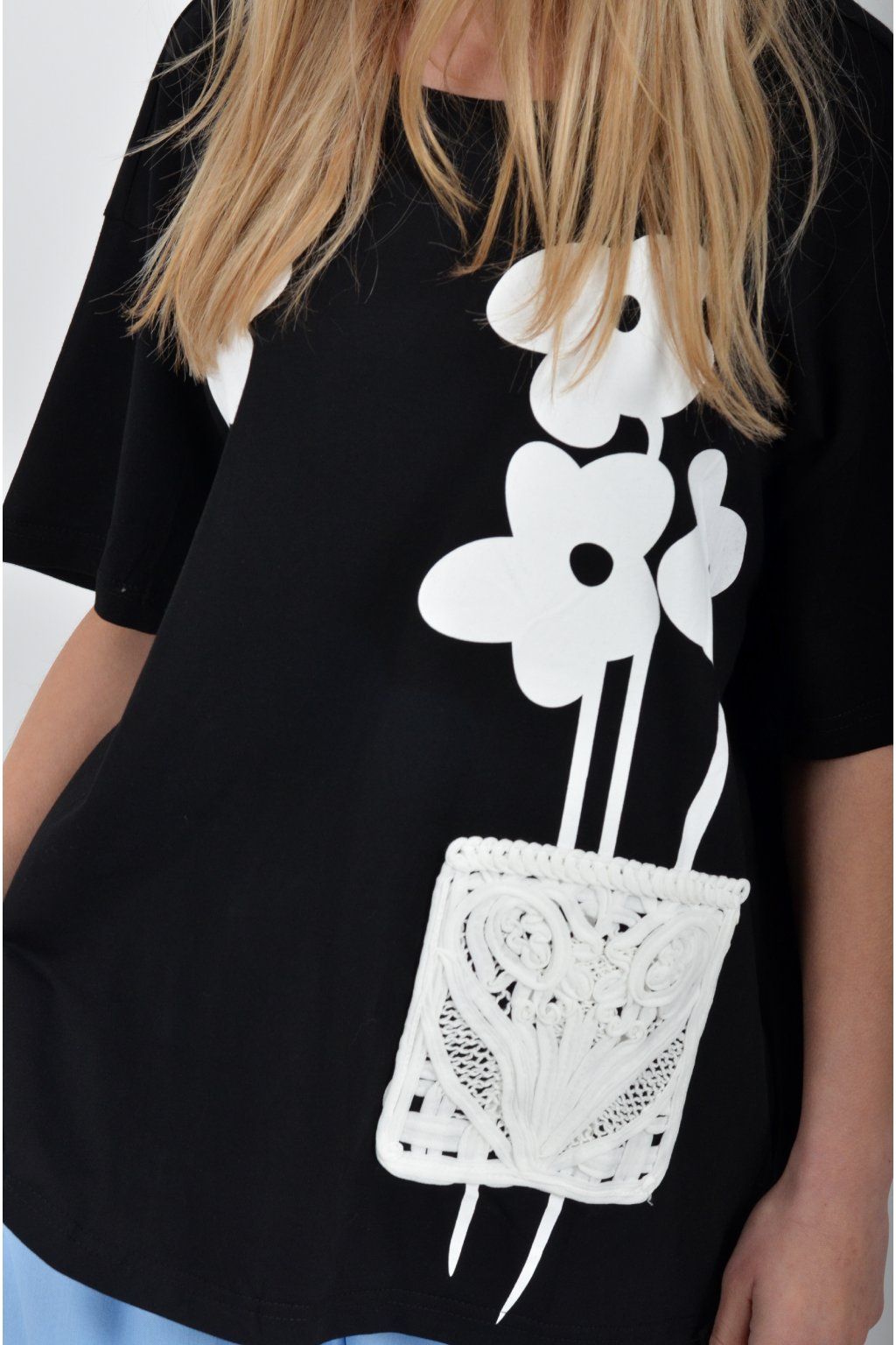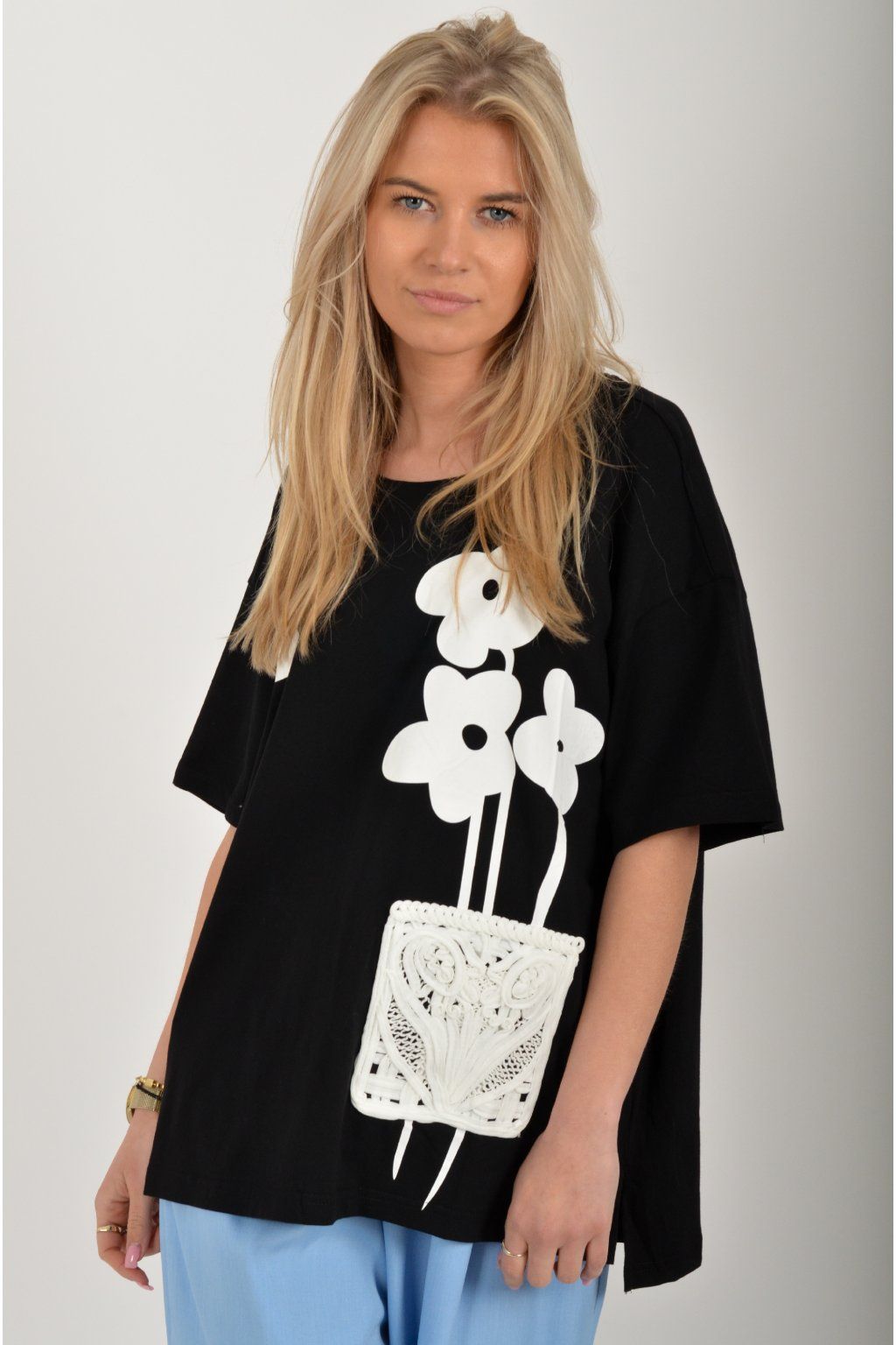 Atypické tričko s krátkým rukávem potiskem vyšívaným vzorem v přední části. Tričko je vyrobené z velice příjemné bavlny a na bocích má rozparky. Zadní část trička je delší než přední.