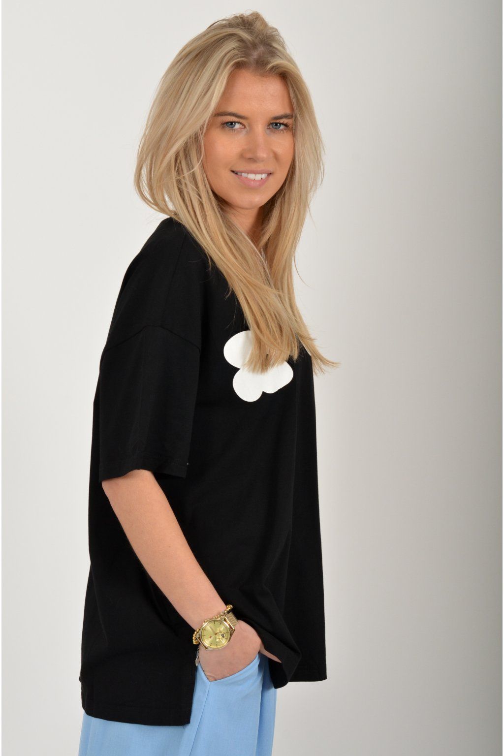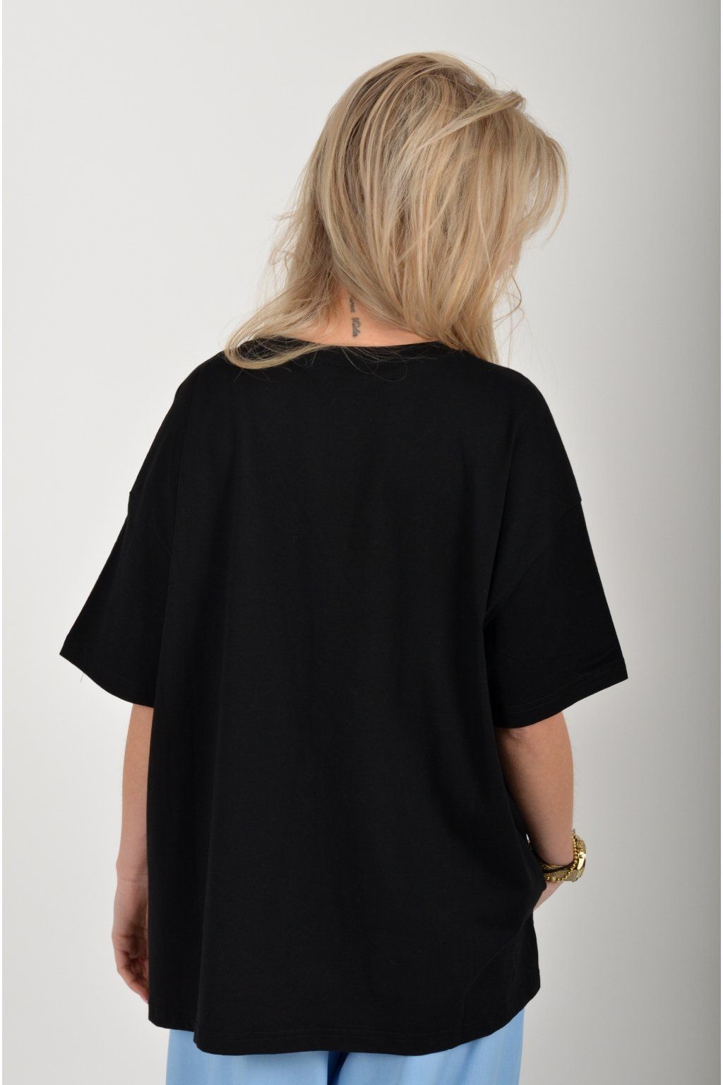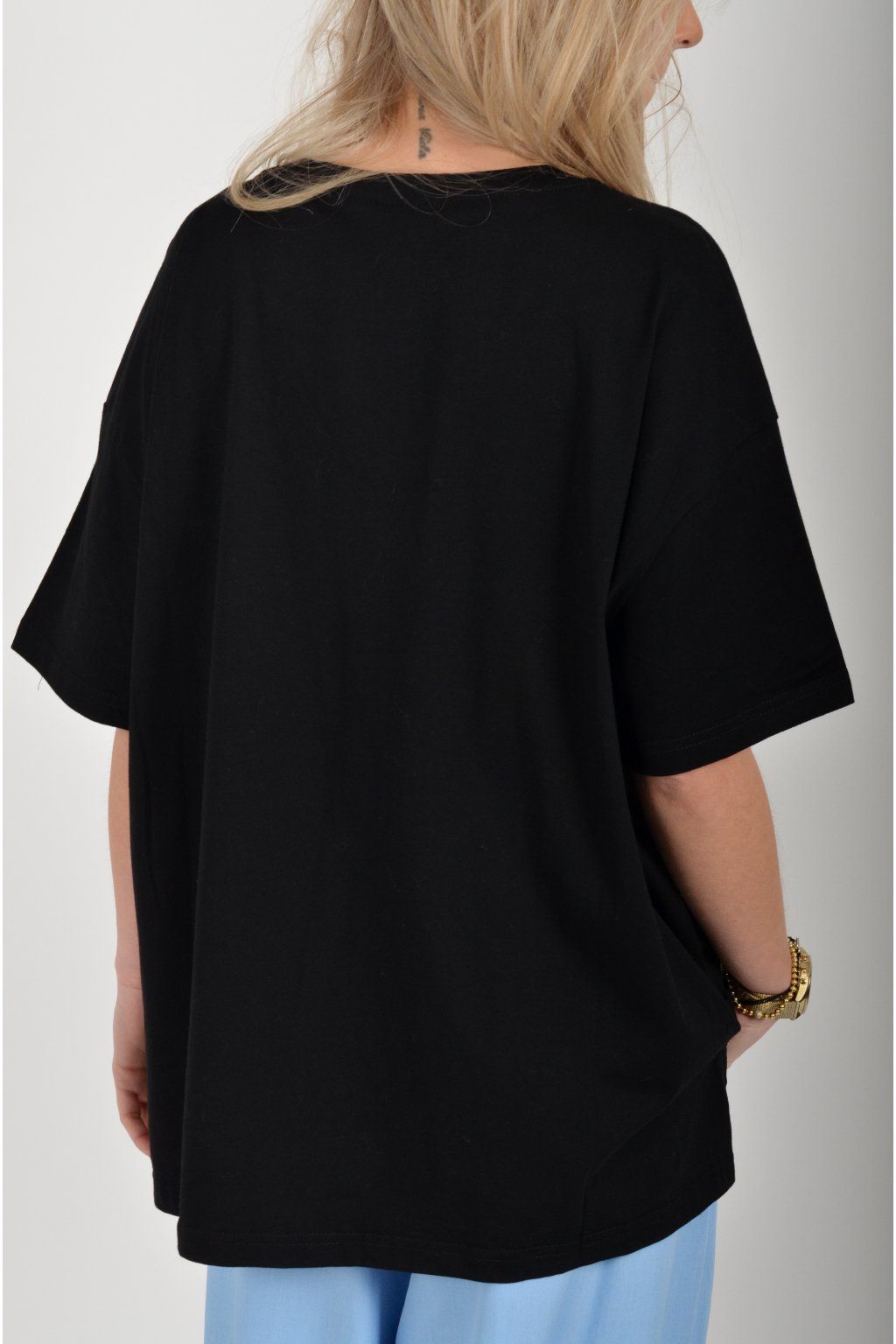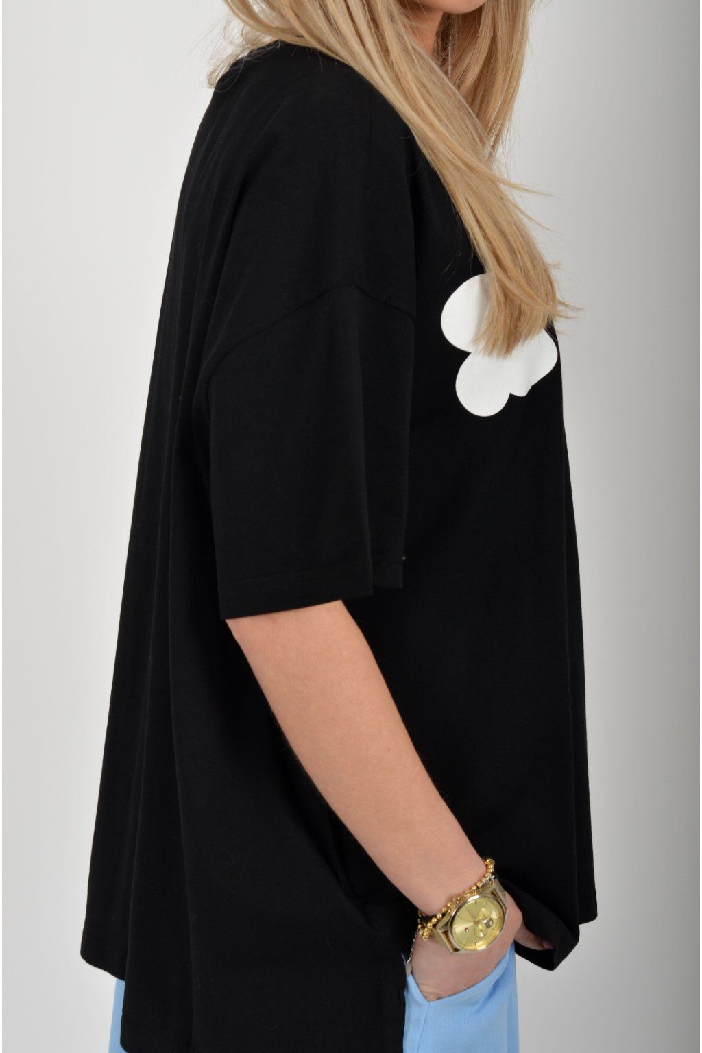 Atypické tričko s krátkým rukávem potiskem vyšívaným vzorem v přední části. Tričko je vyrobené z velice příjemné bavlny a na bocích má rozparky. Zadní část trička je delší než přední.