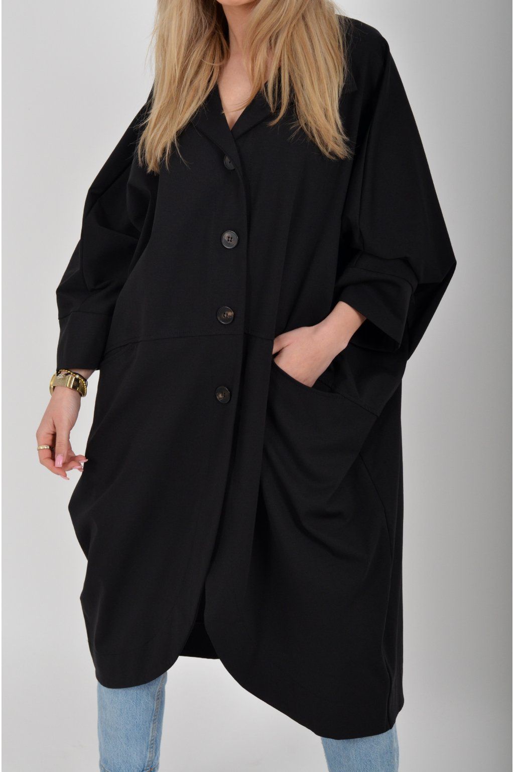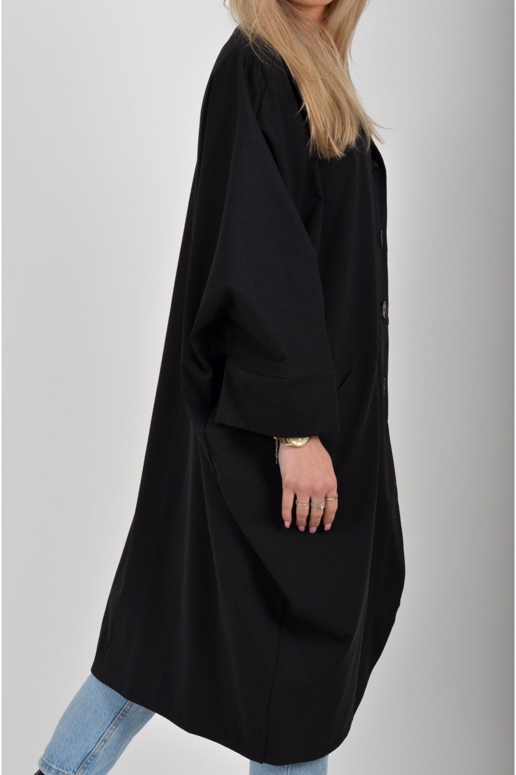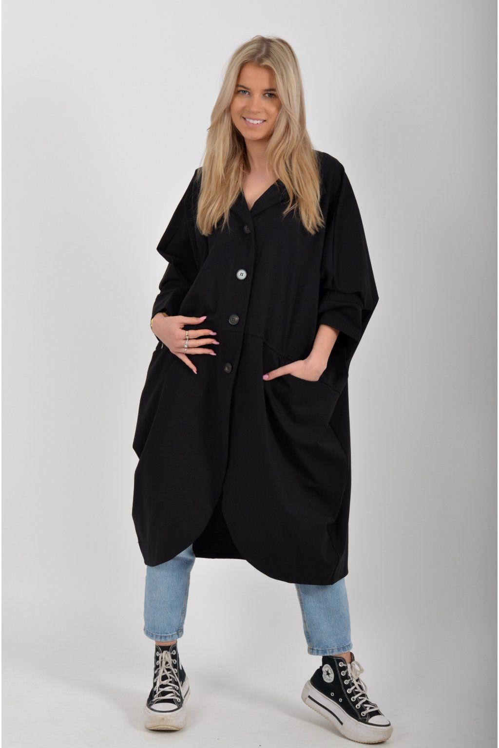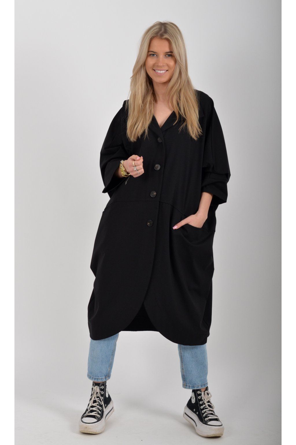 Pohodlný oversize jarní kabátek ušitý z pružného příjemného materiálu. Kabátek má límec, zapínaní na knoflíky a je balónového střihu. V přední části má kapsy a rukávy jsou tříčtvrteční.
