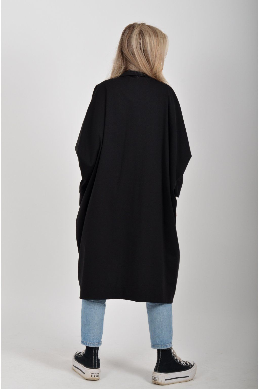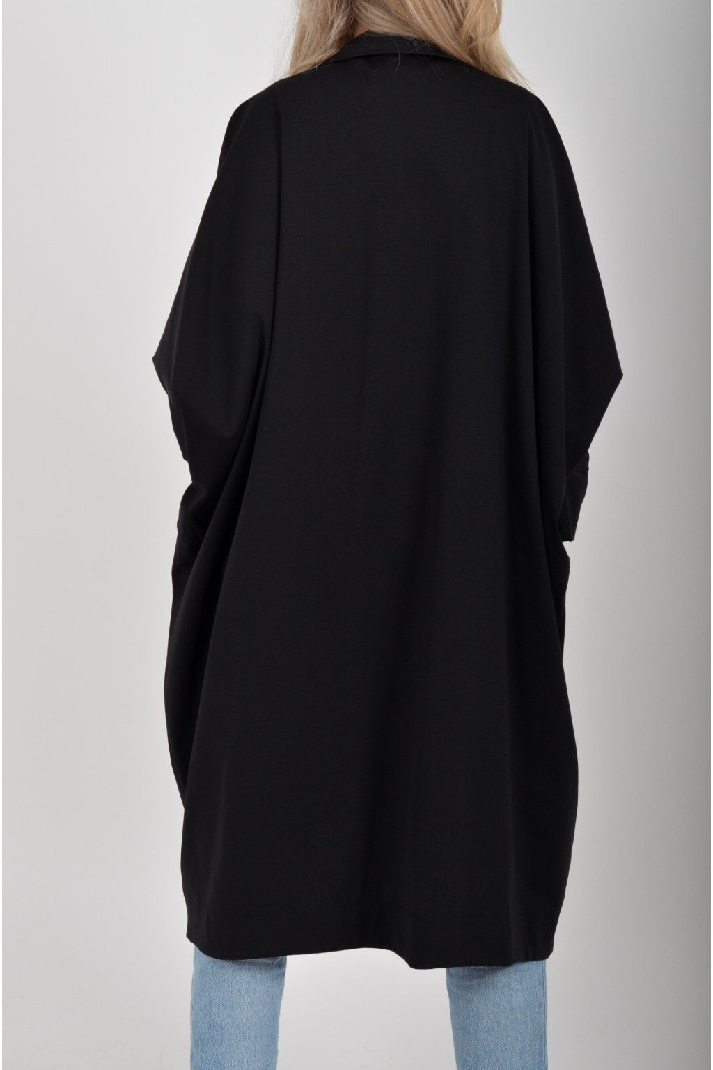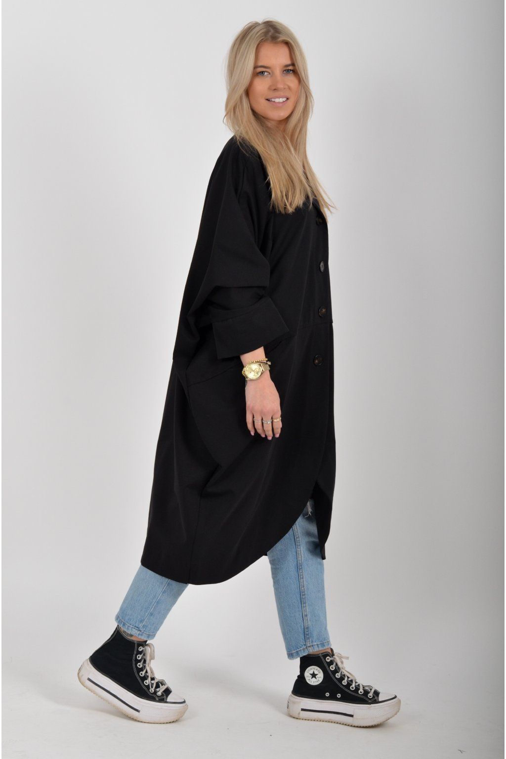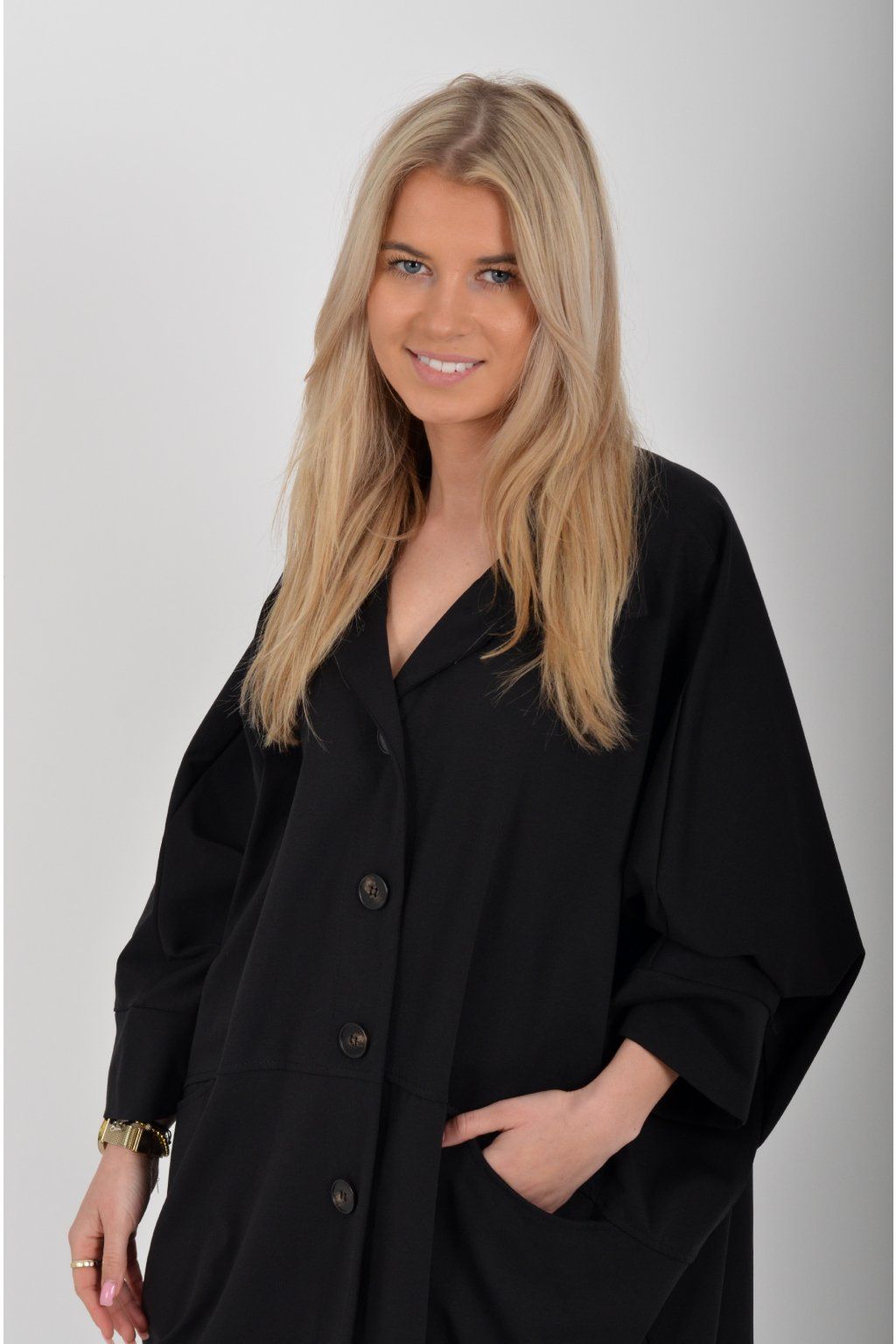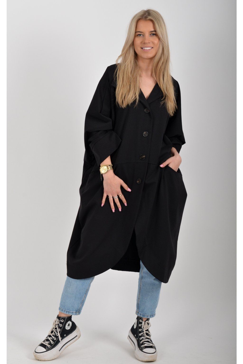 Pohodlný oversize jarní kabátek ušitý z pružného příjemného materiálu. Kabátek má límec, zapínaní na knoflíky a je balónového střihu. V přední části má kapsy a rukávy jsou tříčtvrteční.