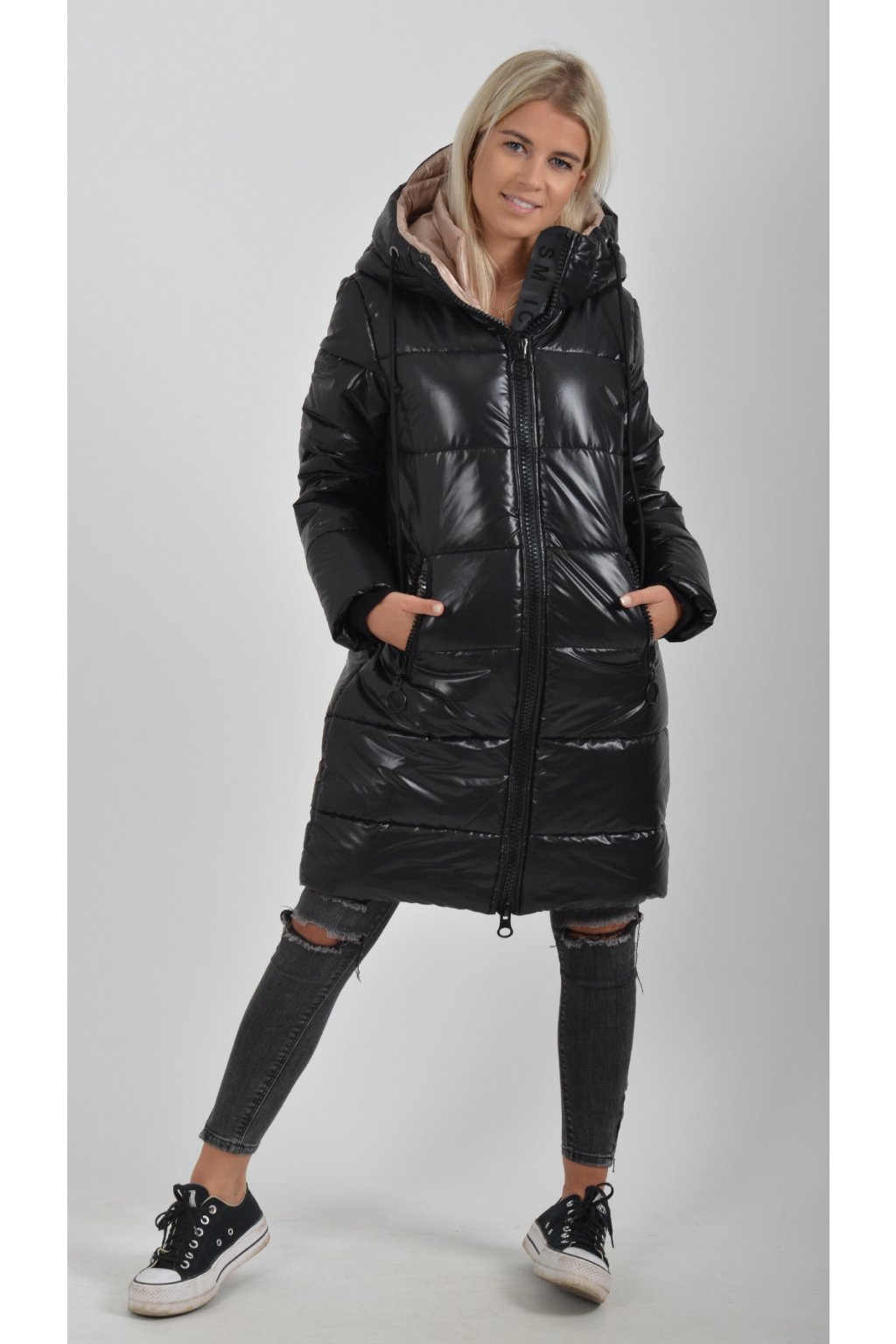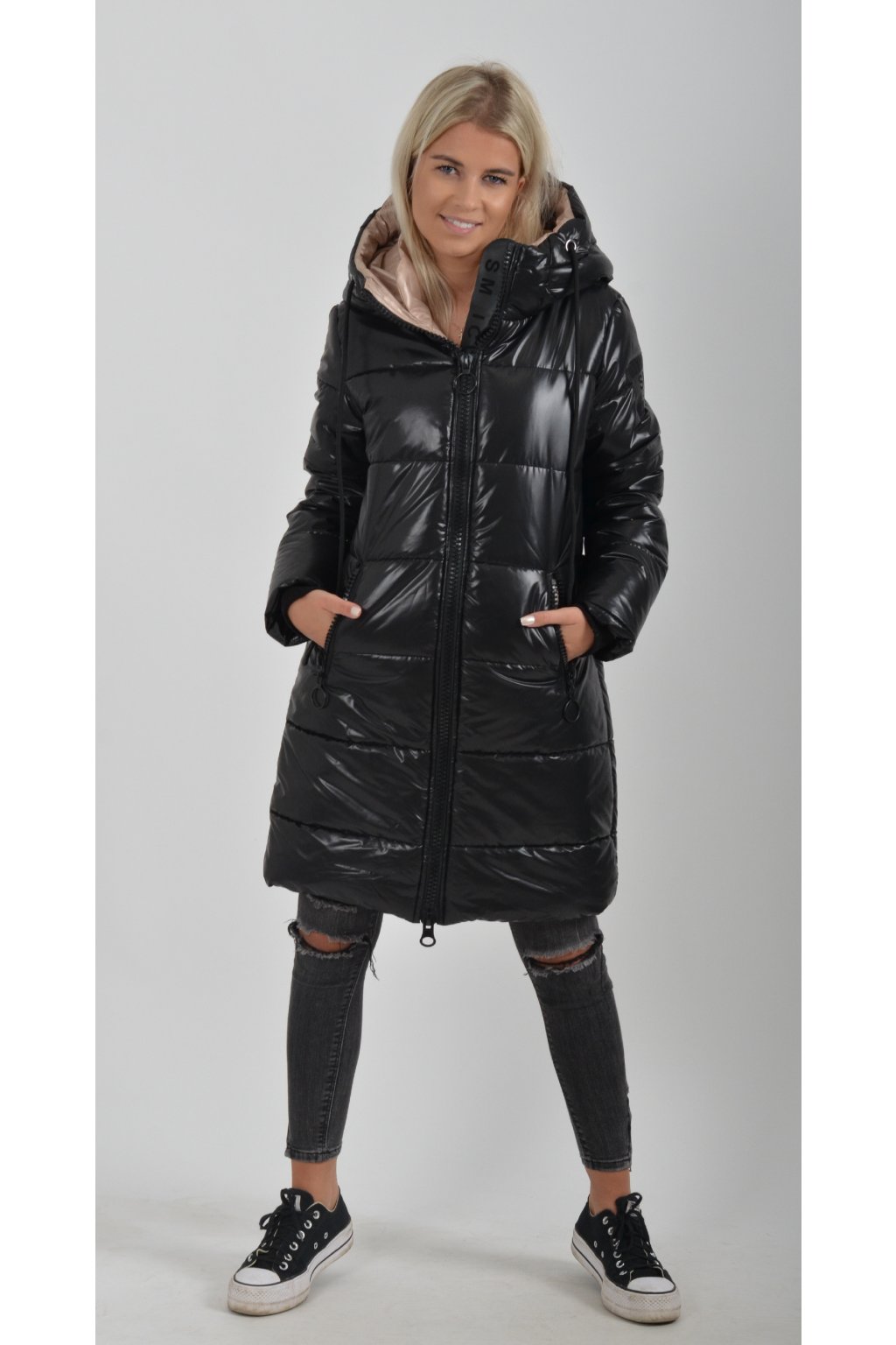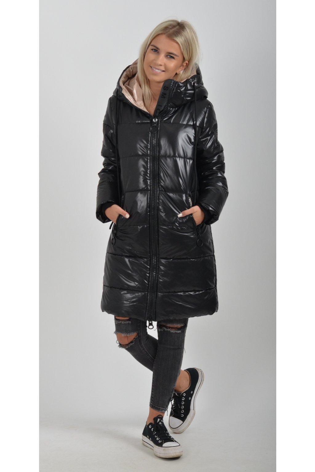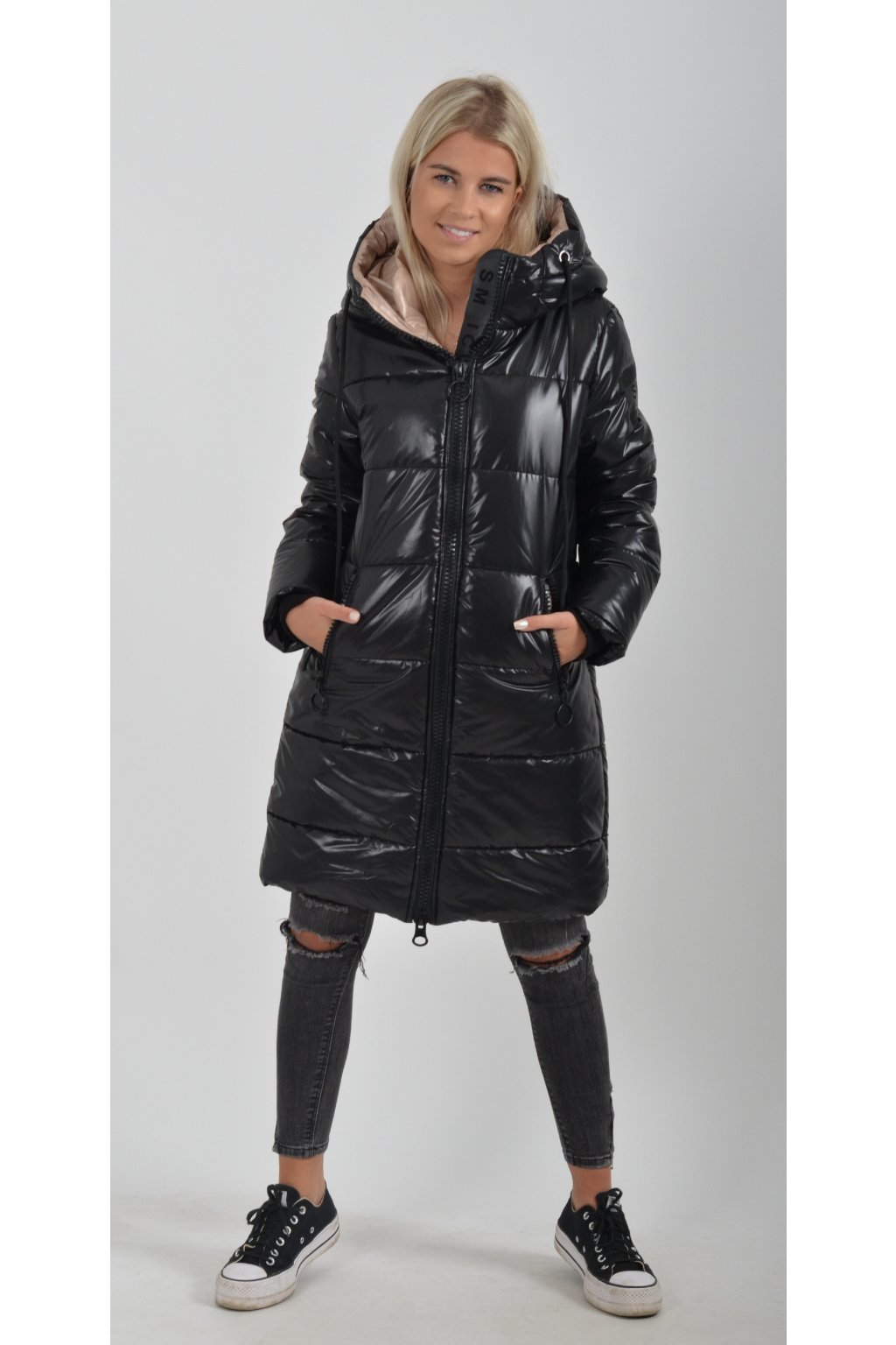 Prošívaný zimní kabát rovného střihu s kapucí a kapsami v přední části. Zip u kabátu má dva jezdce. Je z příjemného a měkkého materiálu. Výplň bundy je duté vlákno.