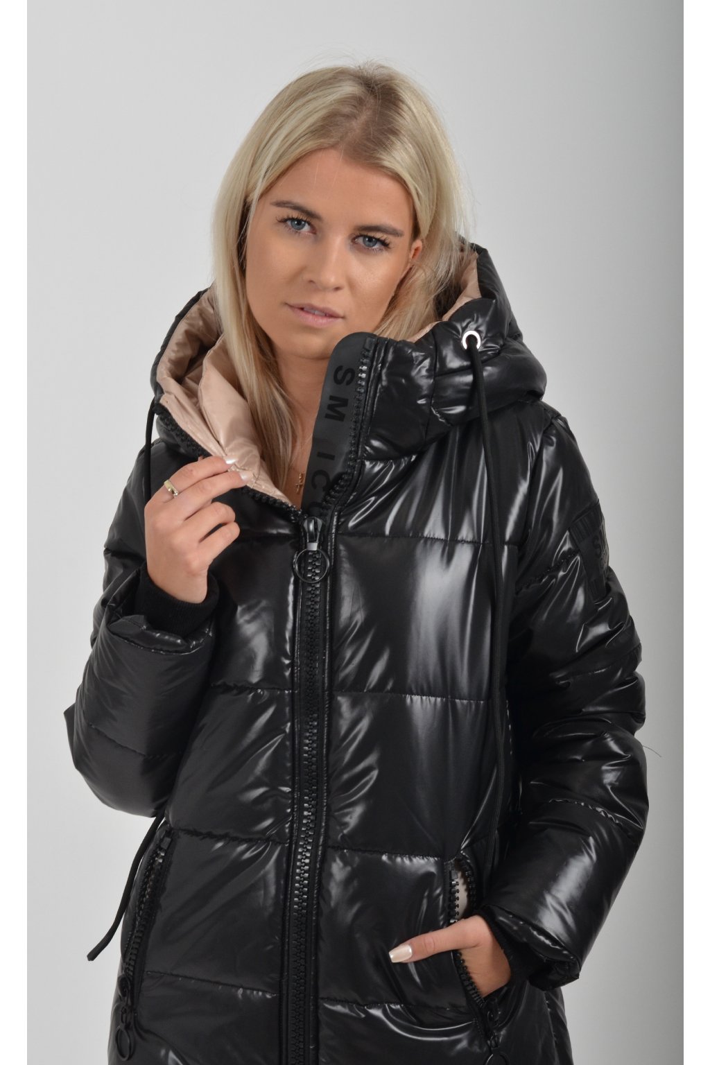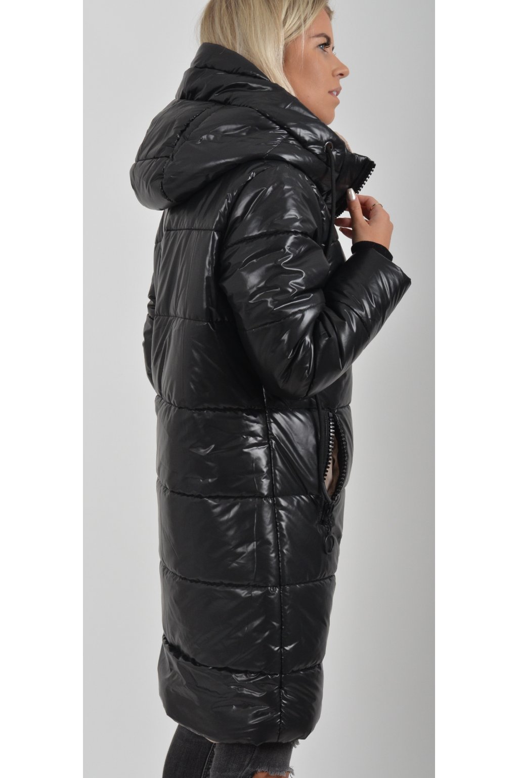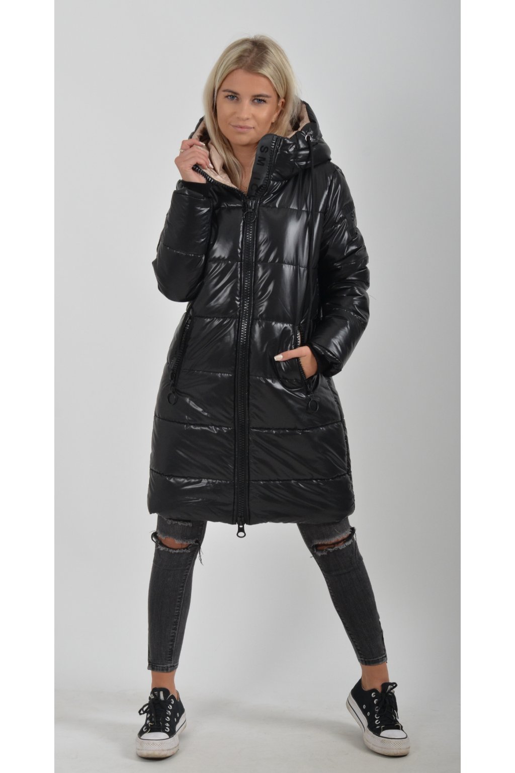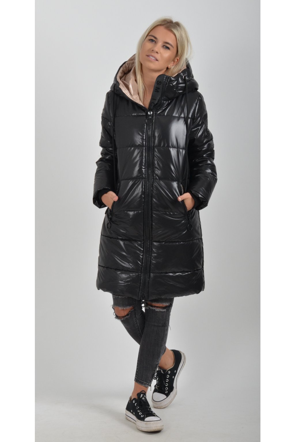 Prošívaný zimní kabát rovného střihu s kapucí a kapsami v přední části. Zip u kabátu má dva jezdce. Je z příjemného a měkkého materiálu. Výplň bundy je duté vlákno.