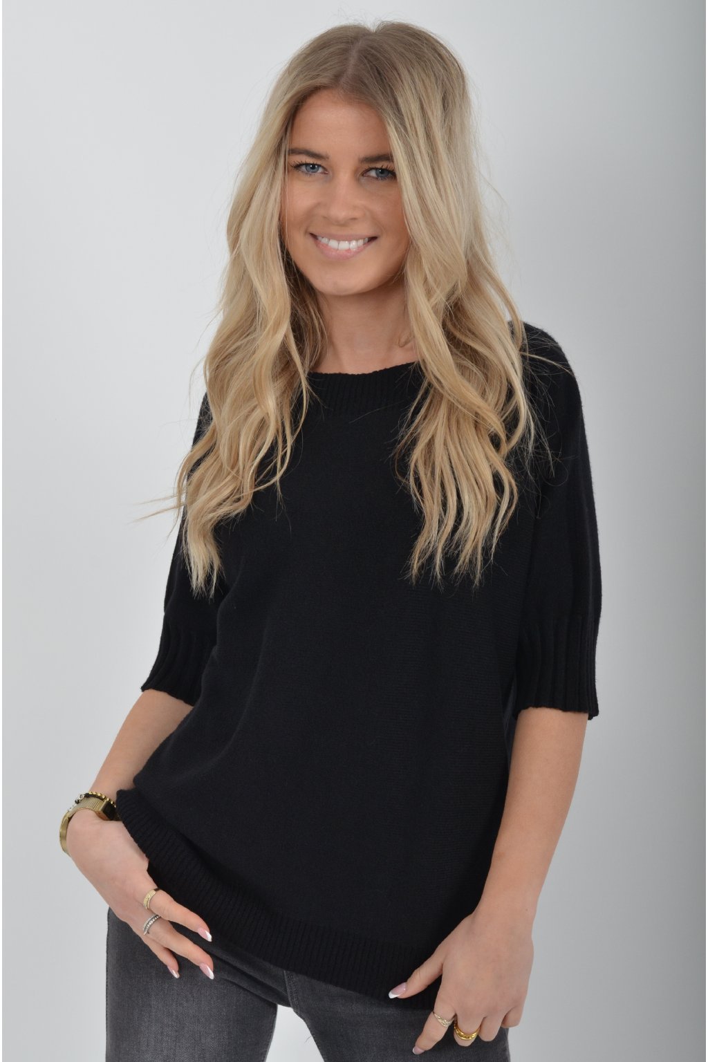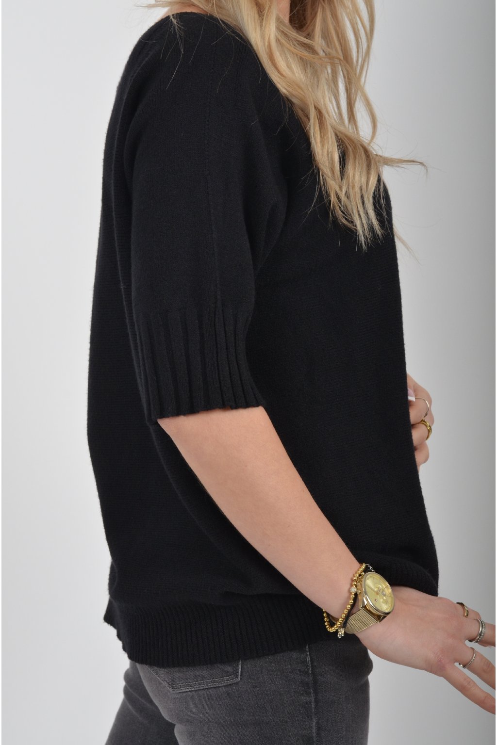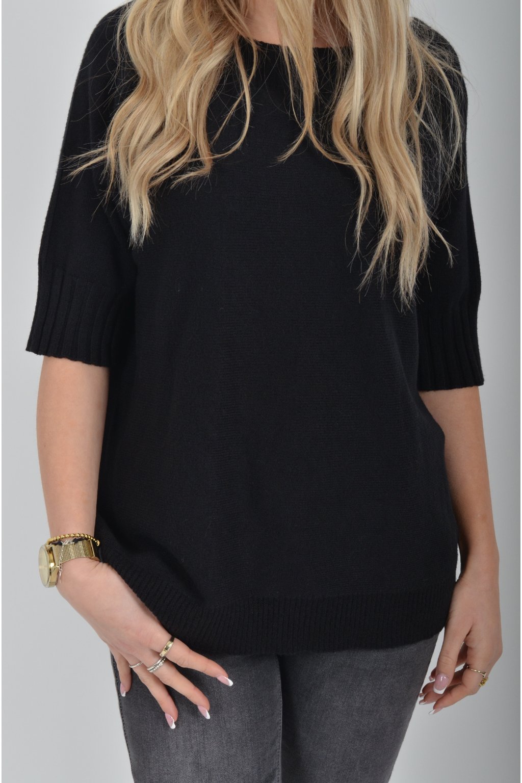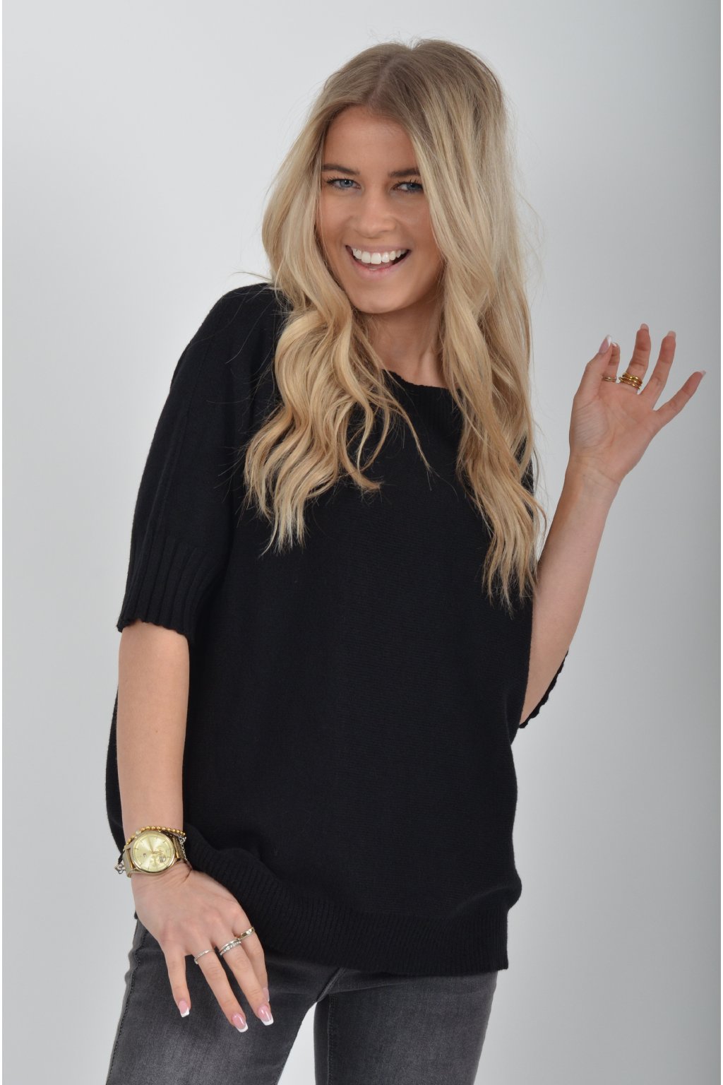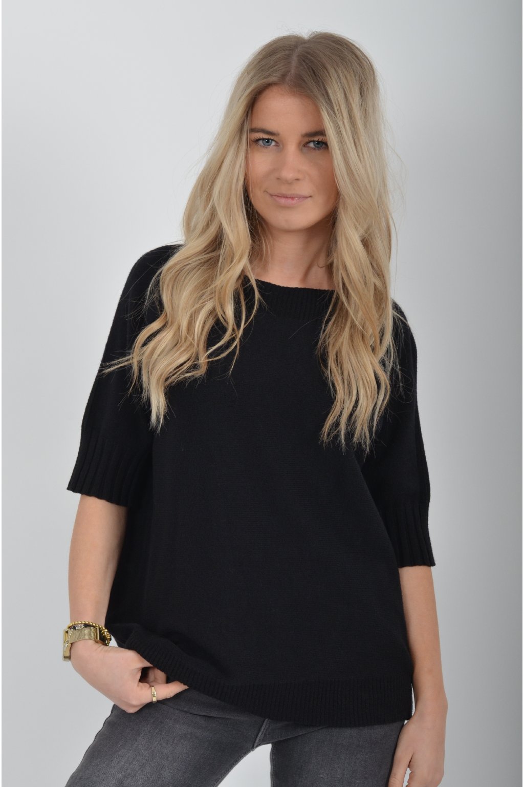 Svetr s krátkým rukávem vyrobený z odlehčeného a nekousavého materiálu.