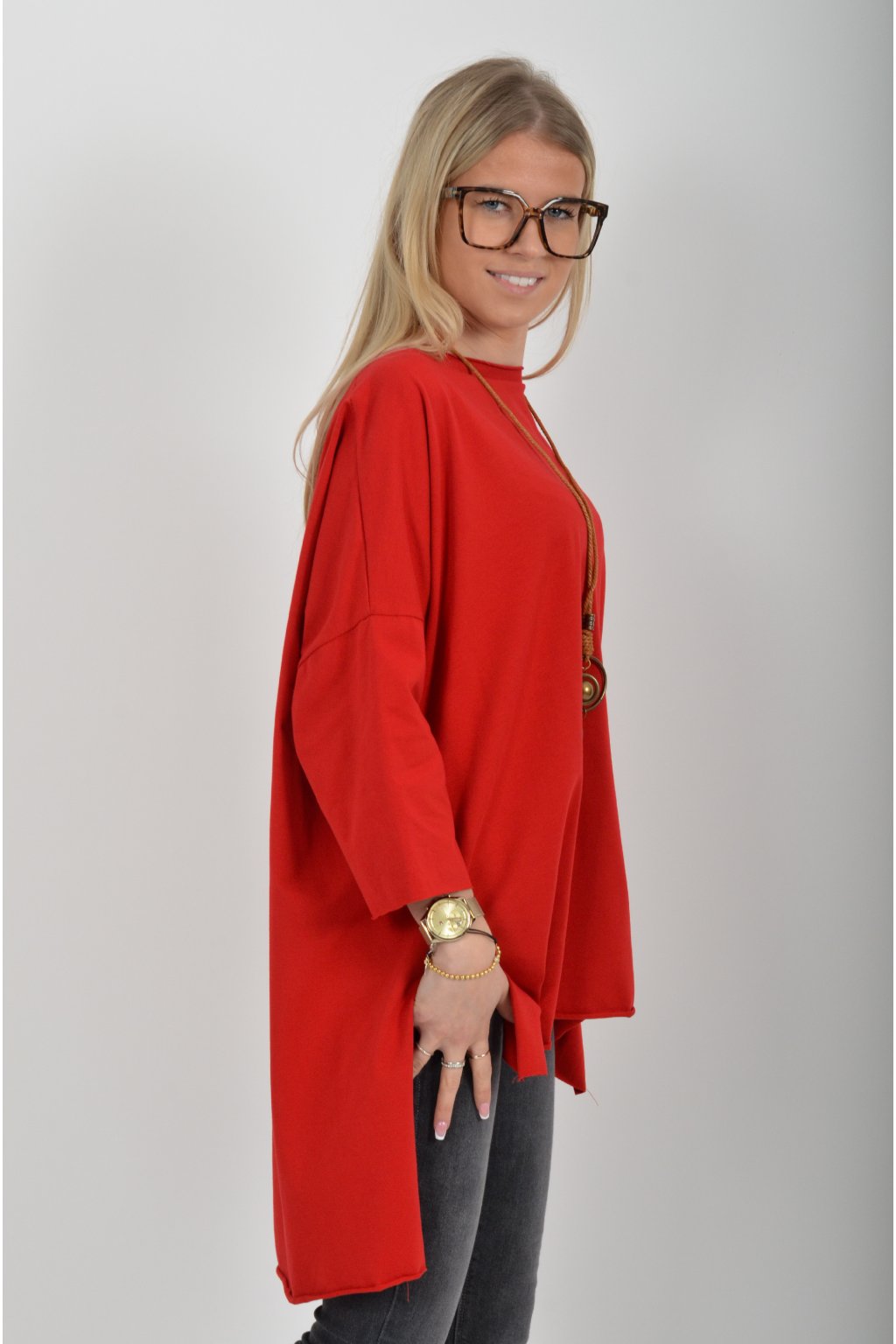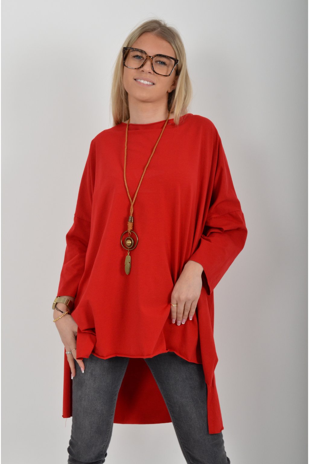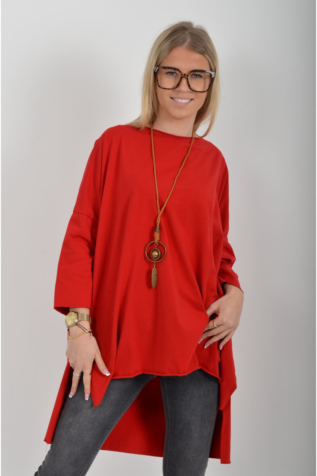 Jednobarevné oversize tričko s 3/4rukávem vyrobené z velice lehké, měkké a příjemné bavlny. Zadní část trička je delší než přední. K tričku je náhrdelník jako dárek.