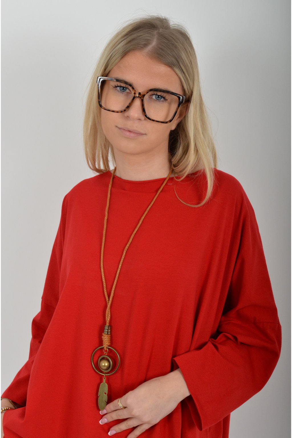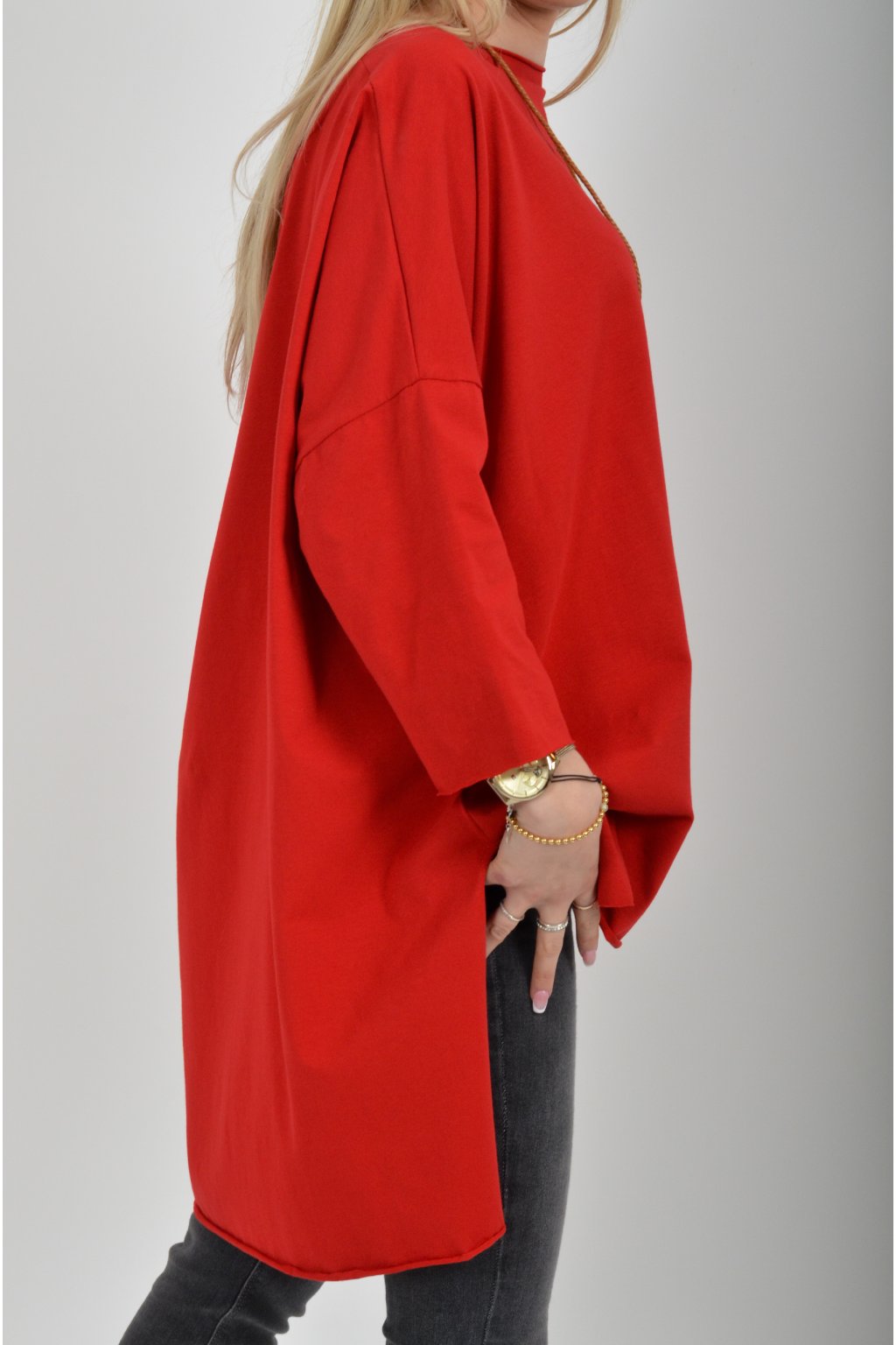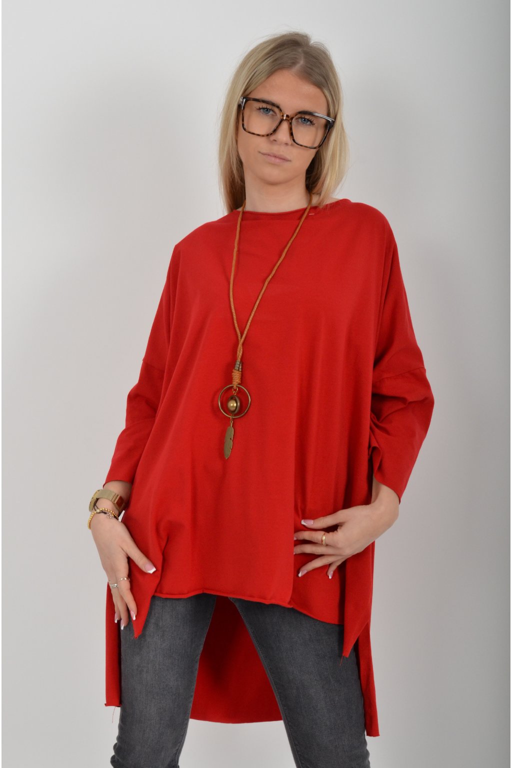 Jednobarevné oversize tričko s 3/4rukávem vyrobené z velice lehké, měkké a příjemné bavlny. Zadní část trička je delší než přední. K tričku je náhrdelník jako dárek.