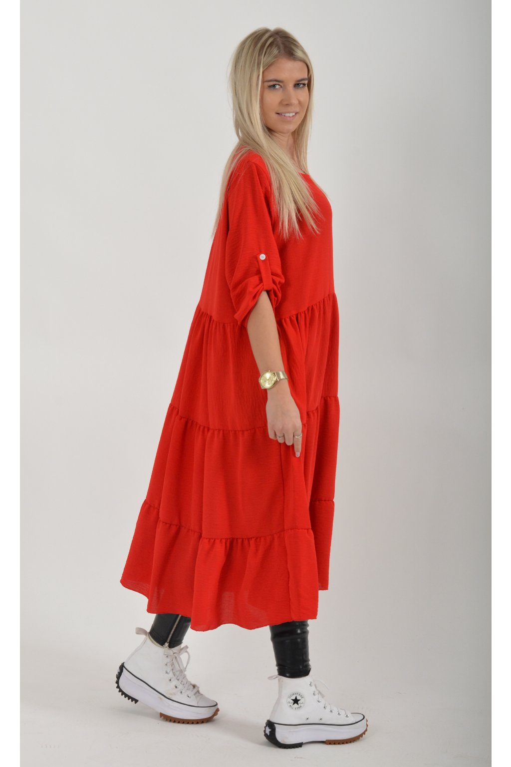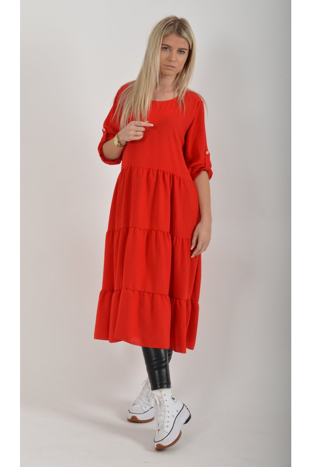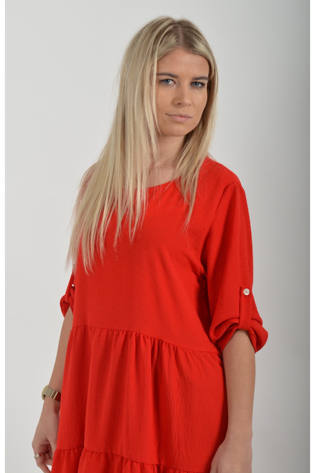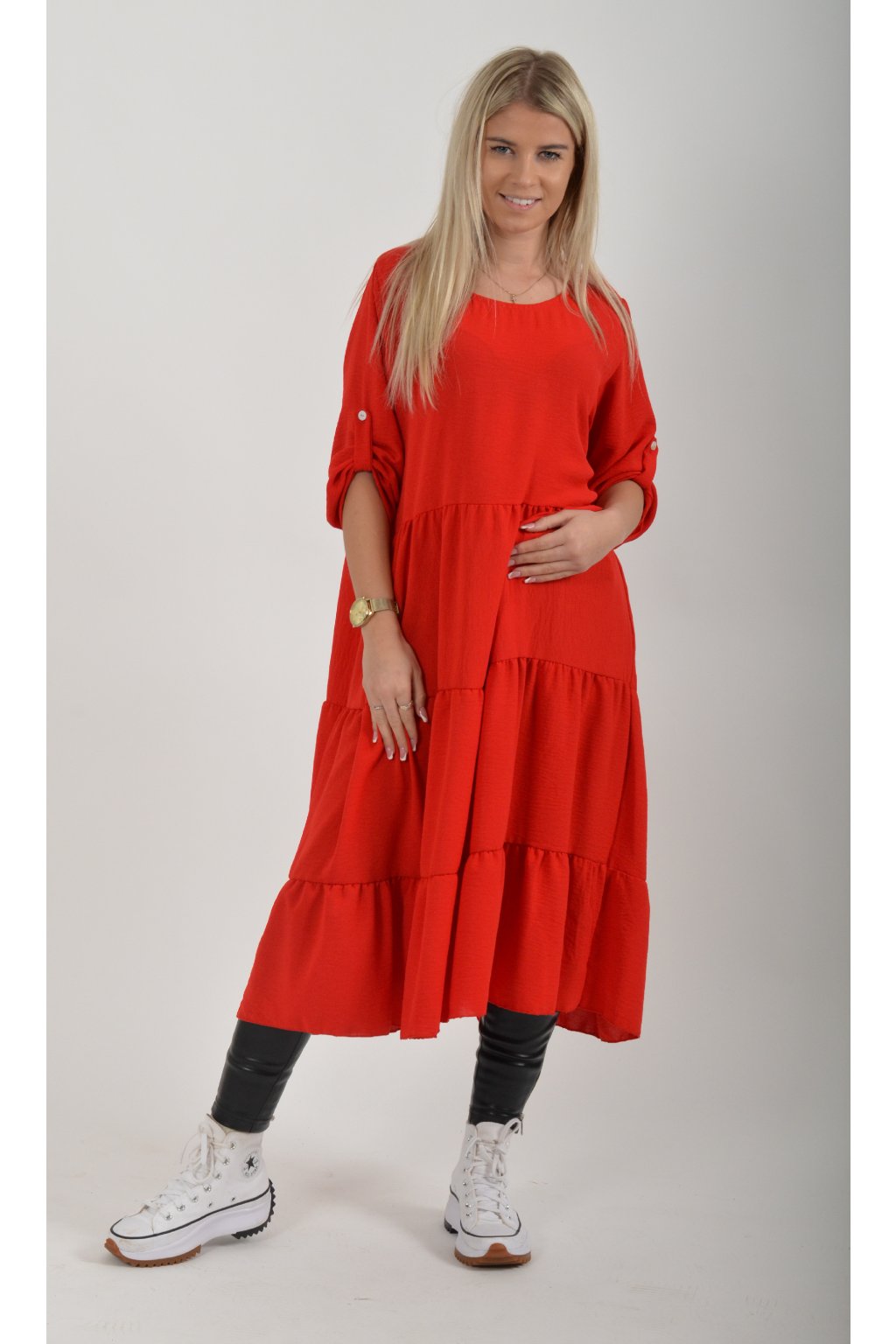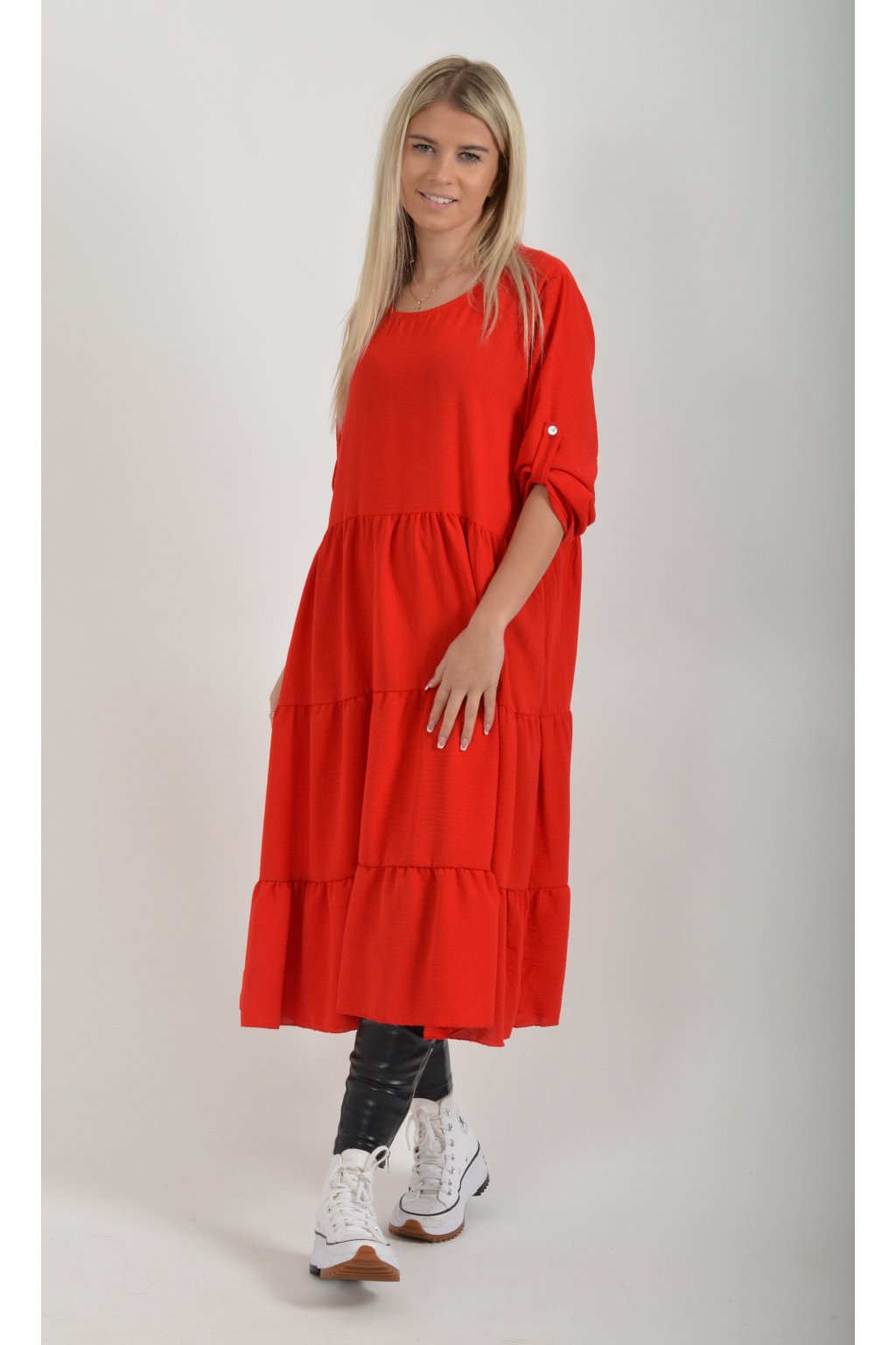 Jednobarevné šaty s tříčtvrtečním rukávem, který lze pomocí knoflíku jednoduše zkrátit. Mají áčkový střih.