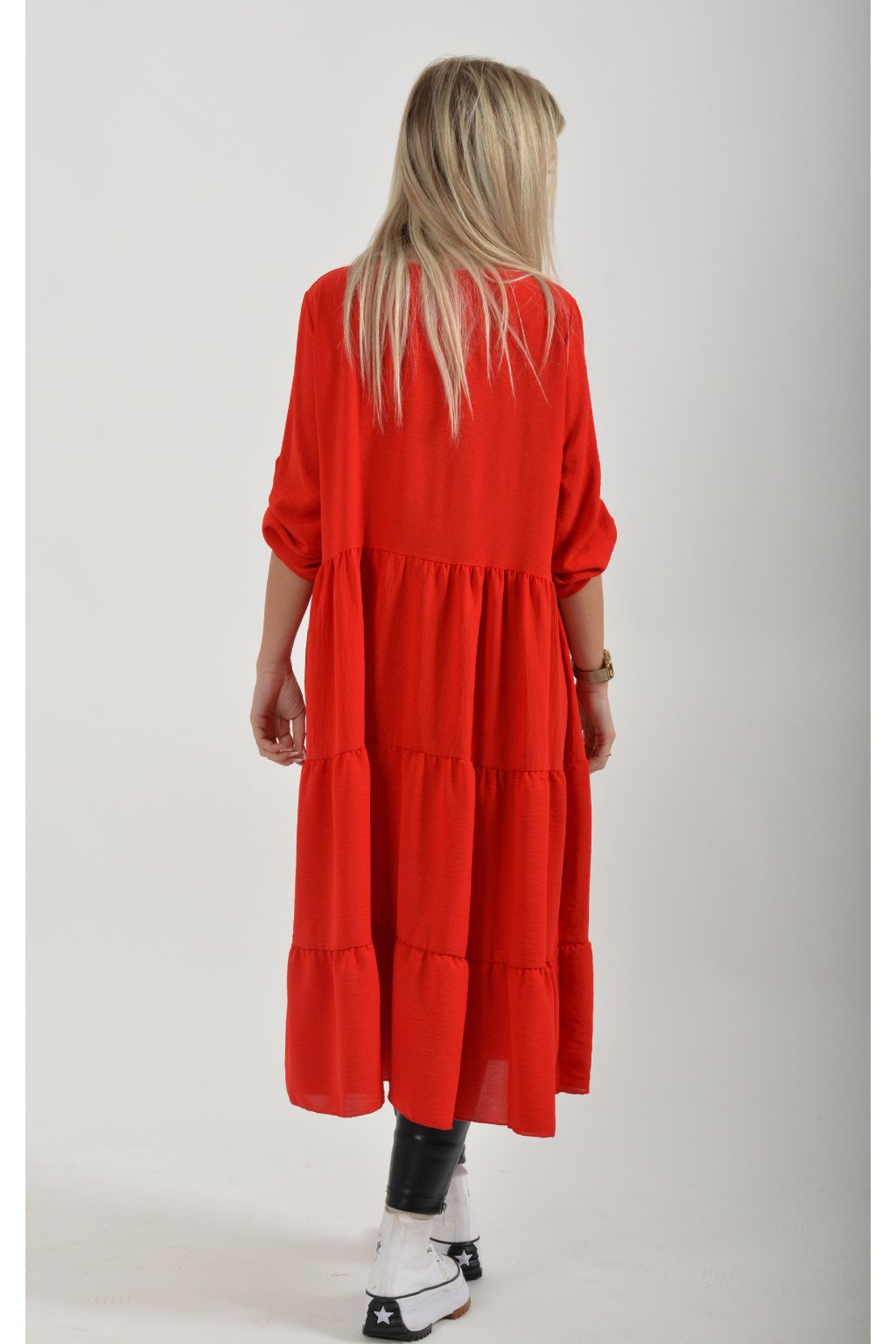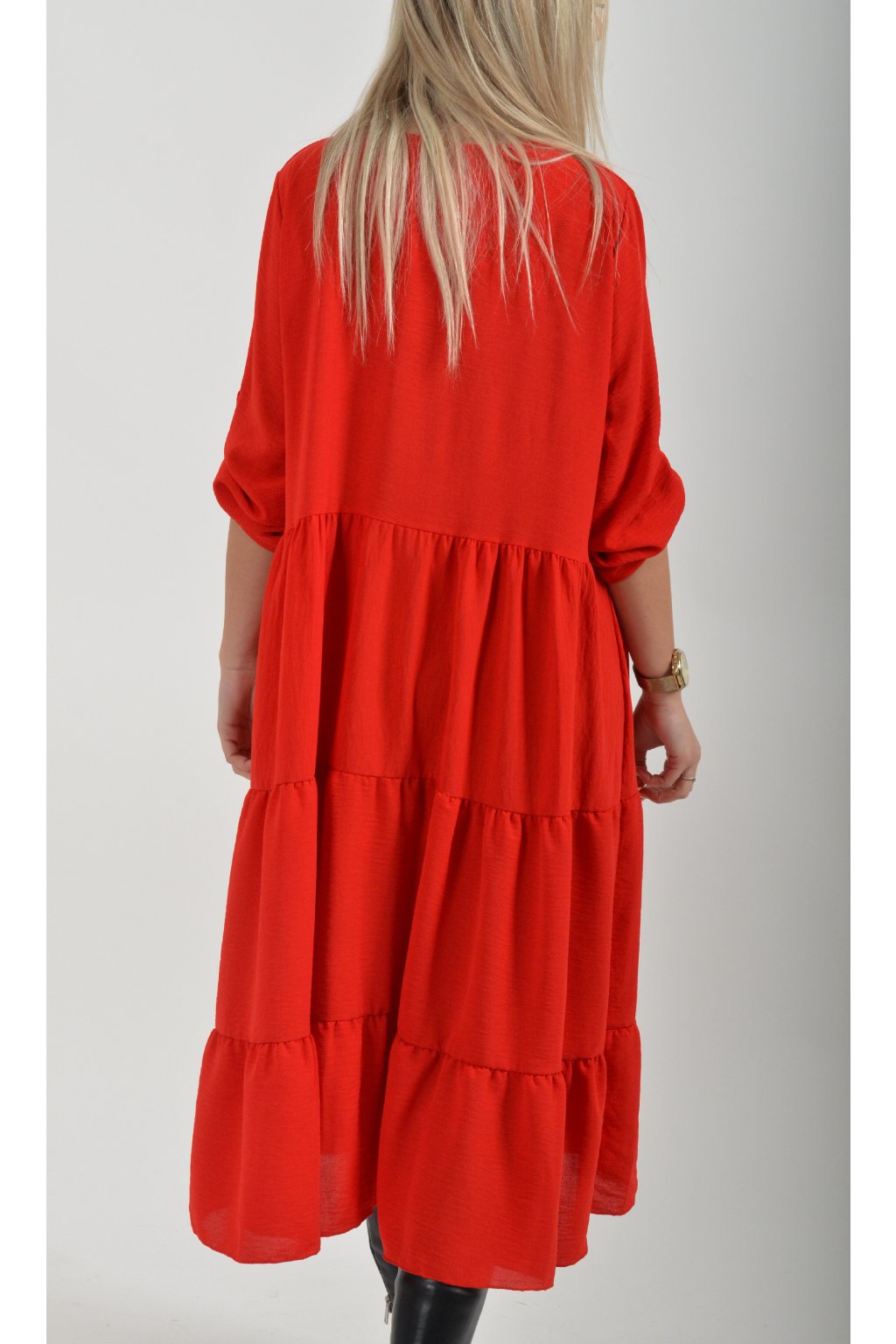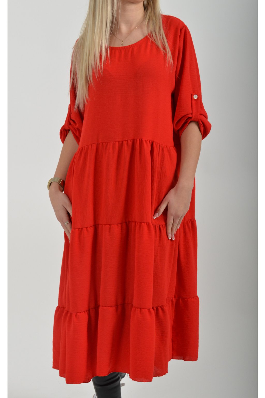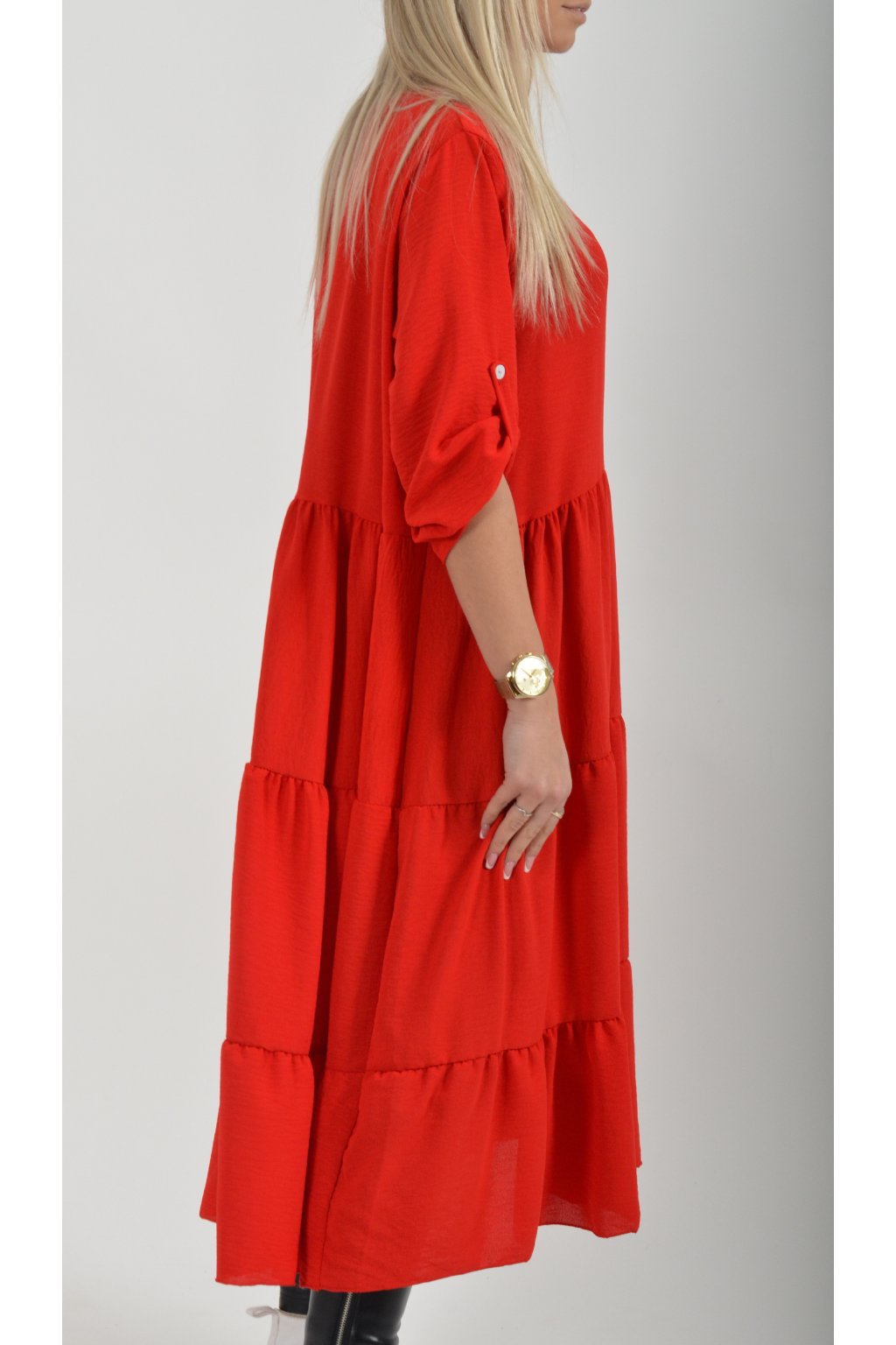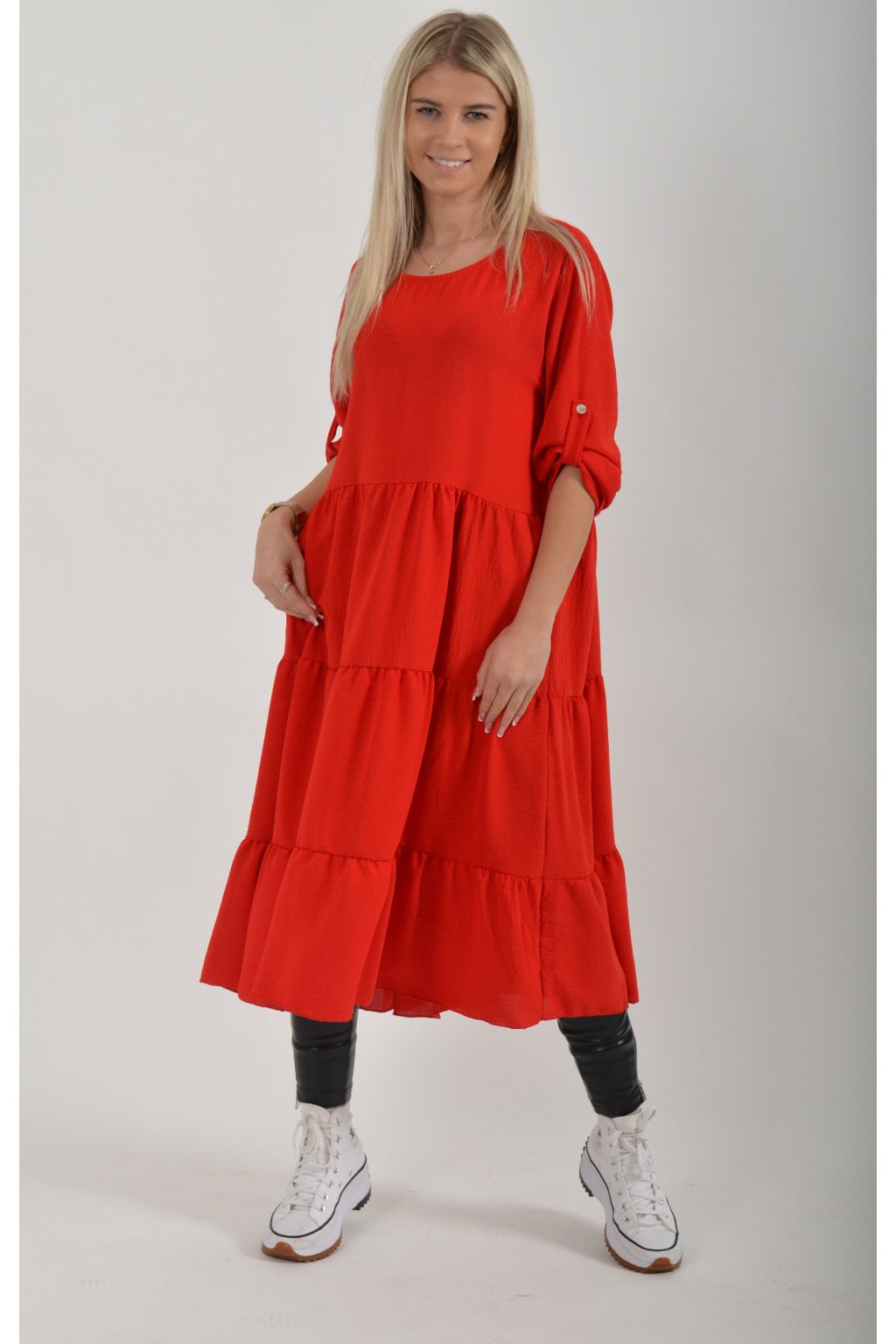 Jednobarevné šaty s tříčtvrtečním rukávem, který lze pomocí knoflíku jednoduše zkrátit. Mají áčkový střih.