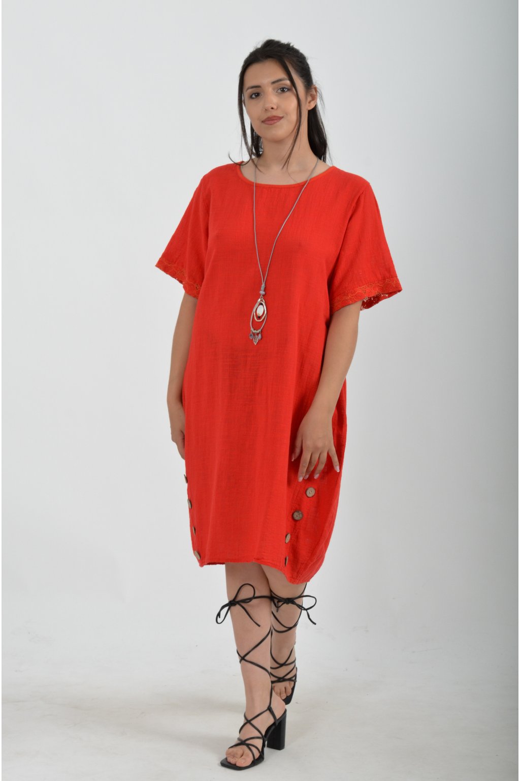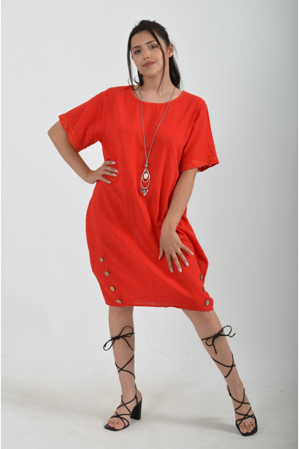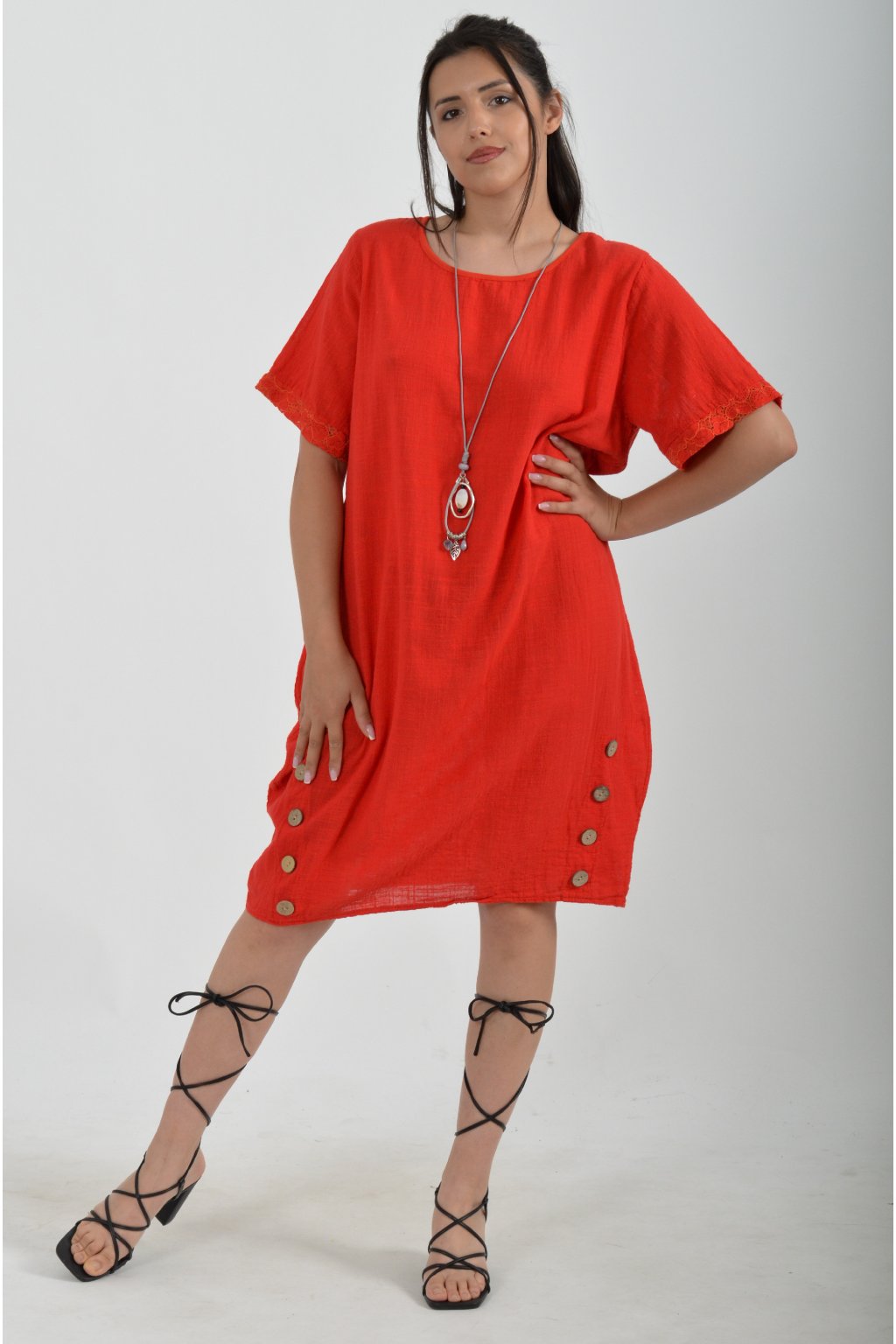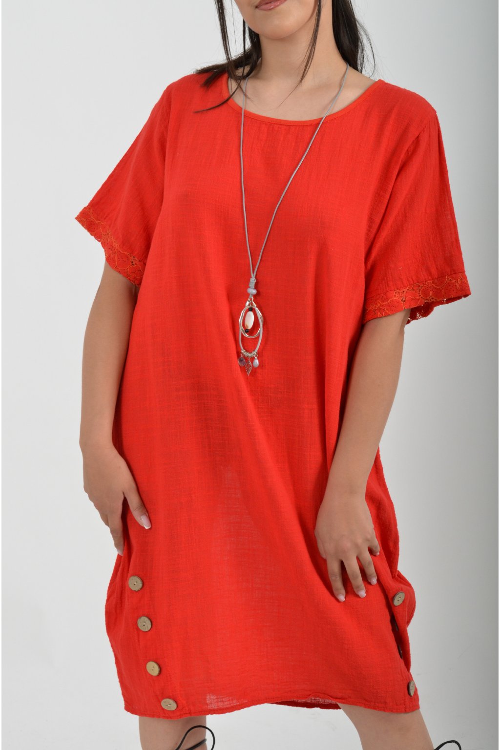 Bavlněné šaty s krátkým rukávem vyrobené z velice příjemné a jemné bavlny. V přední části mají ozdobné knoflíky, součástí šatů je náhrdelník jako dárek. Šaty nemají kapsy a jsou vhodné na každodenní letní nošení.