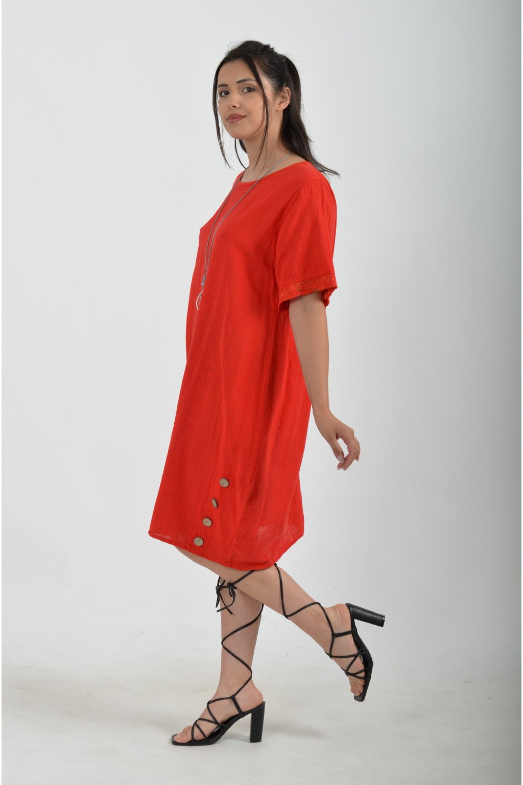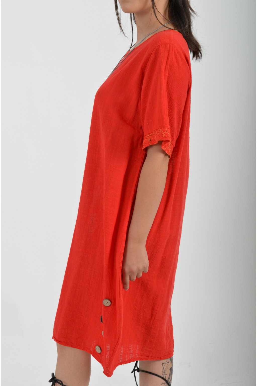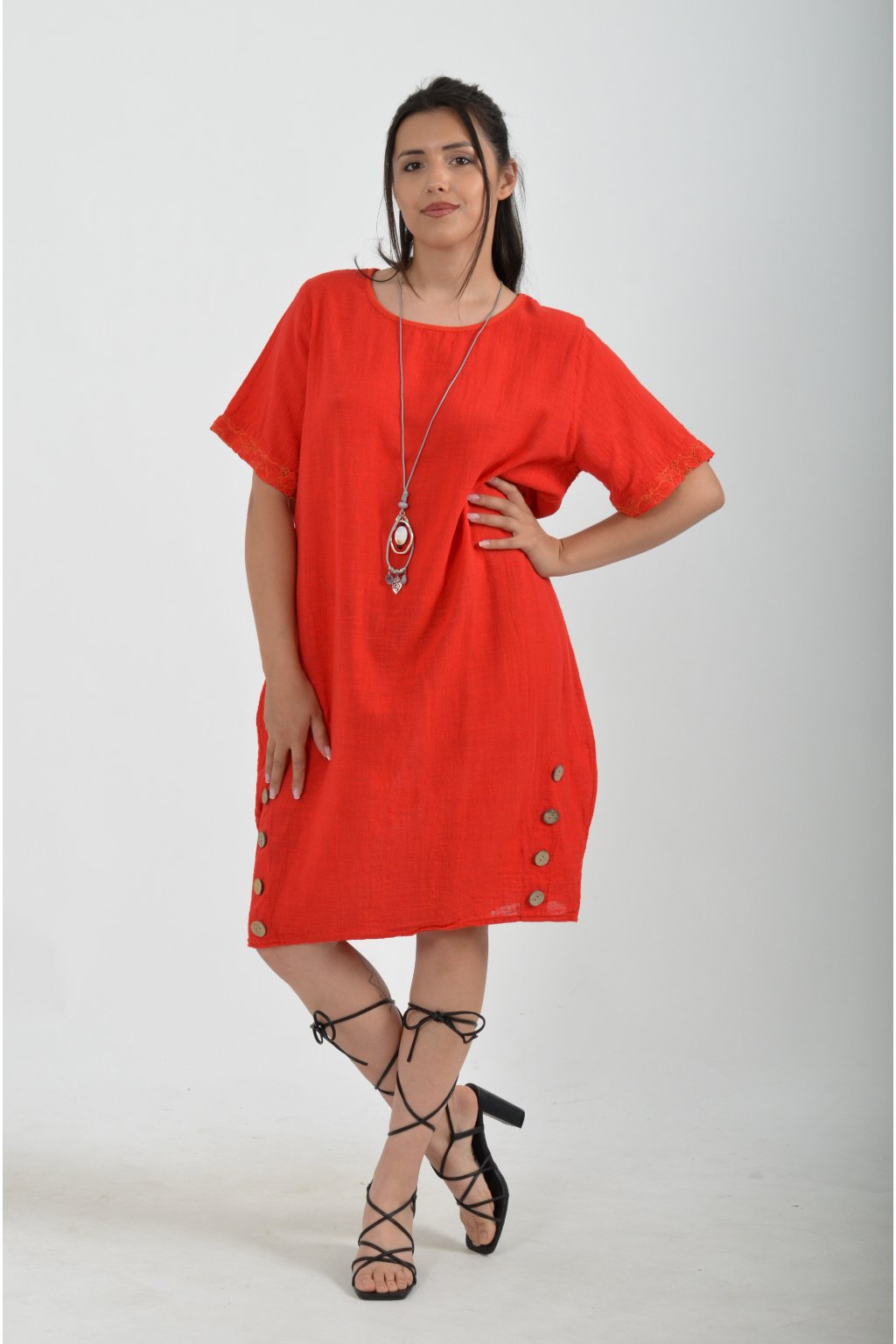 Bavlněné šaty s krátkým rukávem vyrobené z velice příjemné a jemné bavlny. V přední části mají ozdobné knoflíky, součástí šatů je náhrdelník jako dárek. Šaty nemají kapsy a jsou vhodné na každodenní letní nošení.