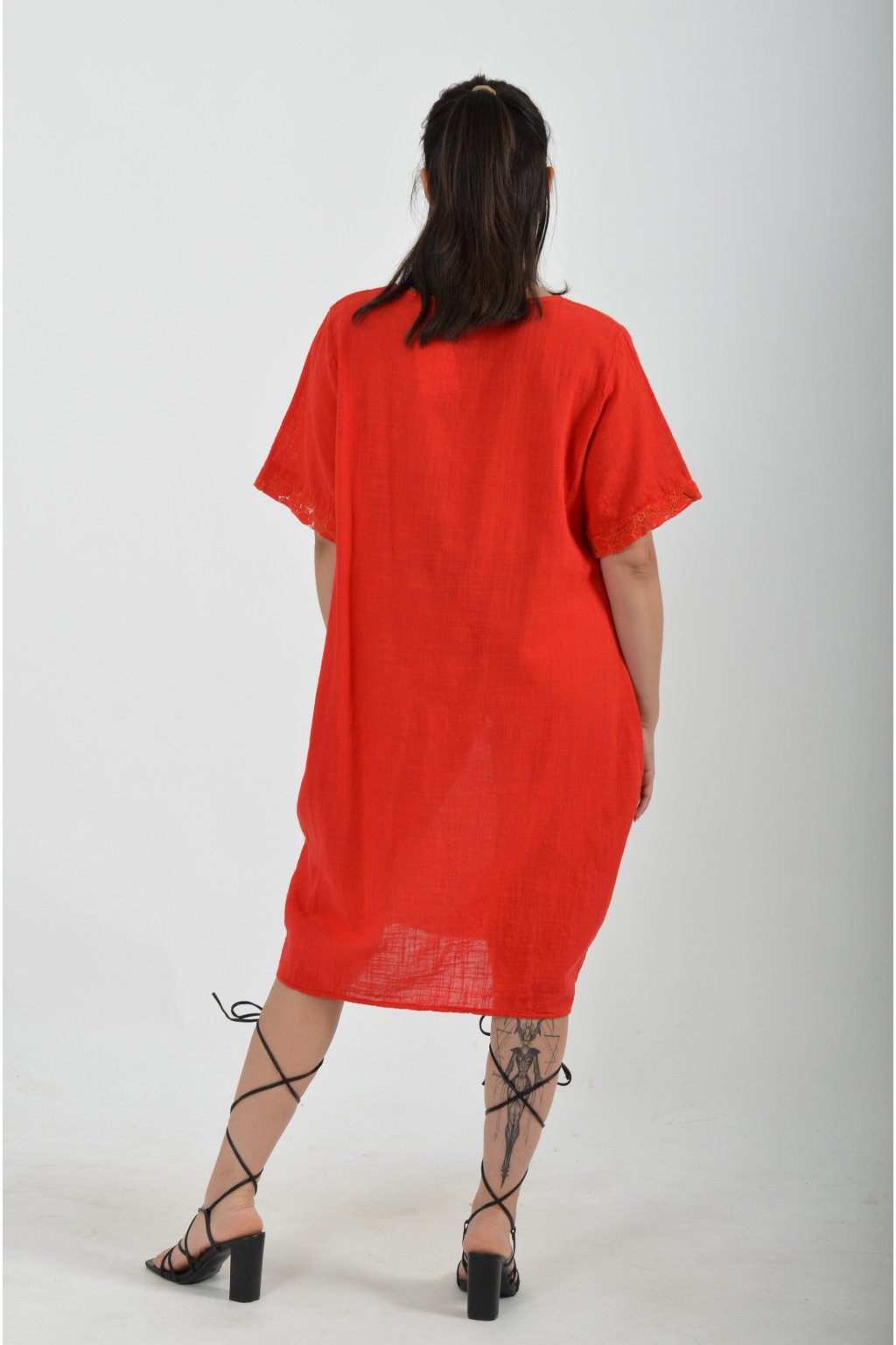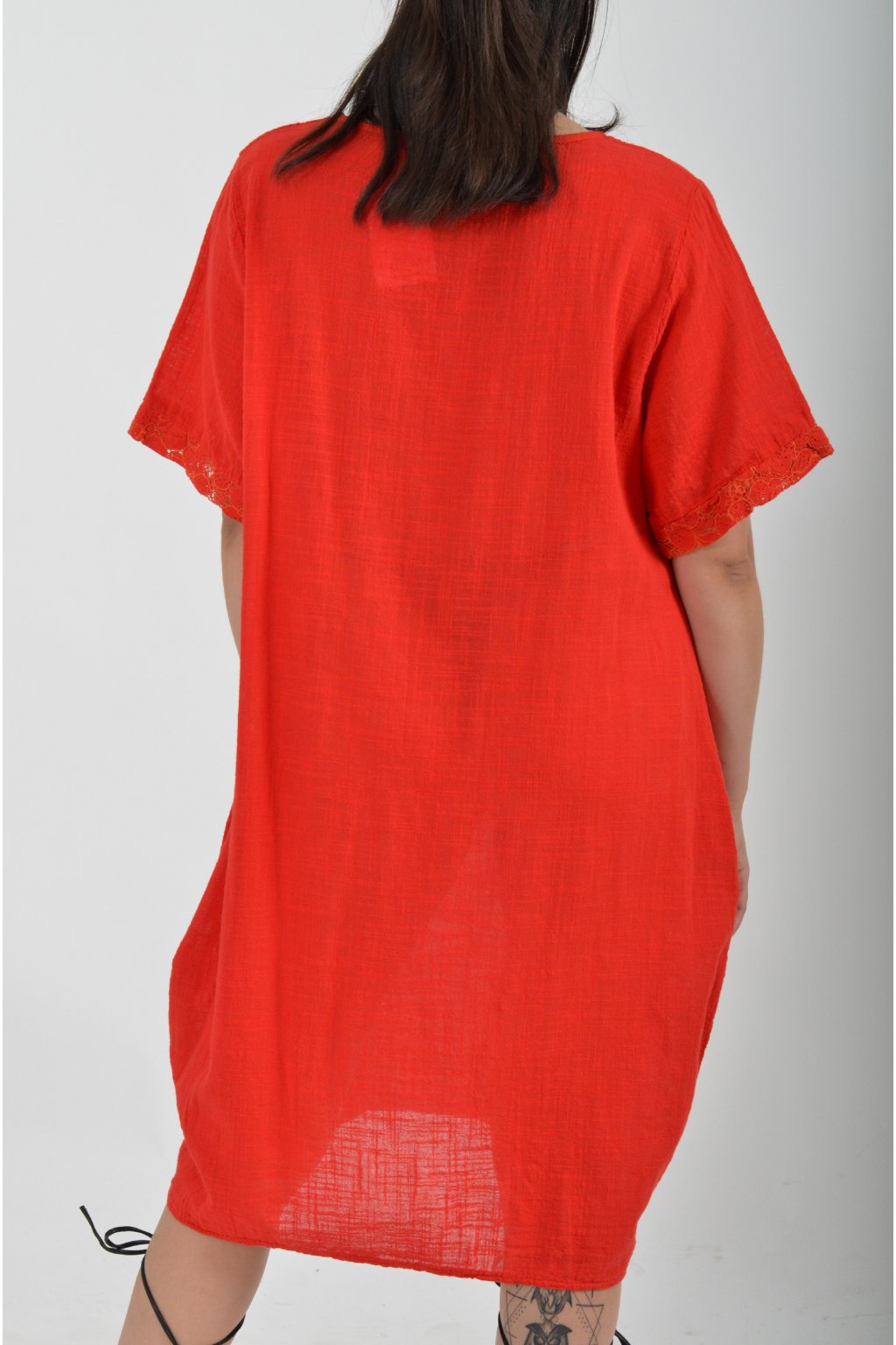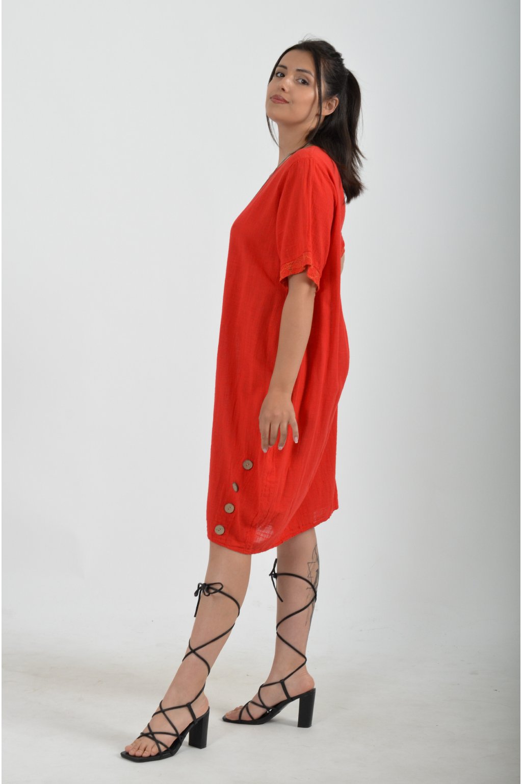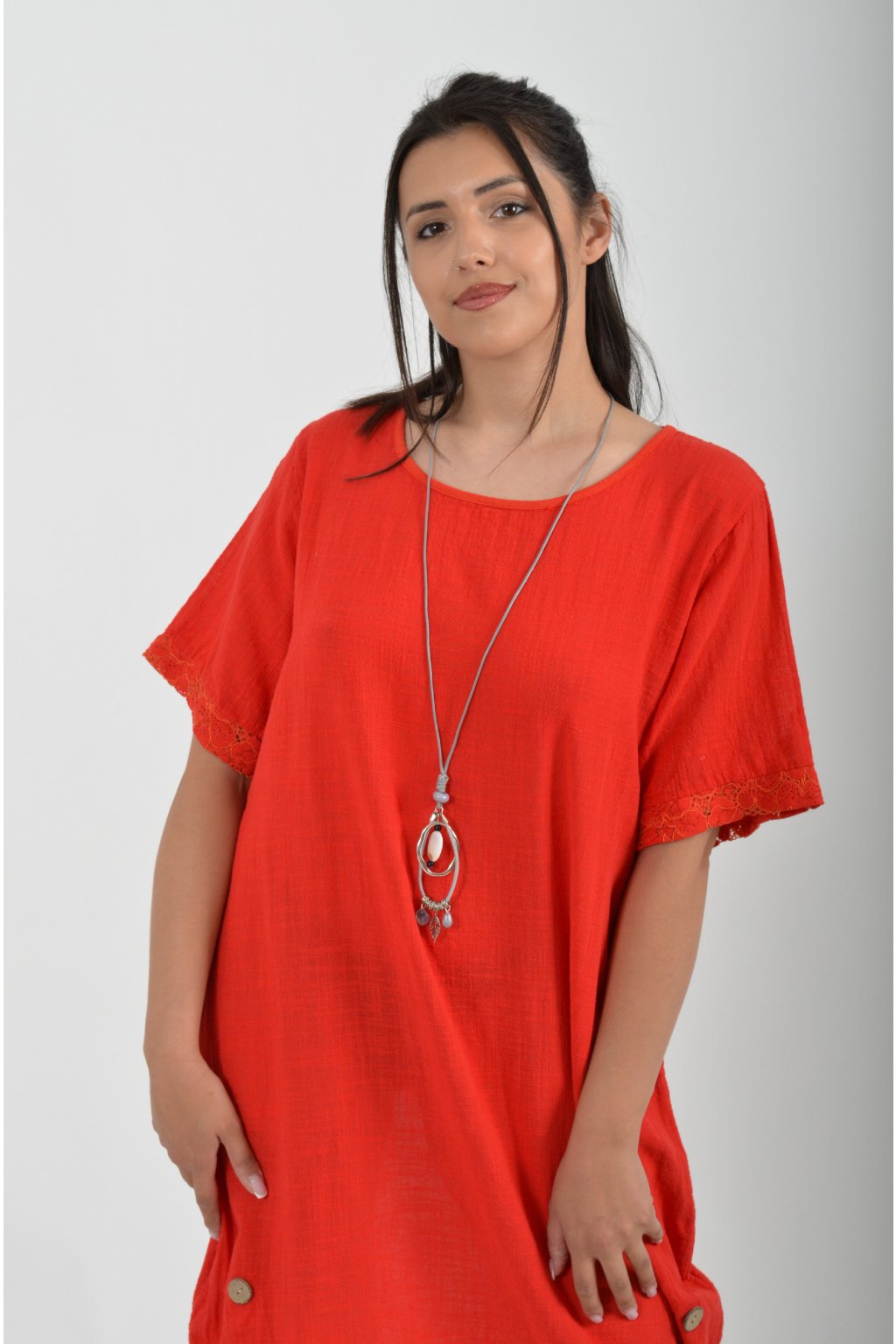 Bavlněné šaty s krátkým rukávem vyrobené z velice příjemné a jemné bavlny. V přední části mají ozdobné knoflíky, součástí šatů je náhrdelník jako dárek. Šaty nemají kapsy a jsou vhodné na každodenní letní nošení.